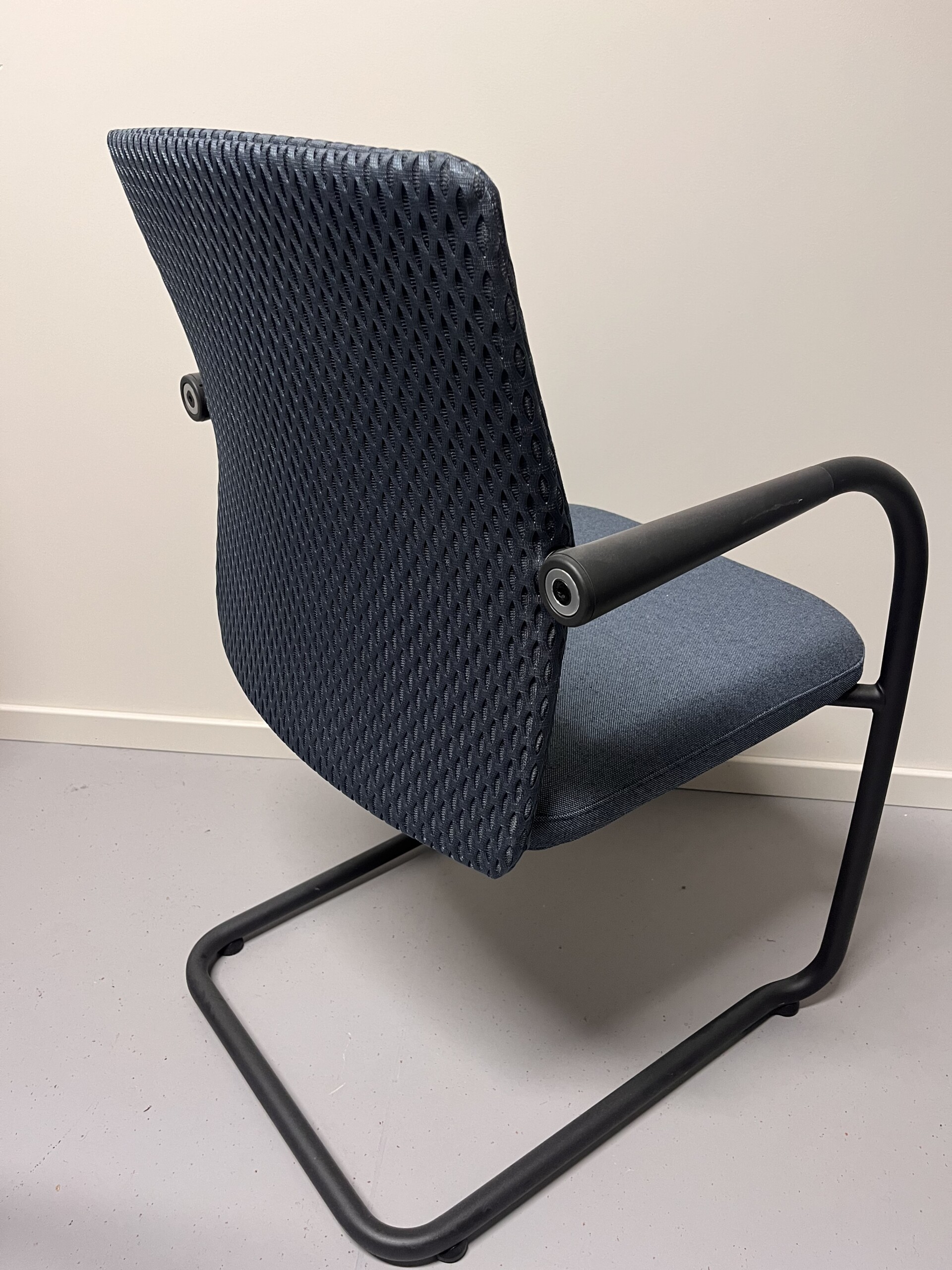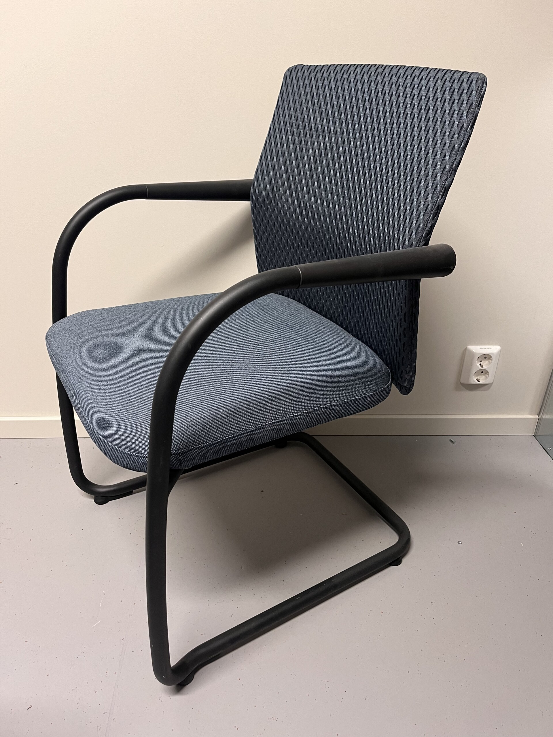 Sits i tyg (blå). Rygg i mesh (blå). Ben i metall (svart).