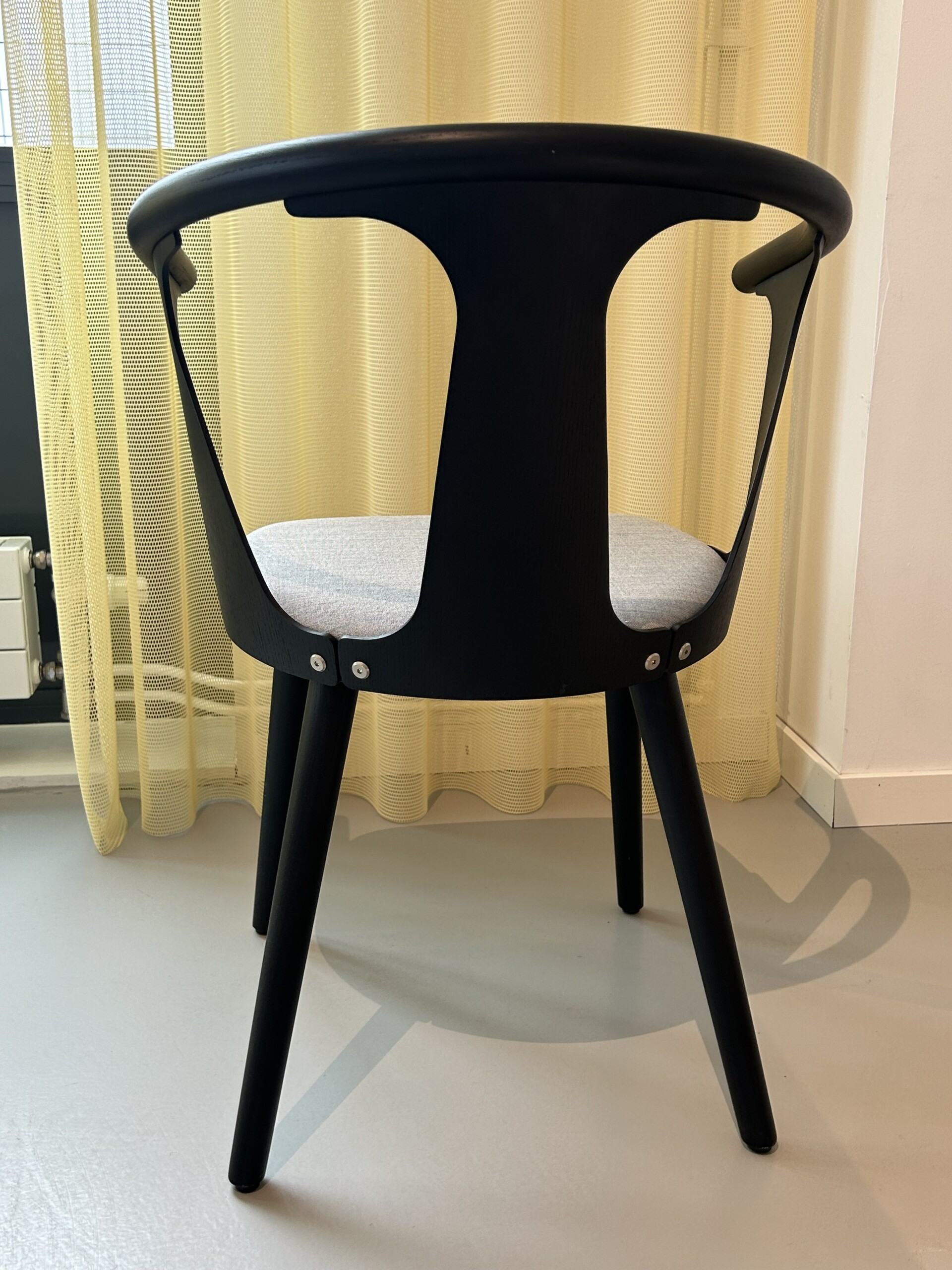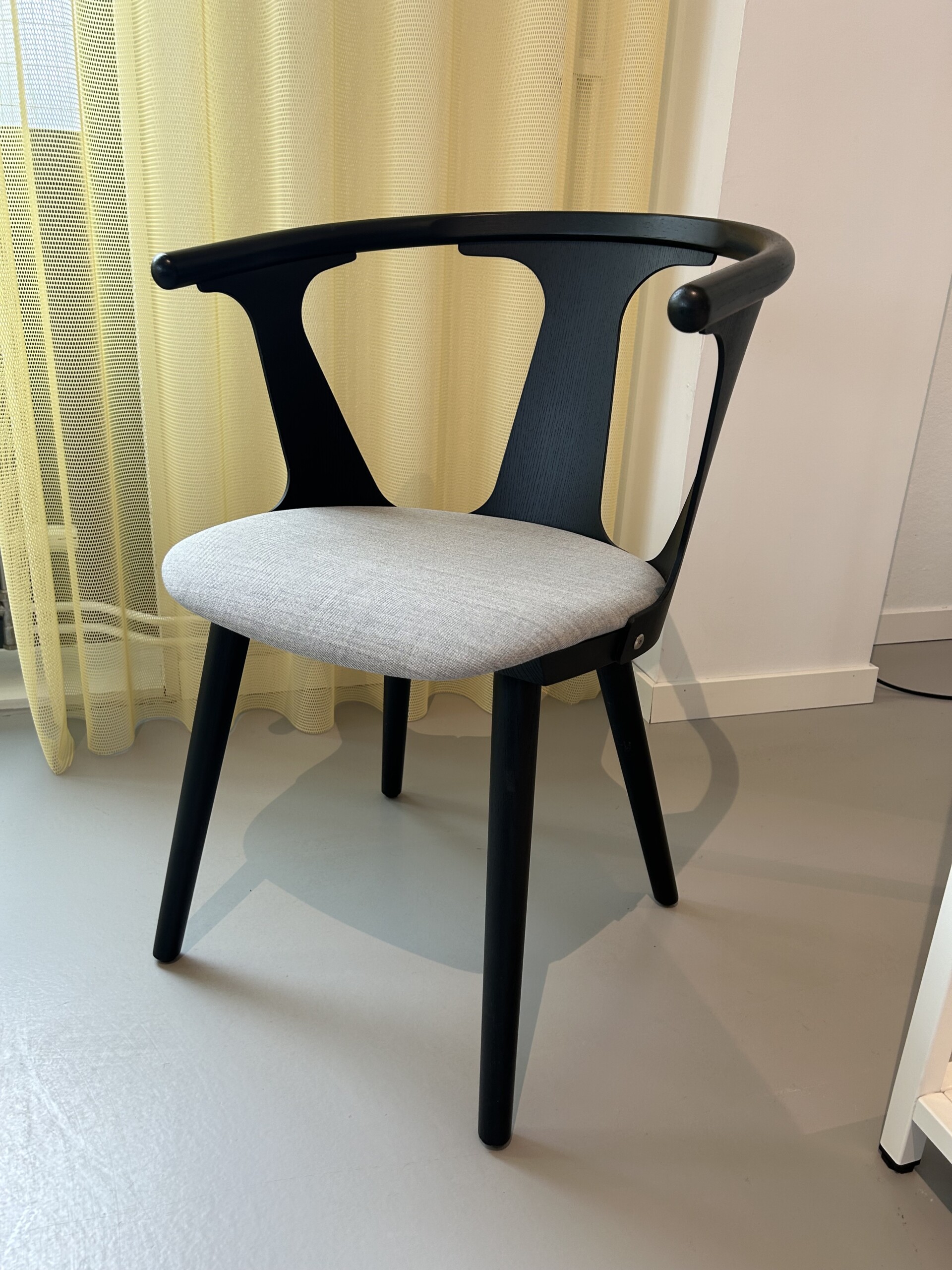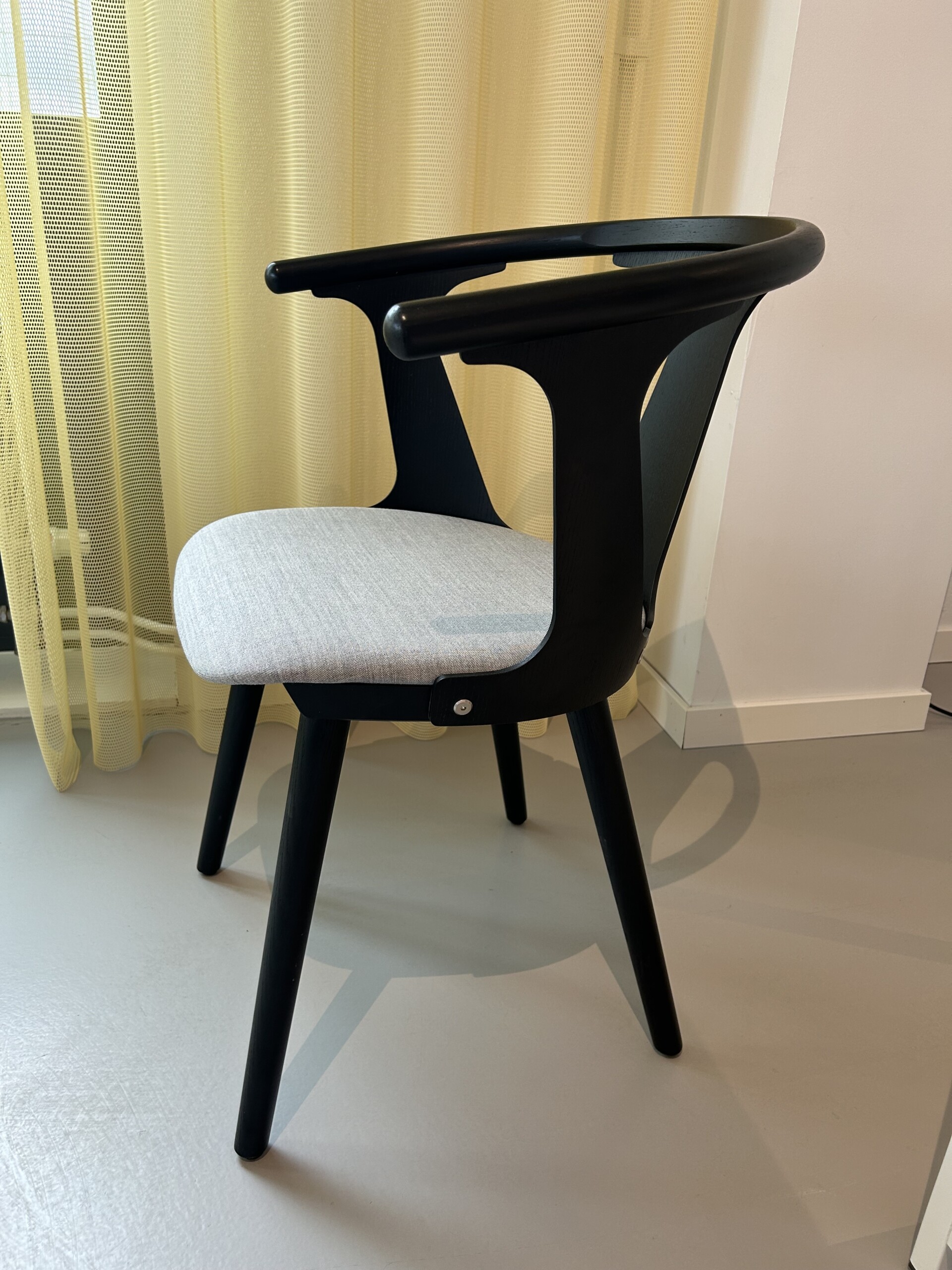 Sits i tyg (grå). Rygg i trä (svart). Ben i trä (svart).