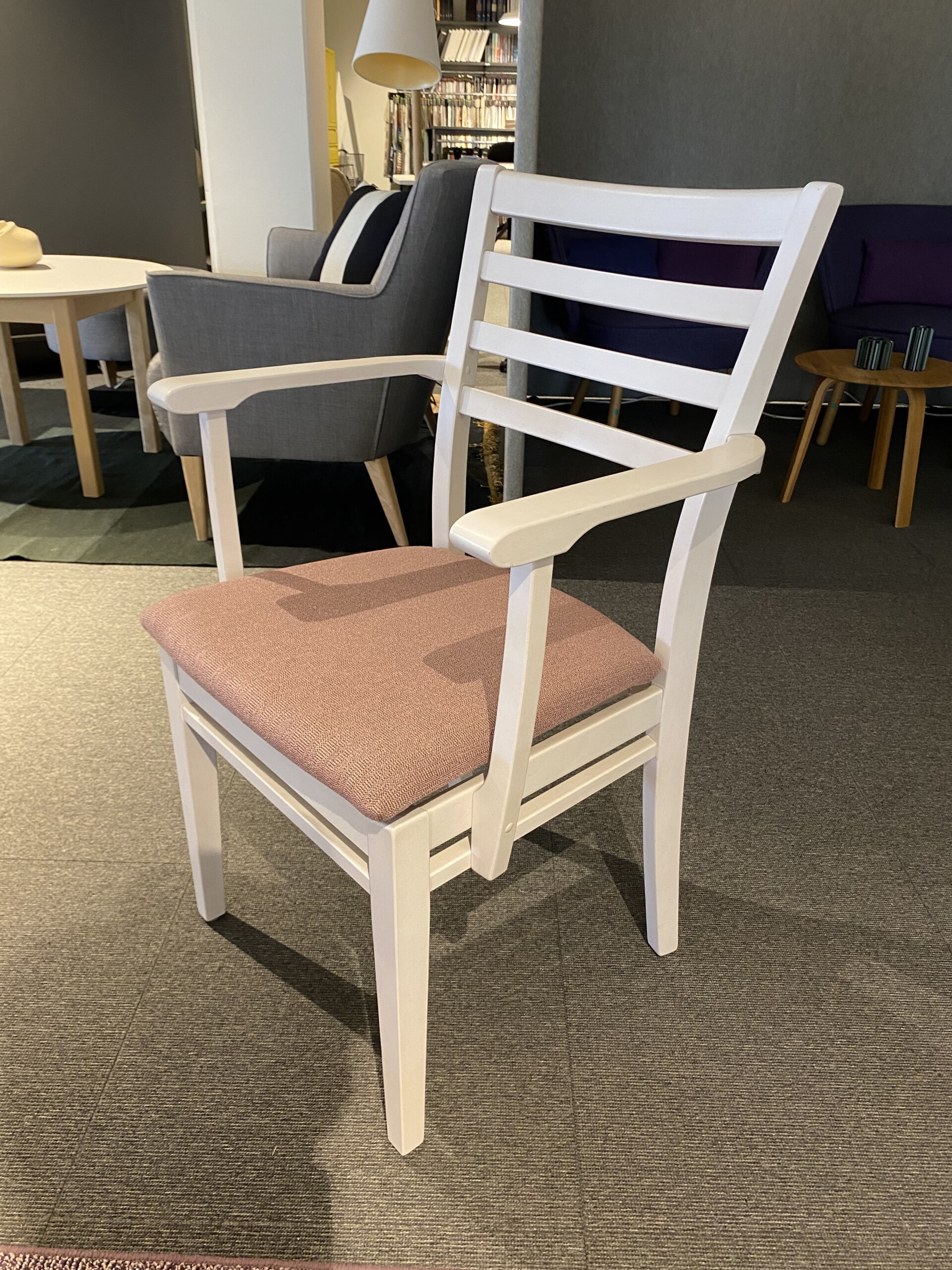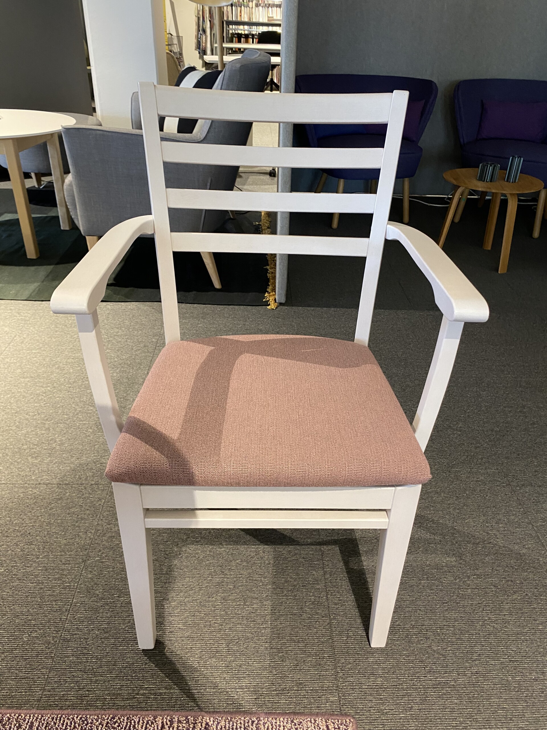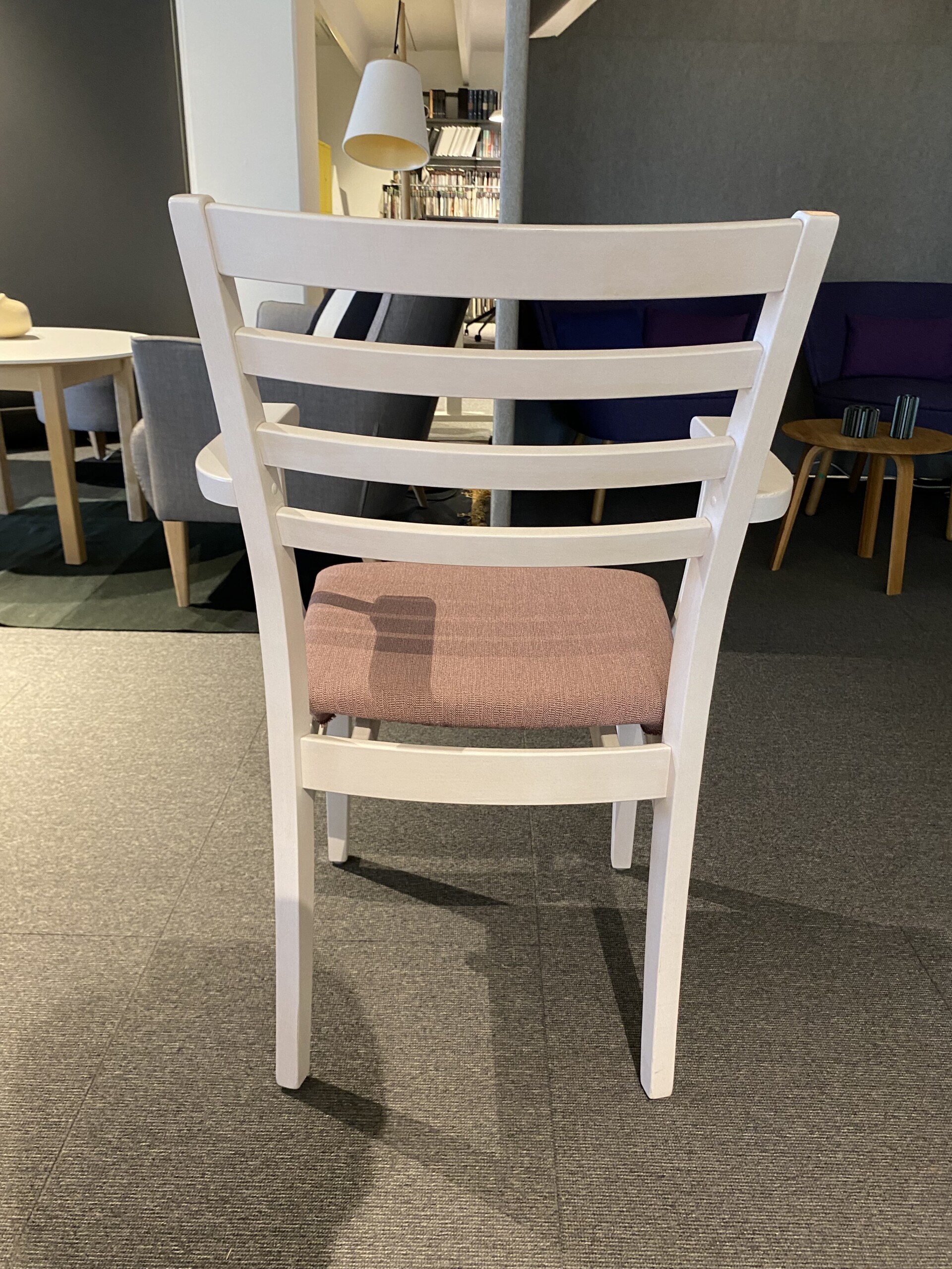 Sits i tyg (rosa). Rygg i trä (vit). Ben i trä (vit).