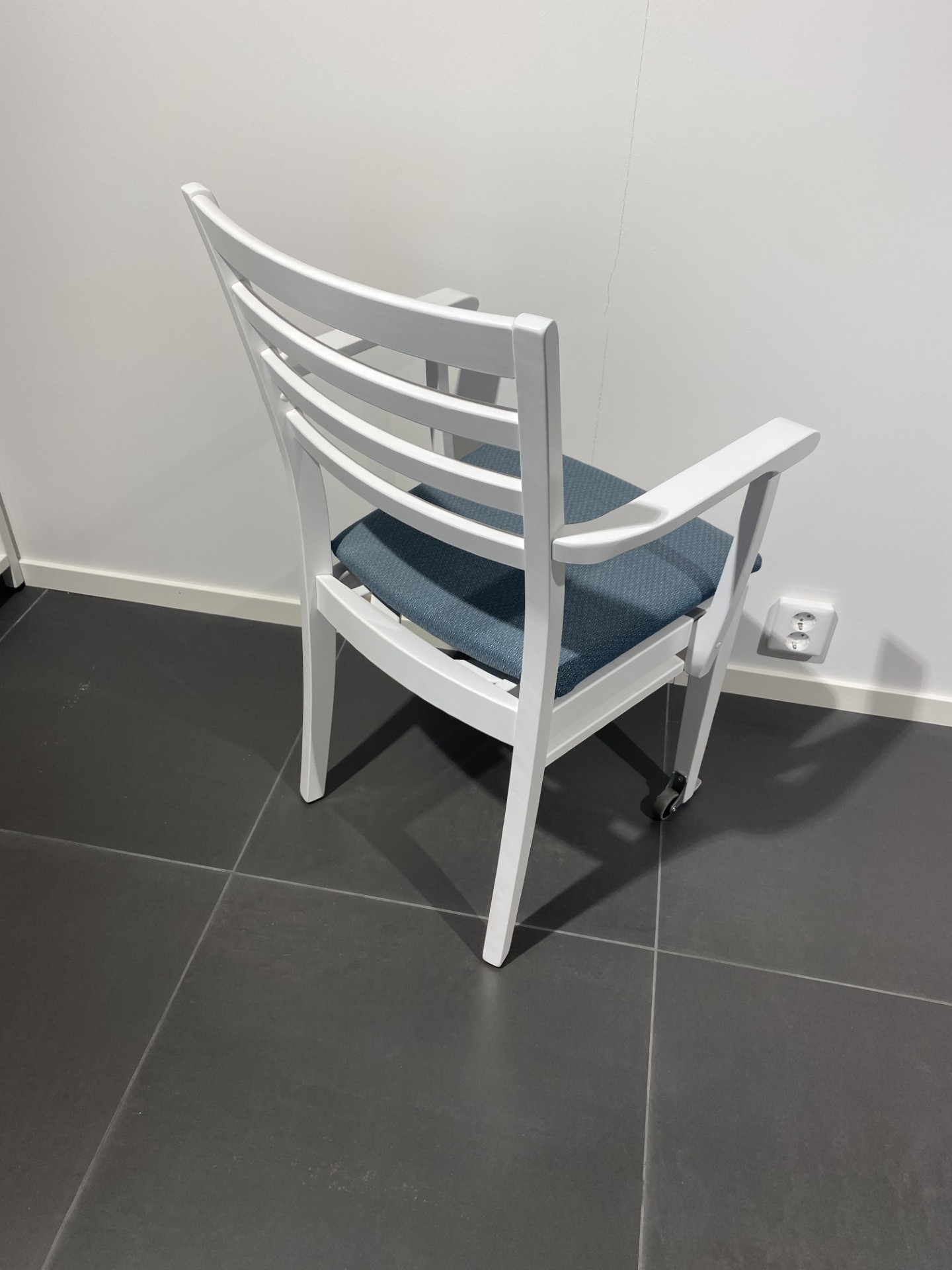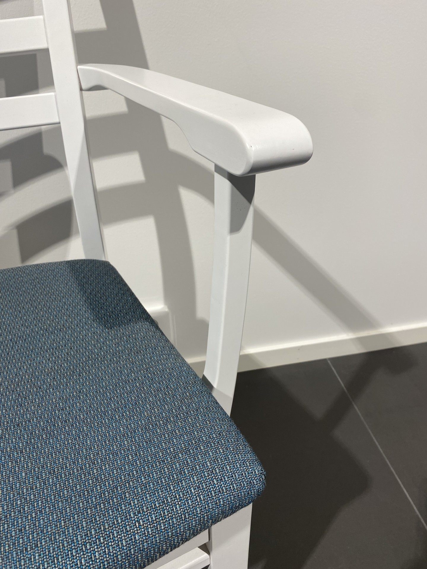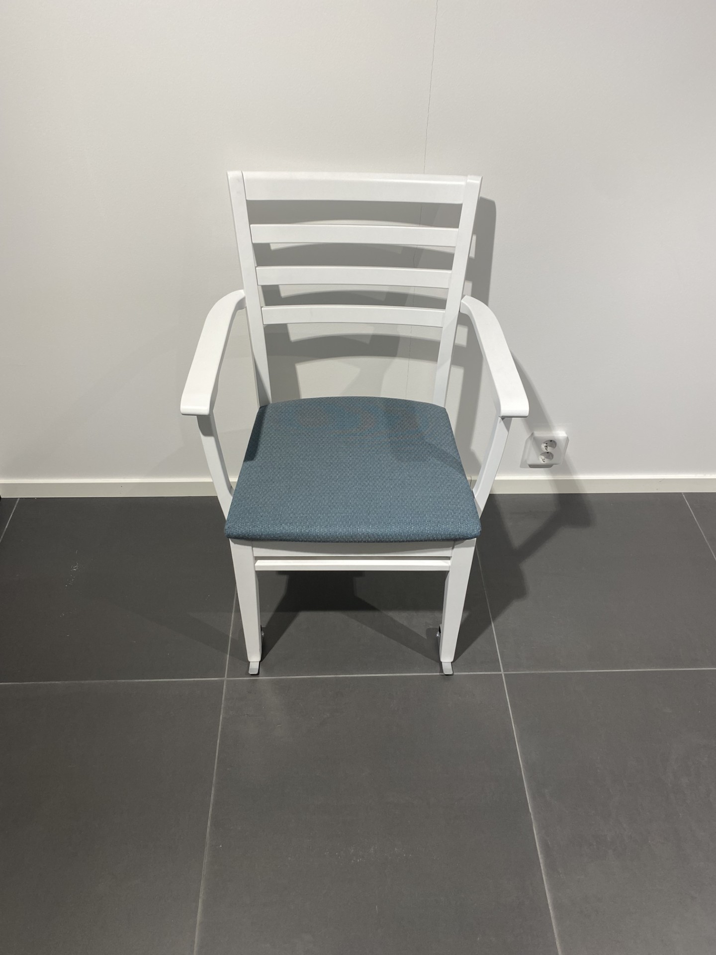 Sits i tyg (blå). Rygg i trä (vit). Ben i trä (vit).