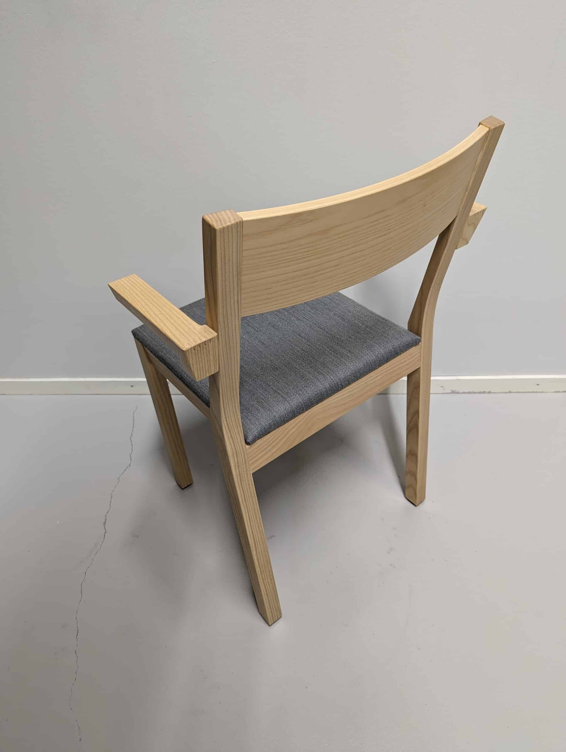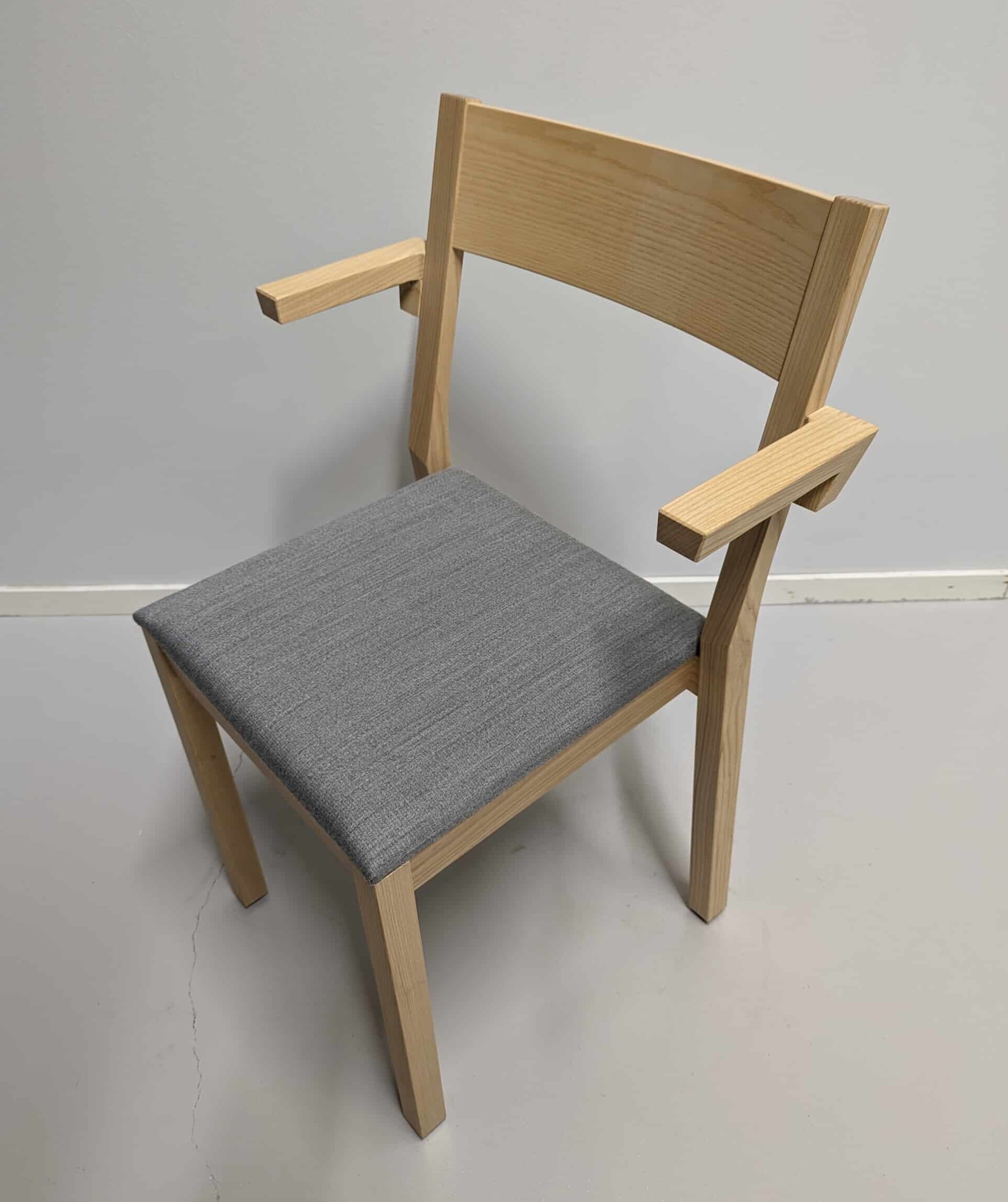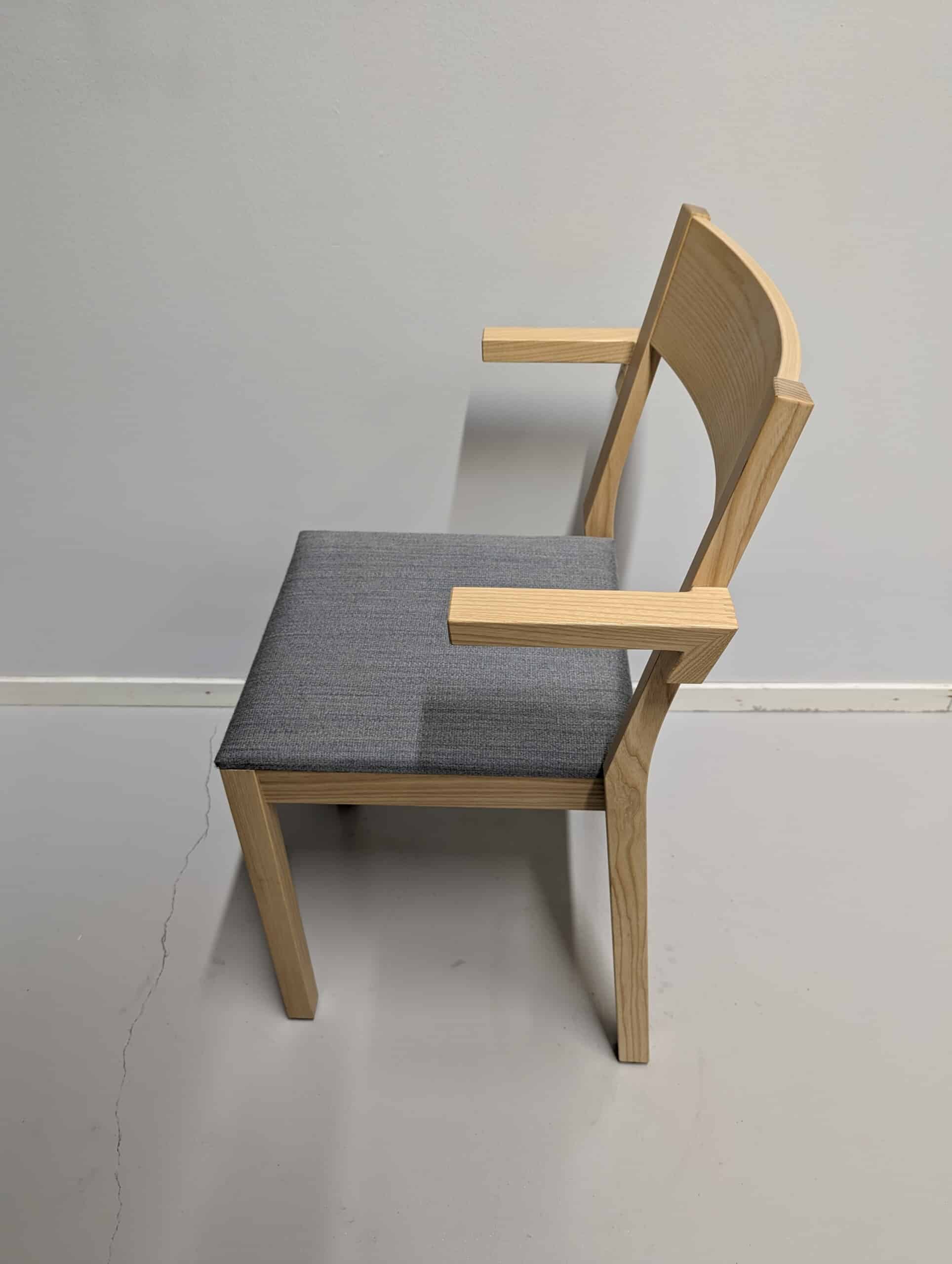 Sits i tyg (grå). Rygg i trä (ask). Ben i trä (ask).