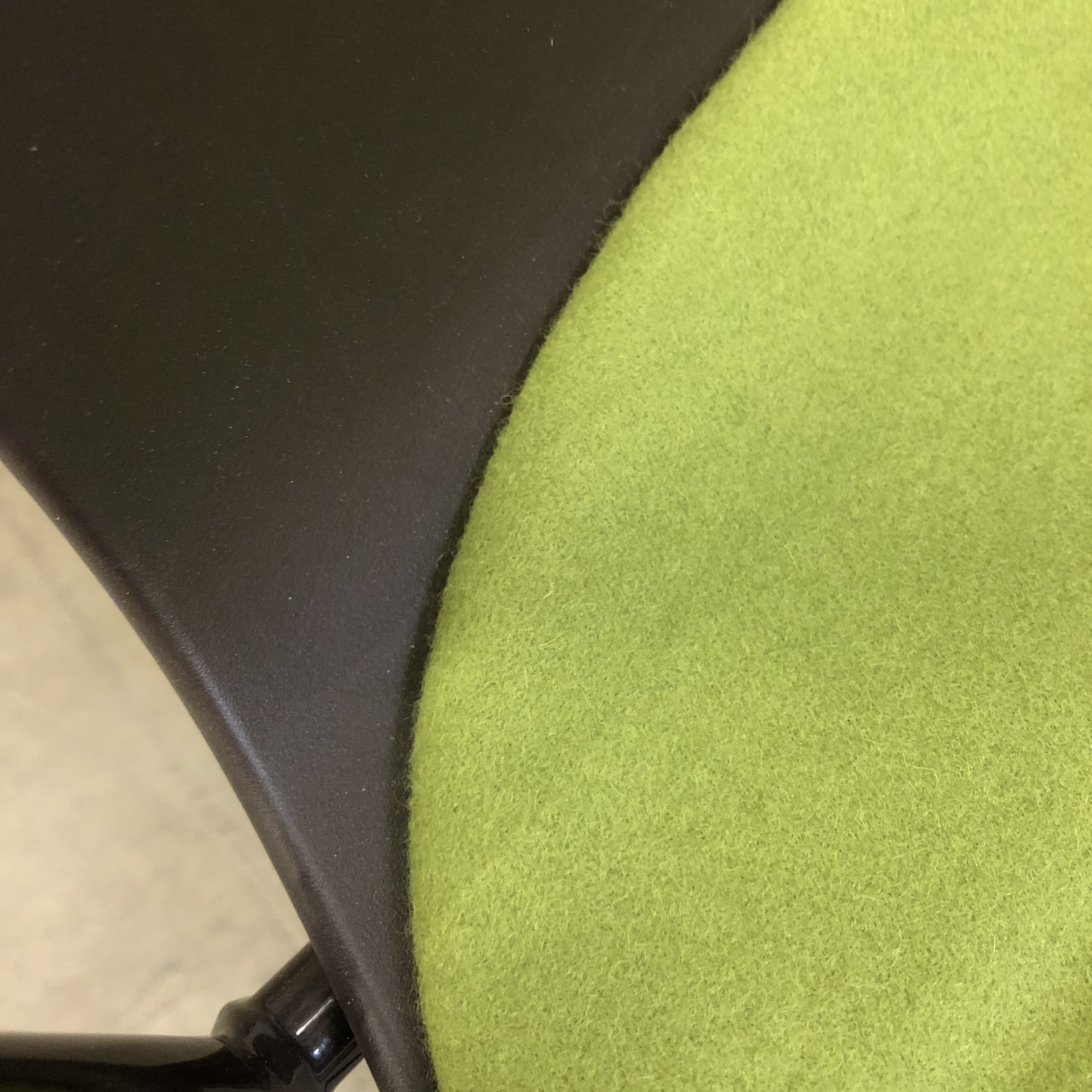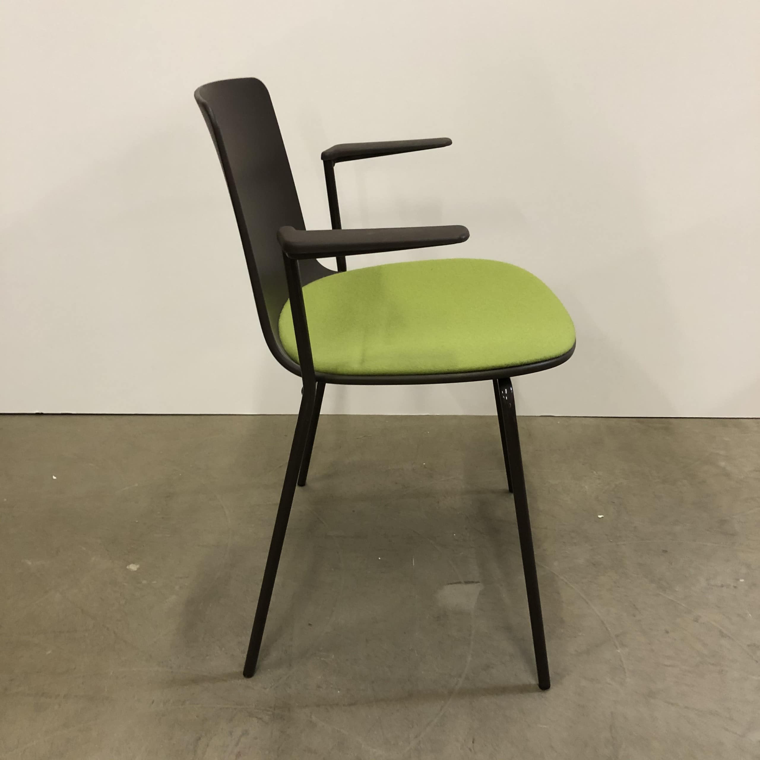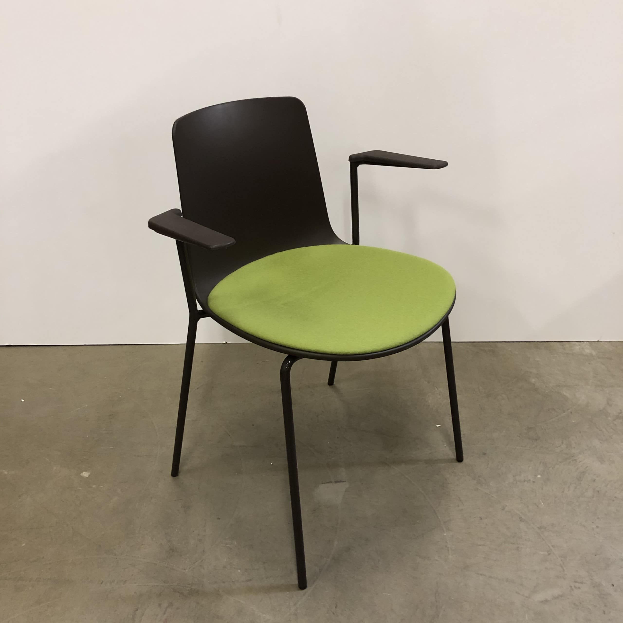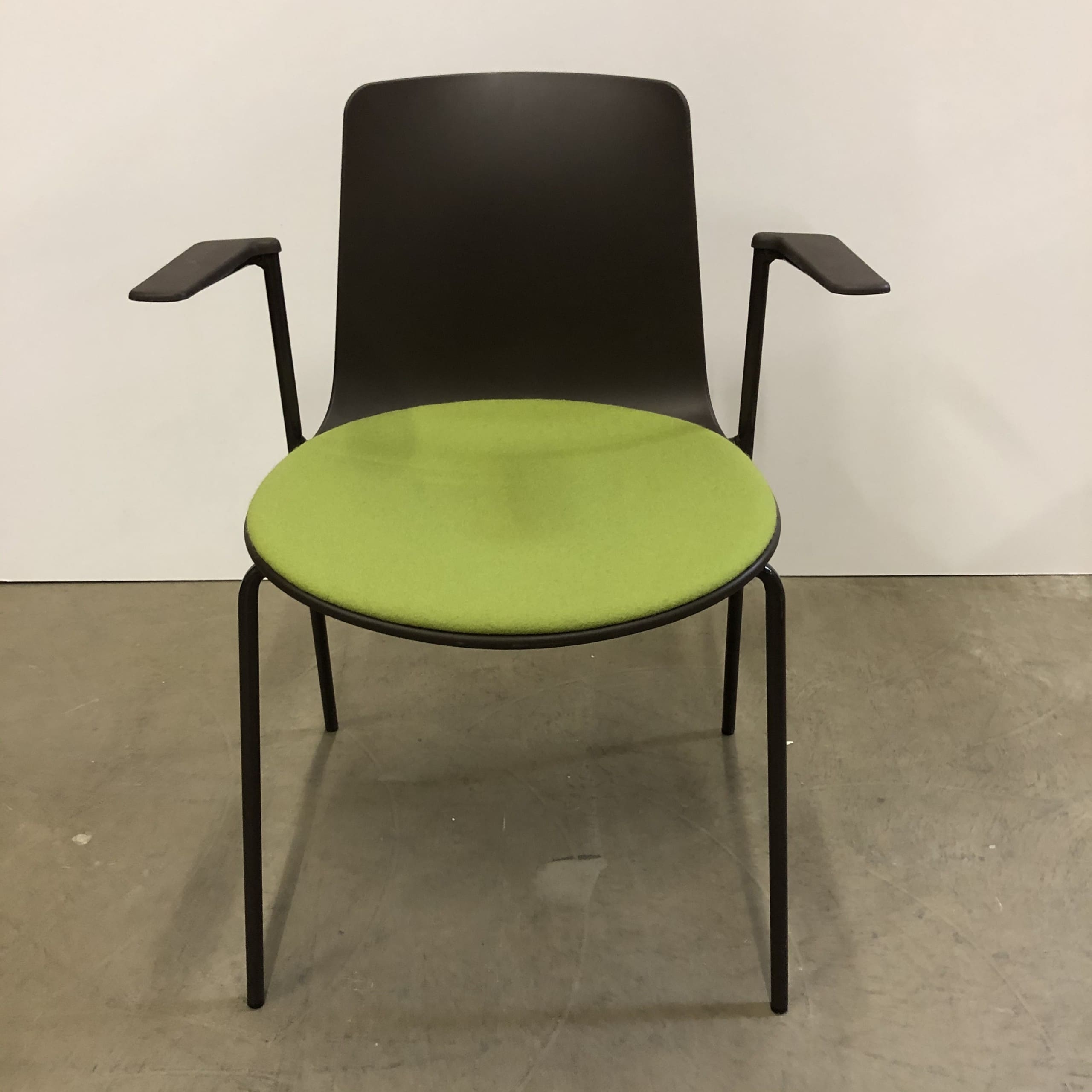 Sits i tyg (grön). Rygg i plast (brun). Ben i metall (brun).