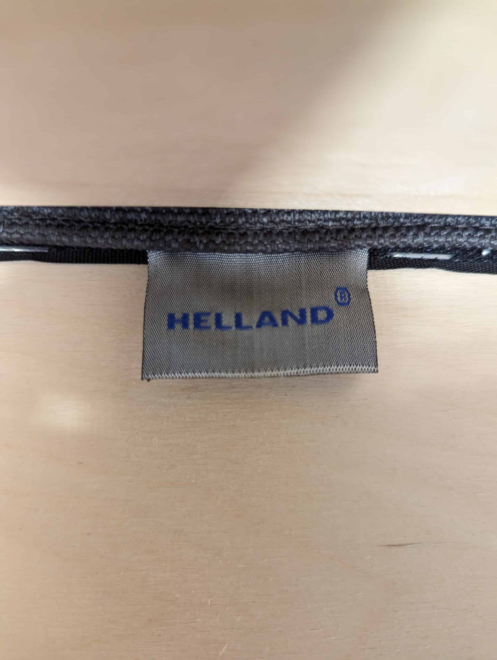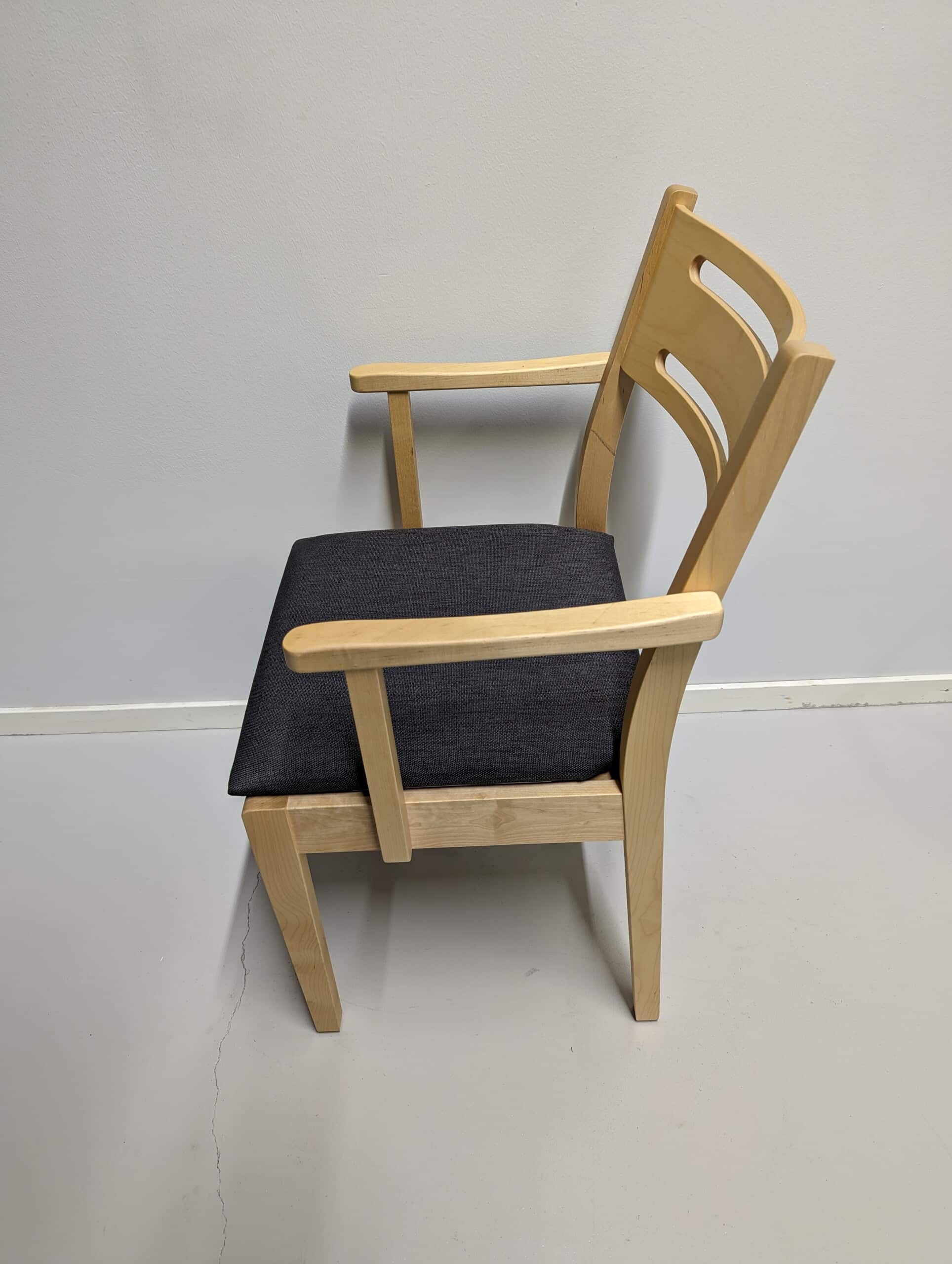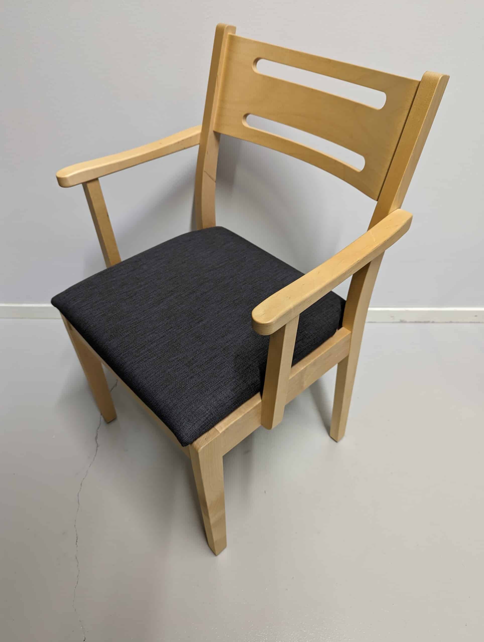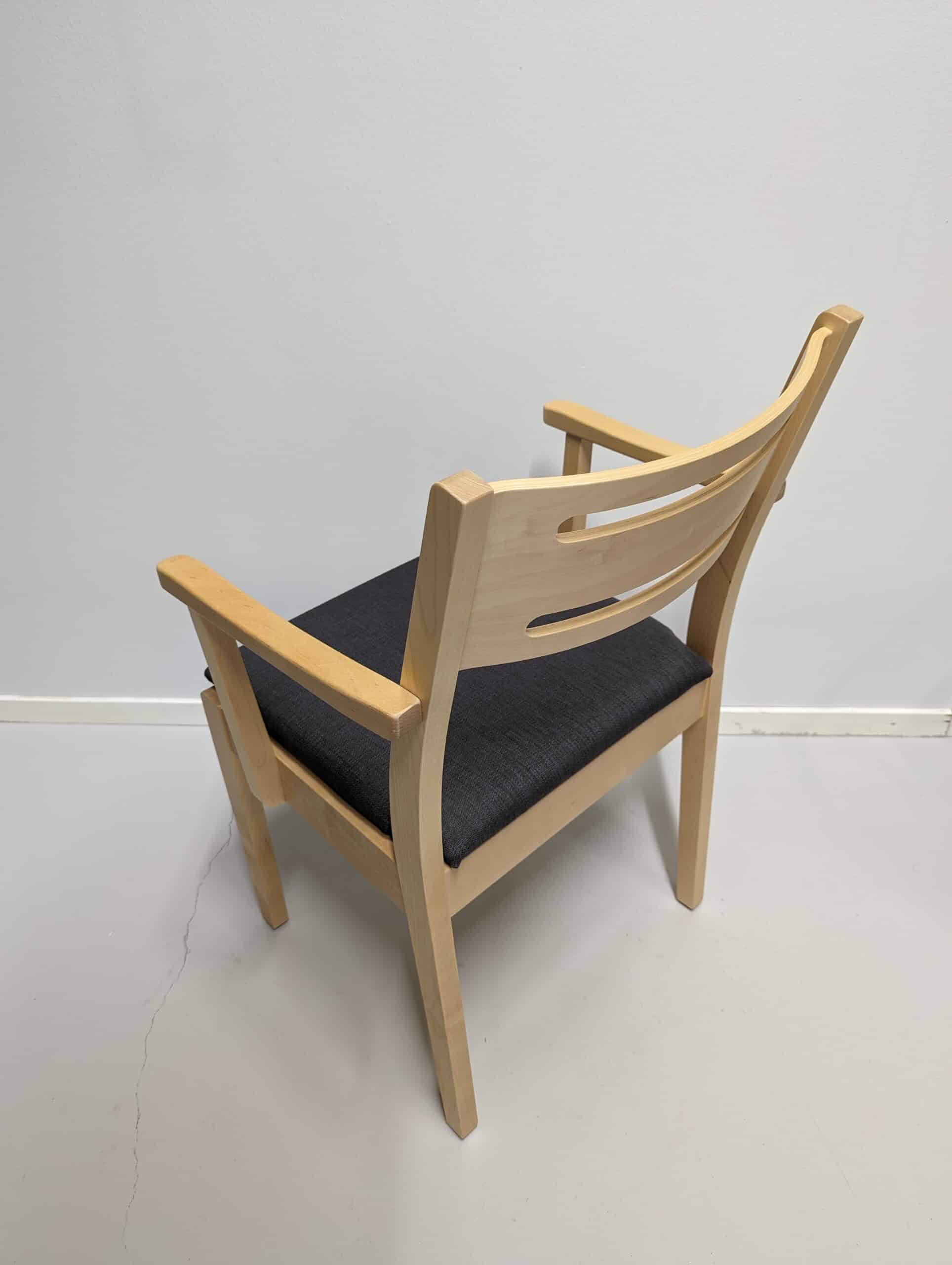 Sits i tyg (grå). Rygg i trä (björk). Ben i trä (björk).