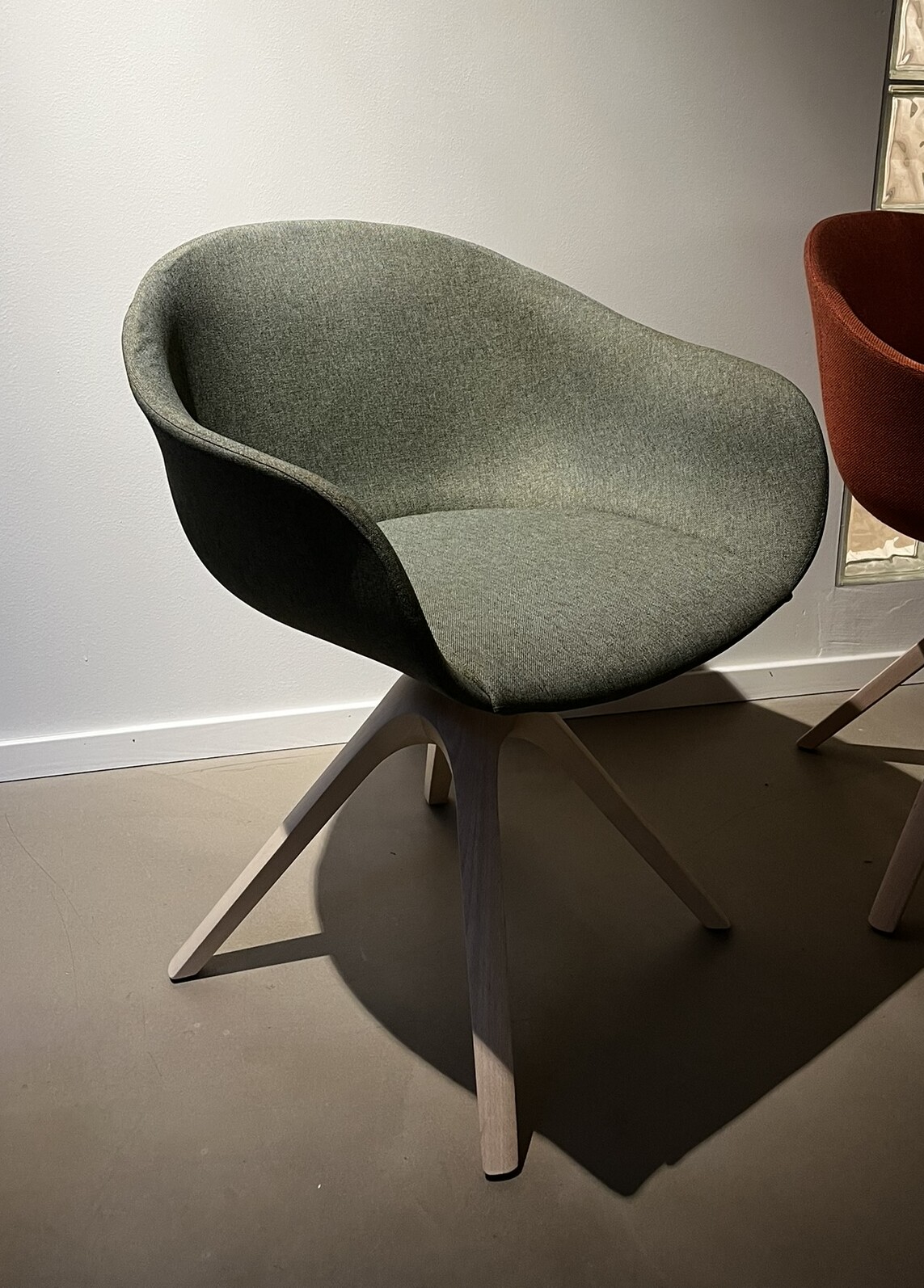 Sits och rygg i tyg (grön). Medstativ i trä (ek).