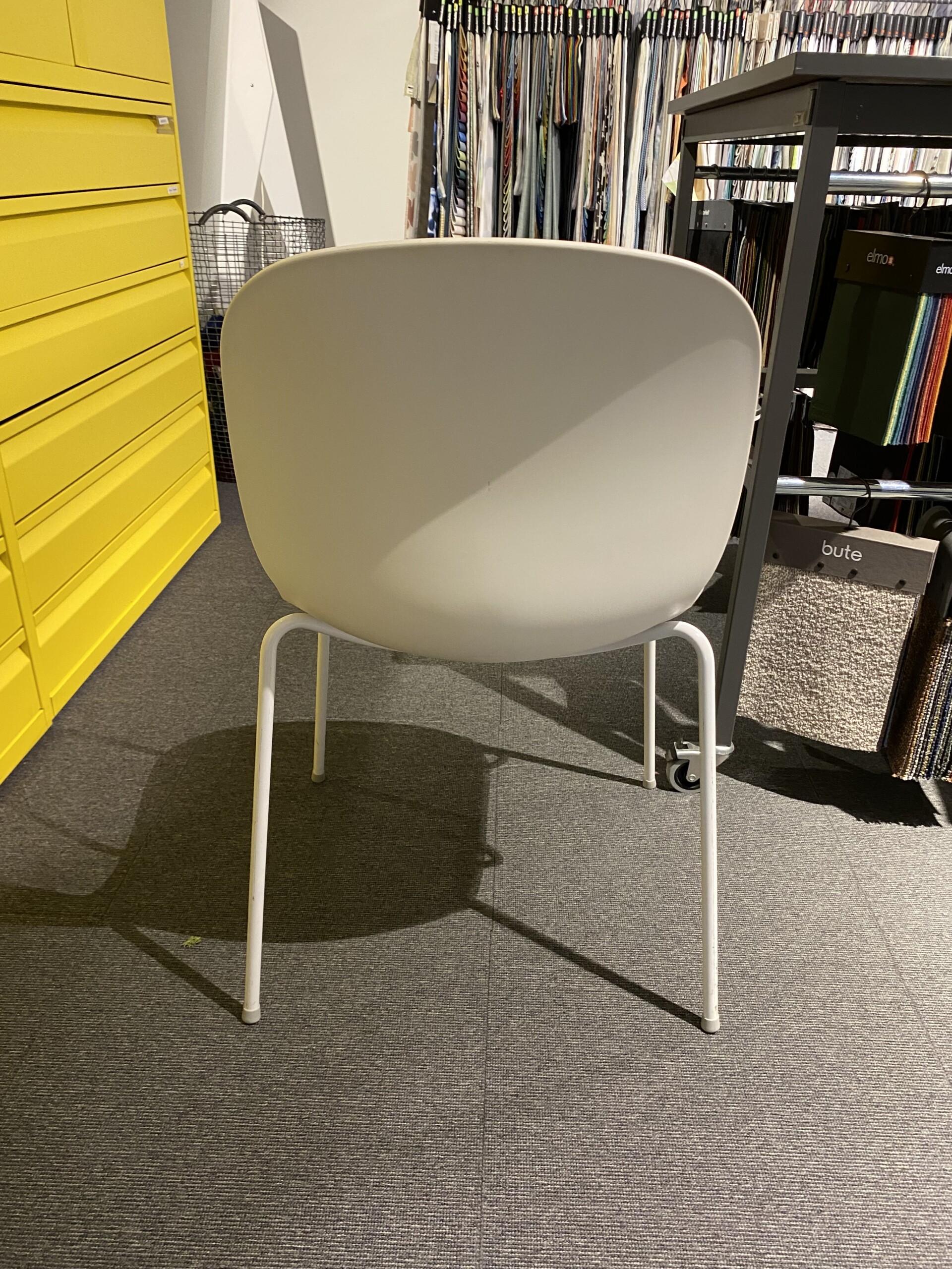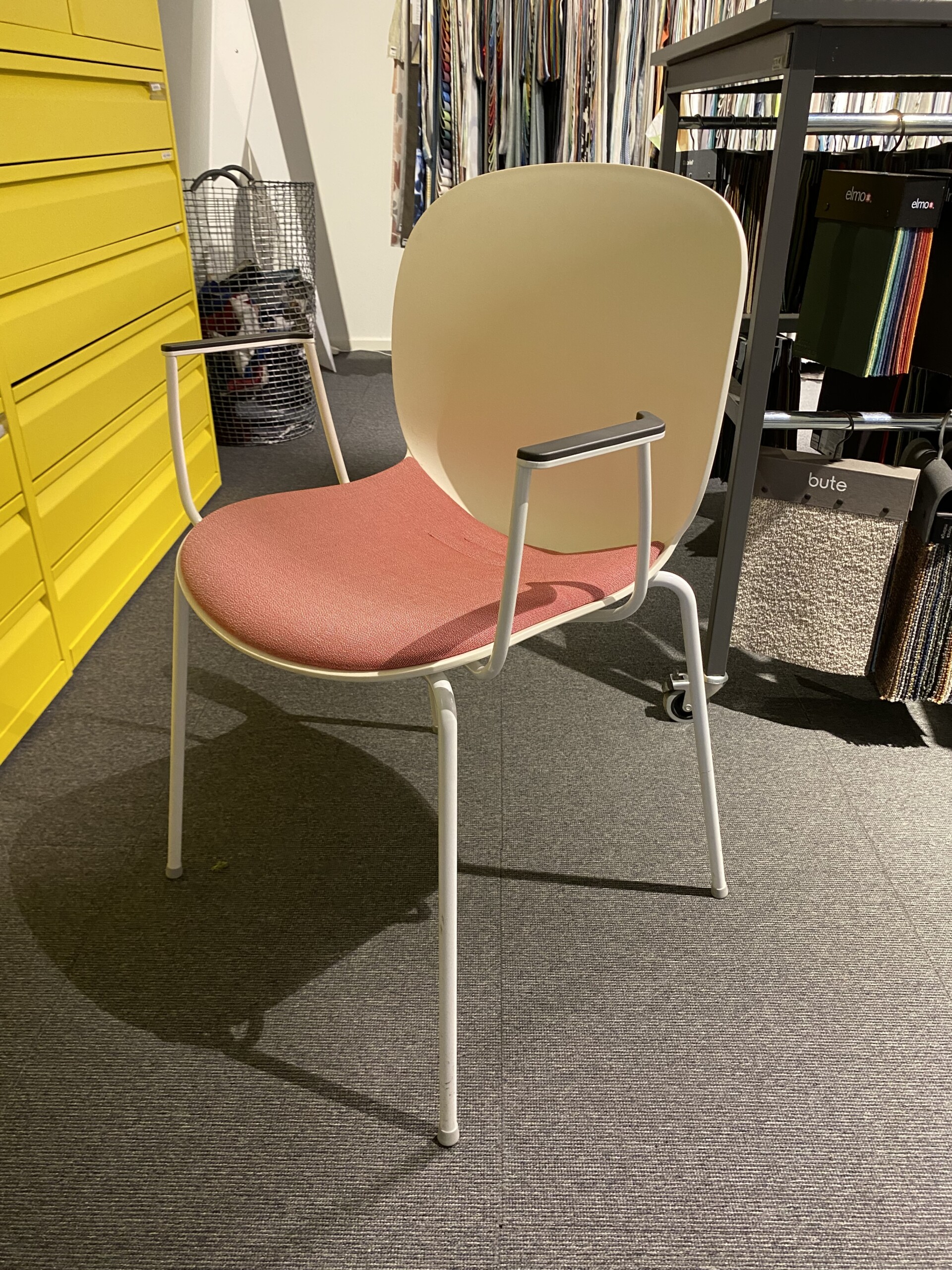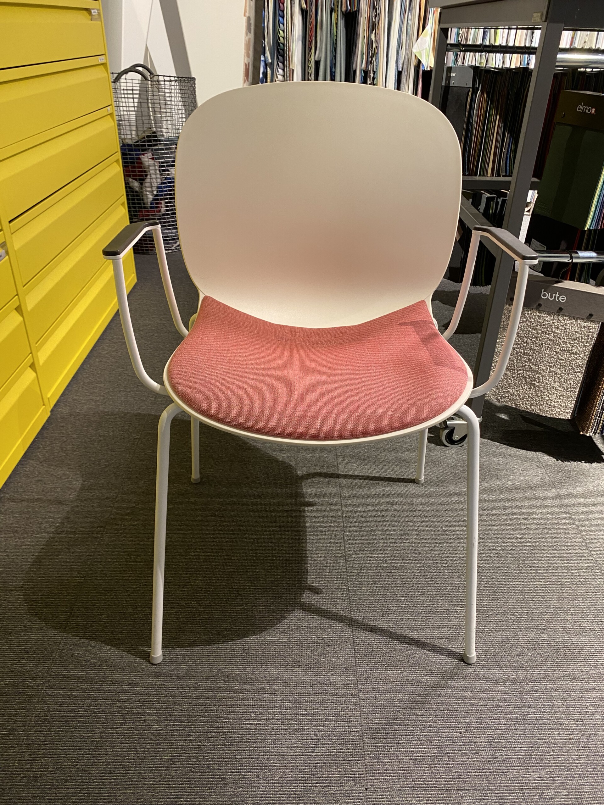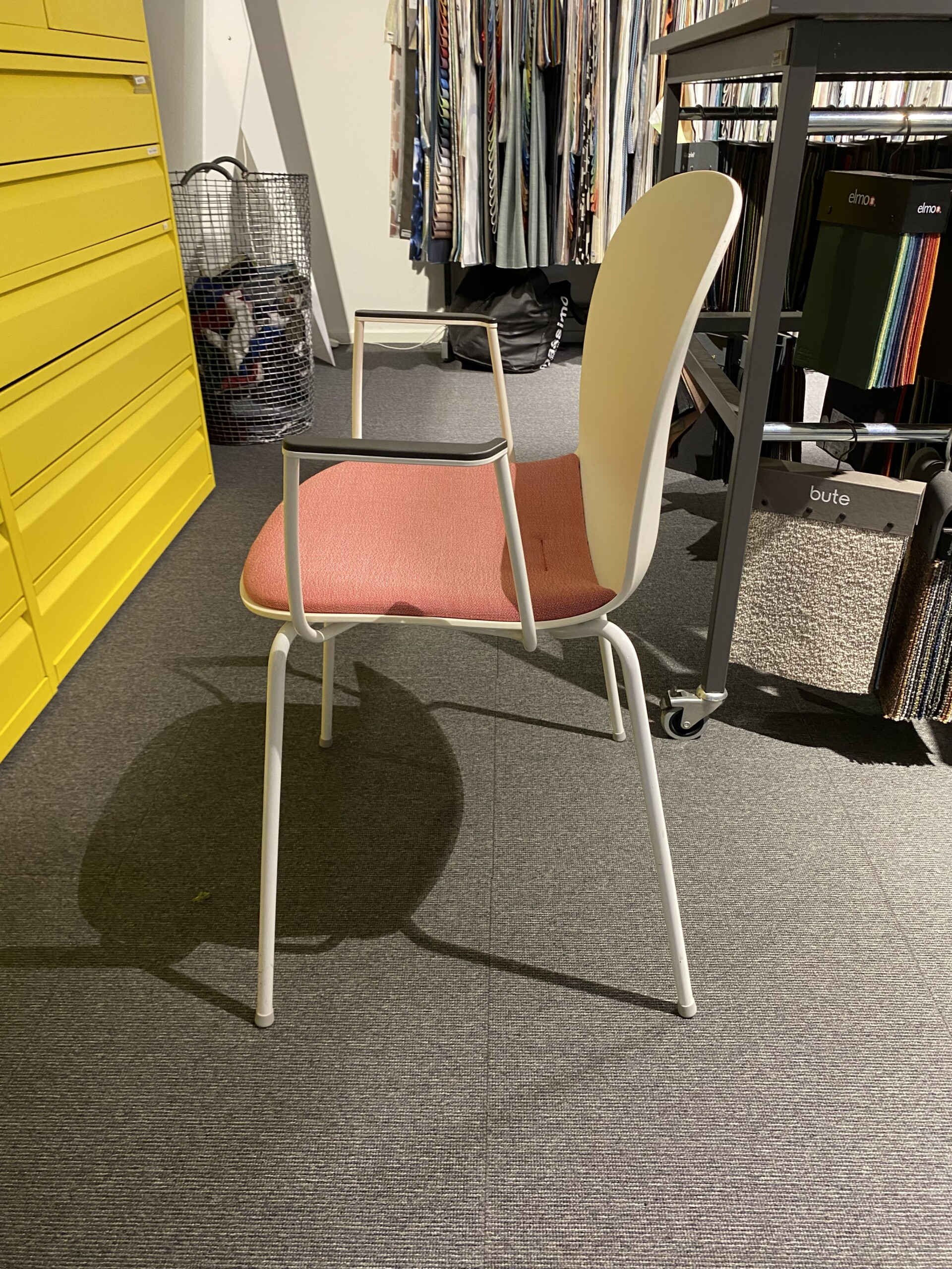 Sits i tyg (rosa). Rygg i plast (vit). Ben i metall (vit).