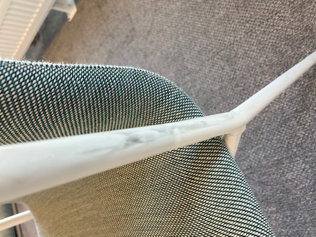 Sits och rygg i tyg (turkos). Ben i metall (vit).