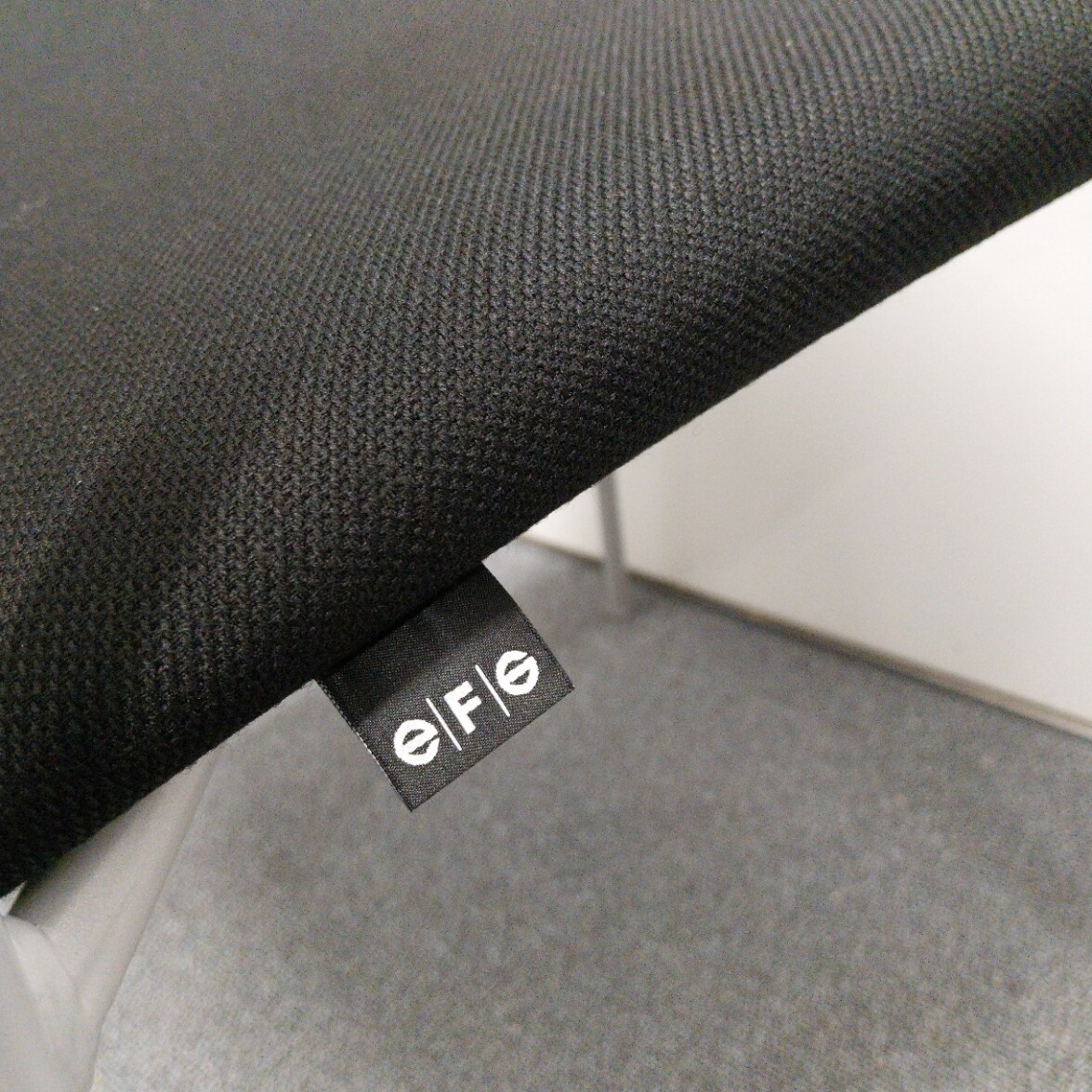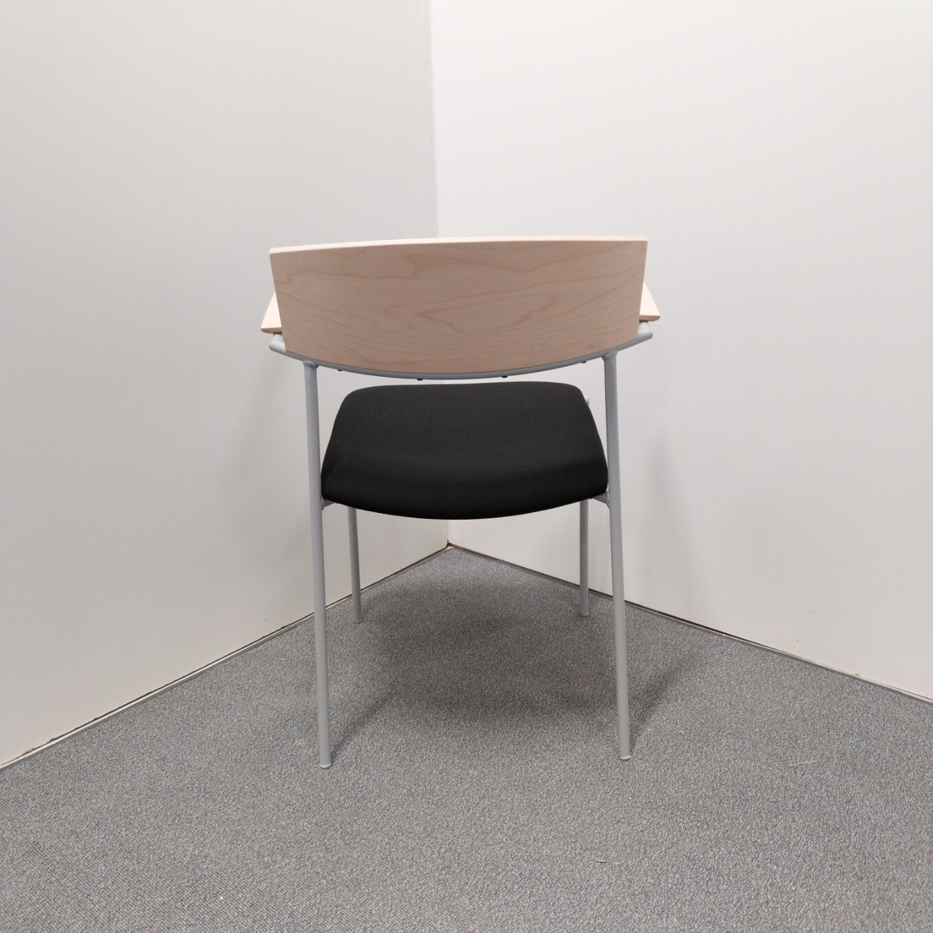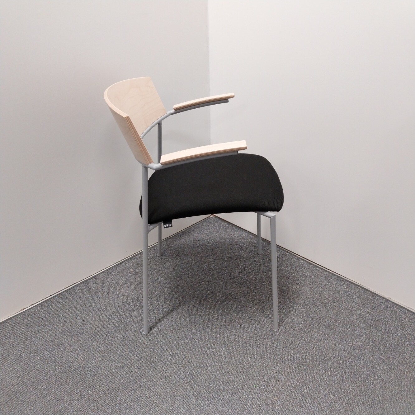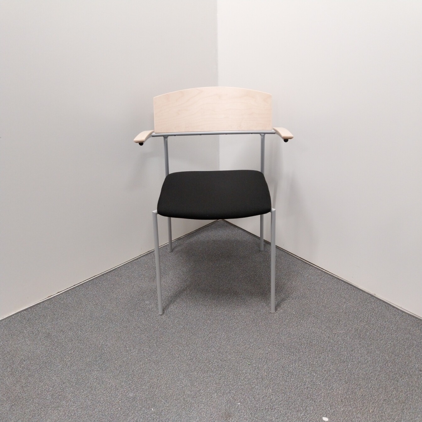 Sits i tyg (svart). Rygg i trä (björk). Ben i metall (silver).