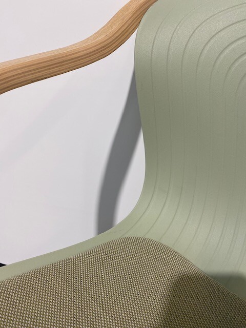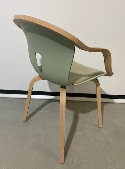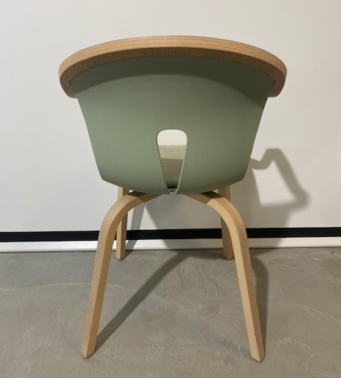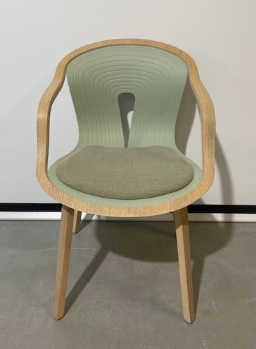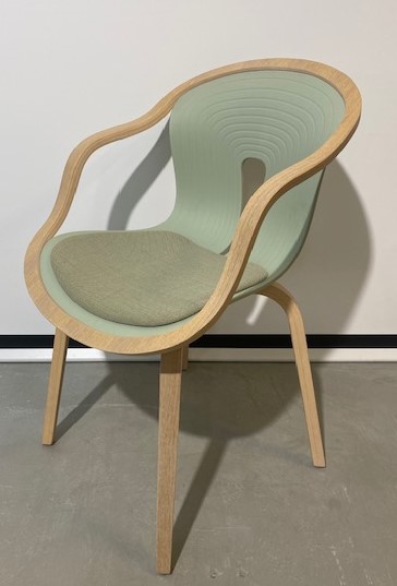 Sits i tyg (grön). Rygg i plast (grön). Ben i trä (ek).