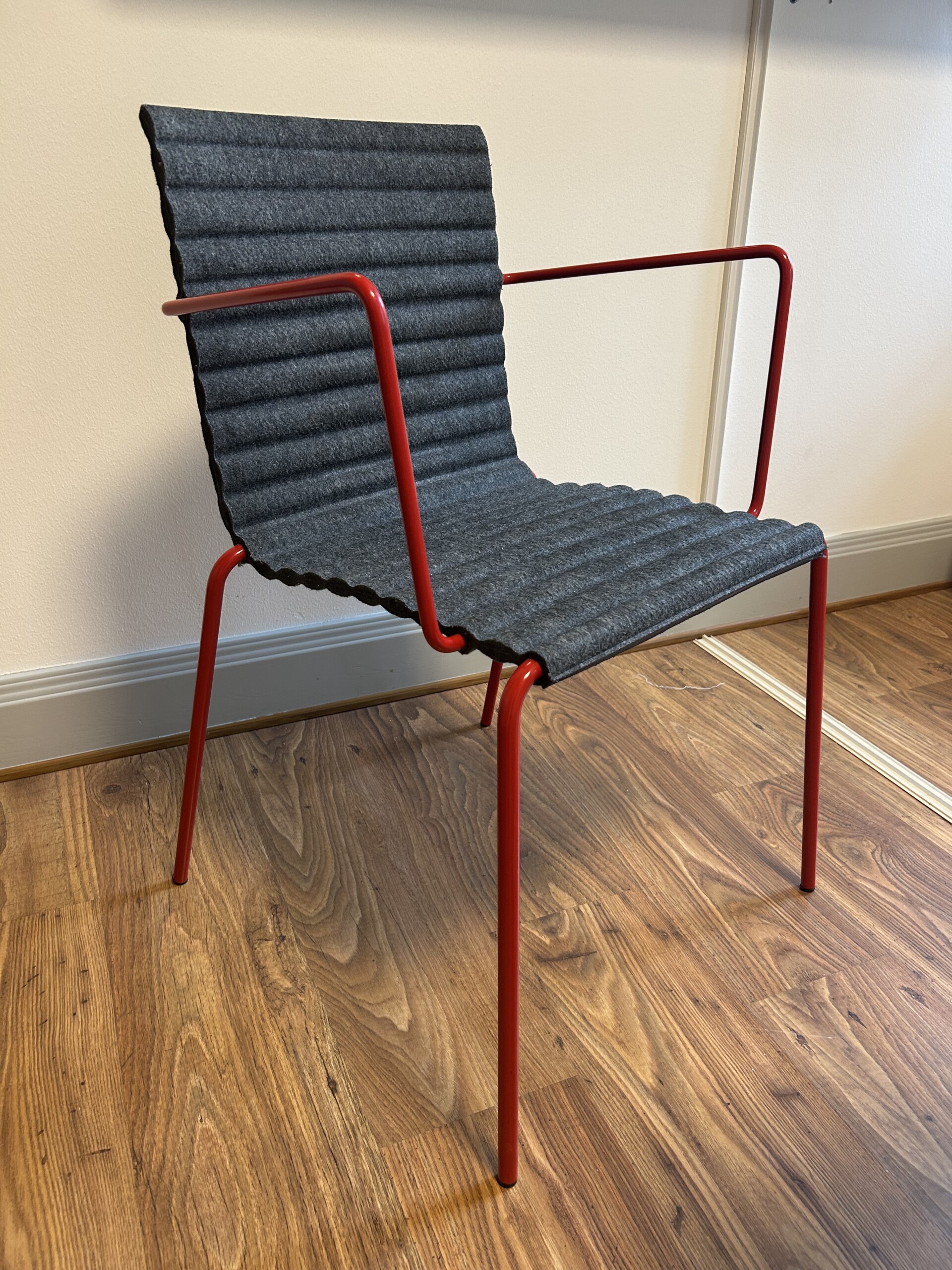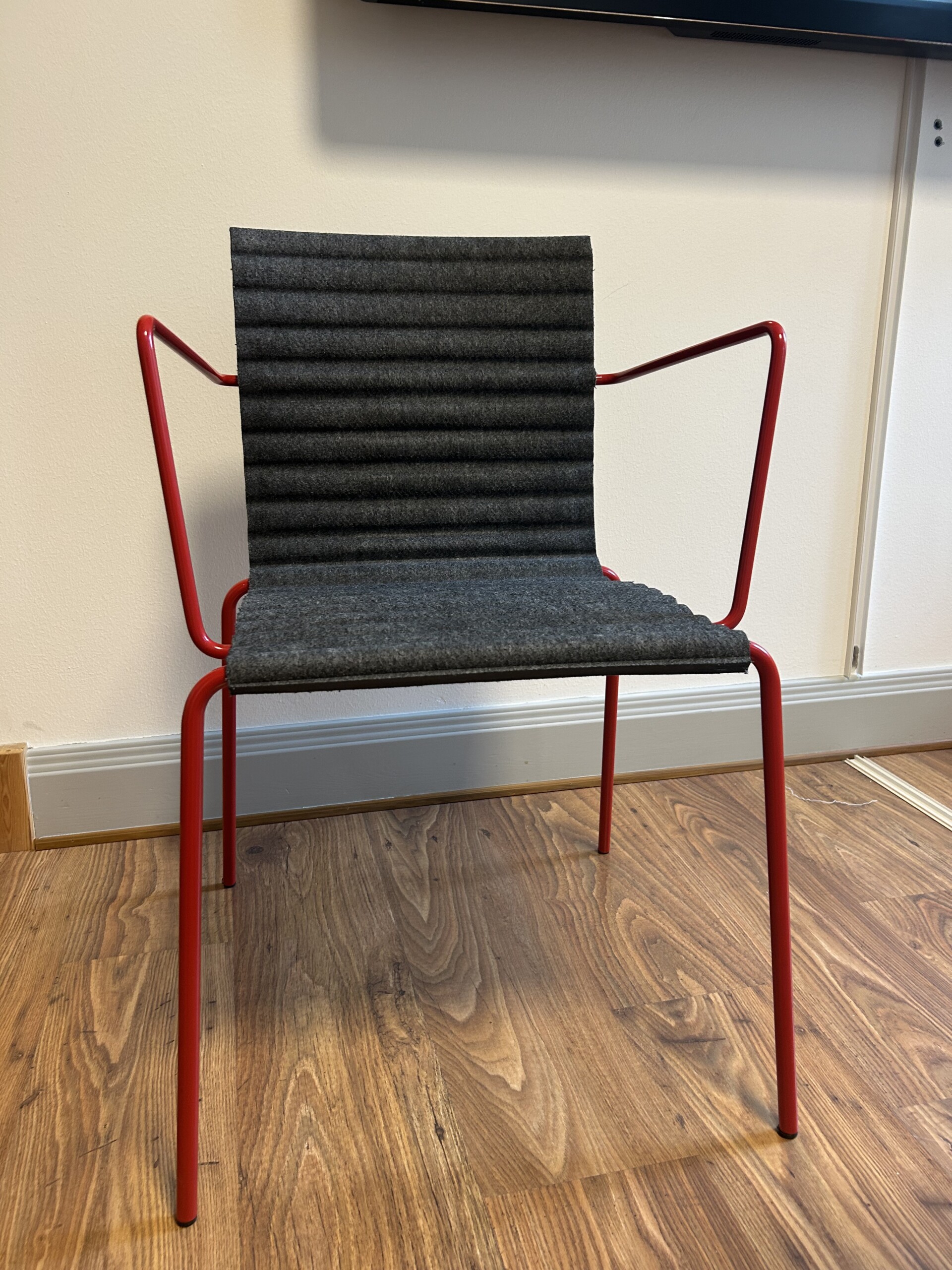 Sits och rygg i tyg (grå). Ben i metall (röd).