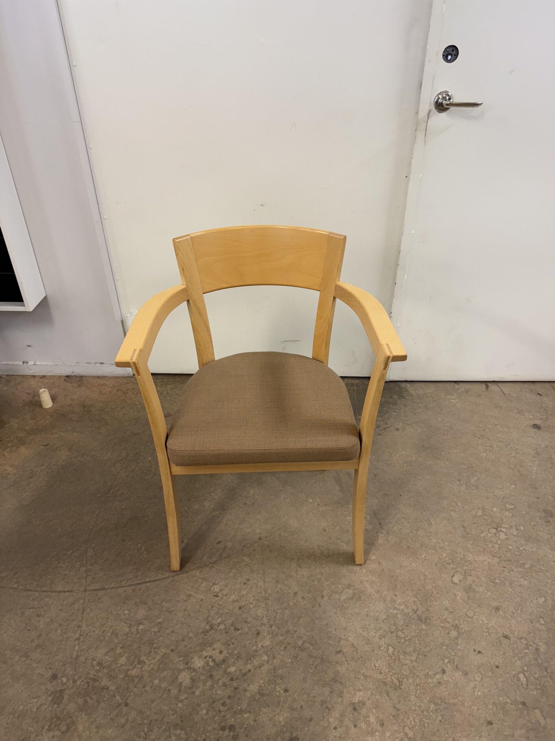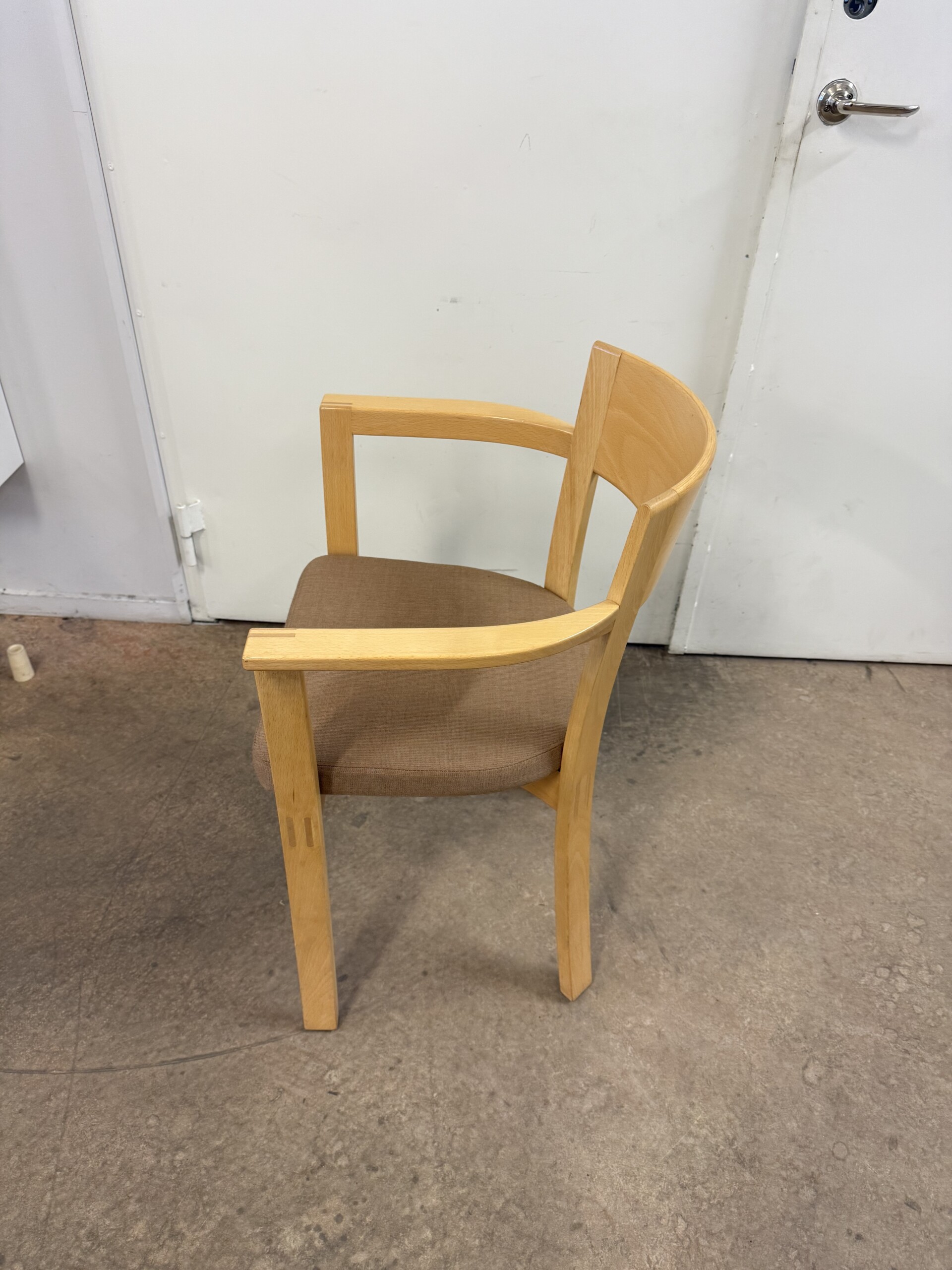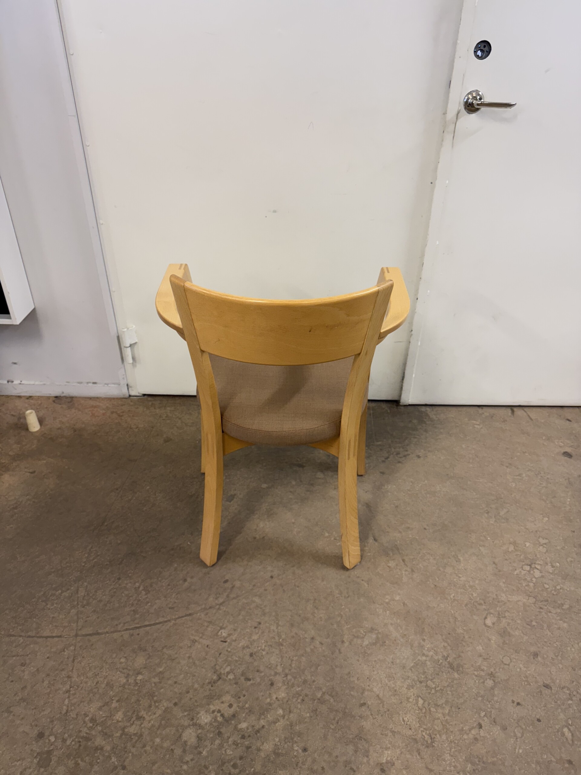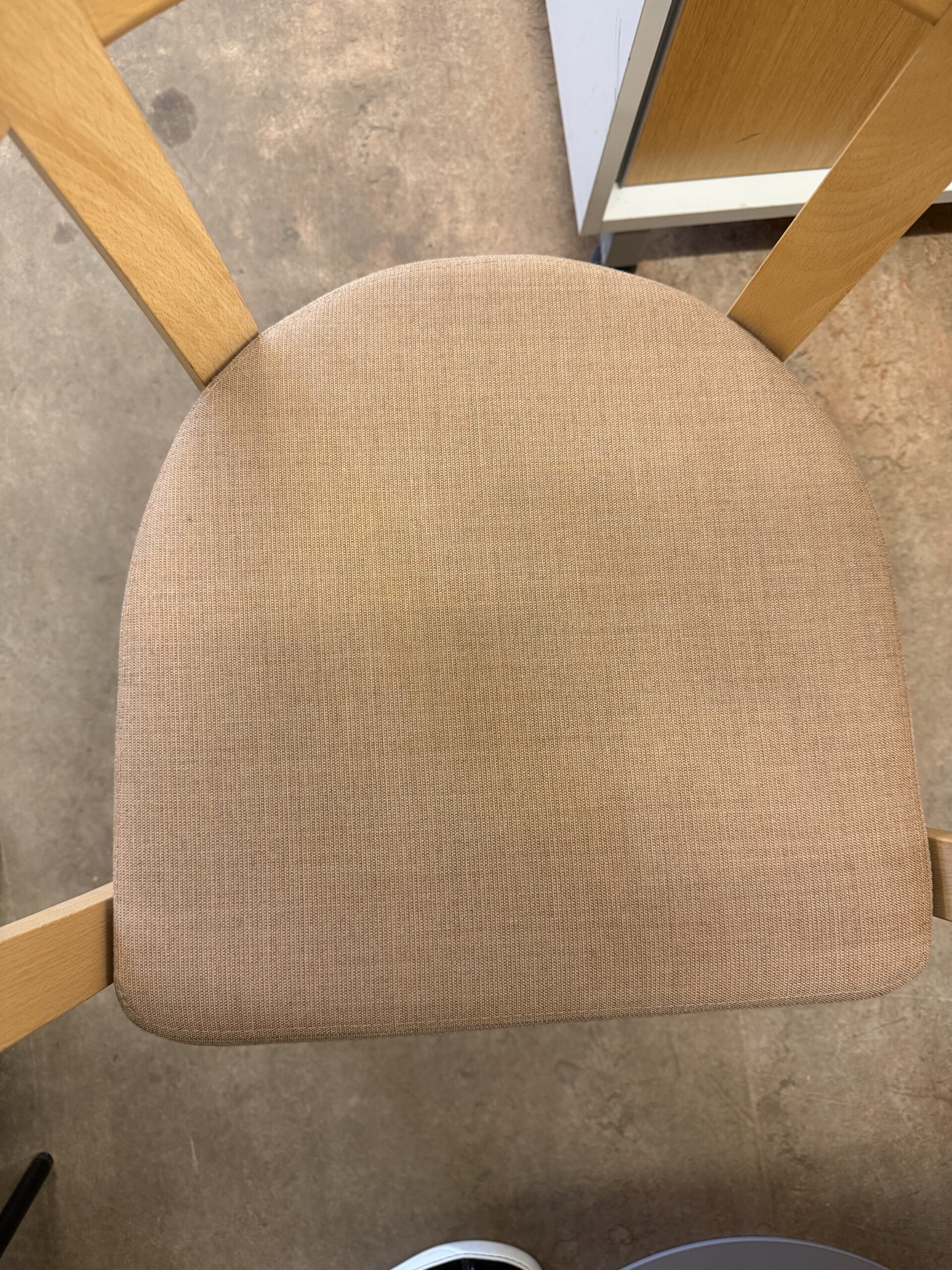 Sits i tyg (beige). Rygg i trä (bok). Ben i trä (bok).