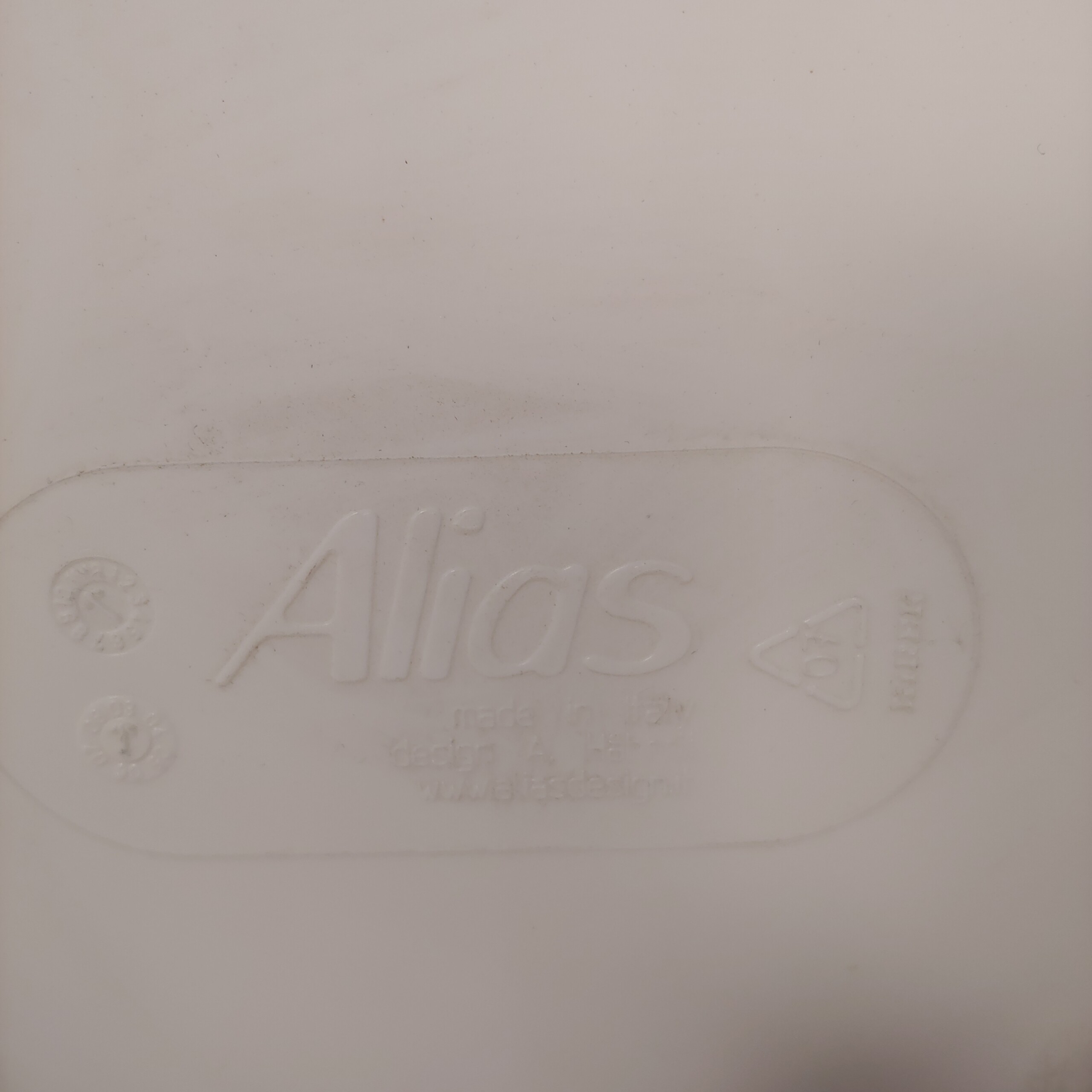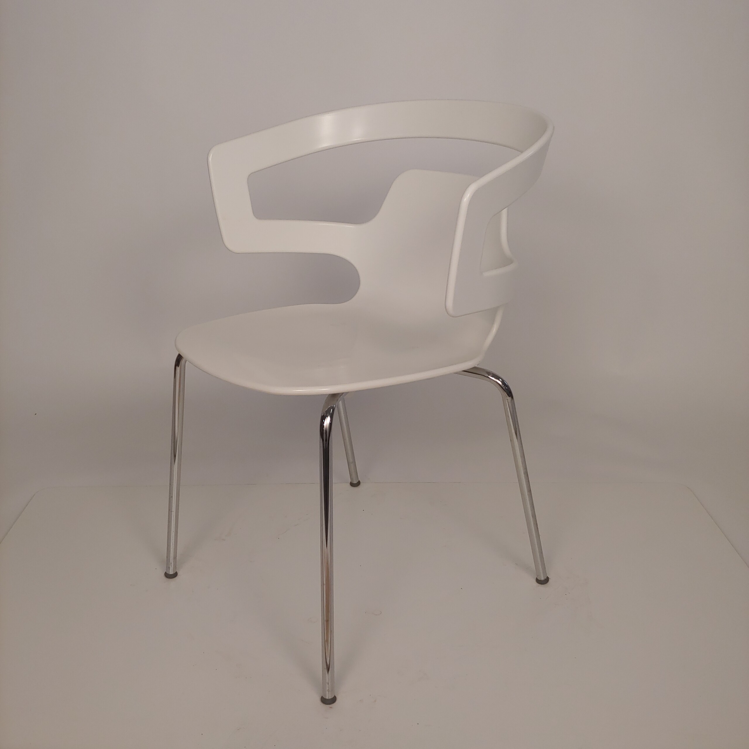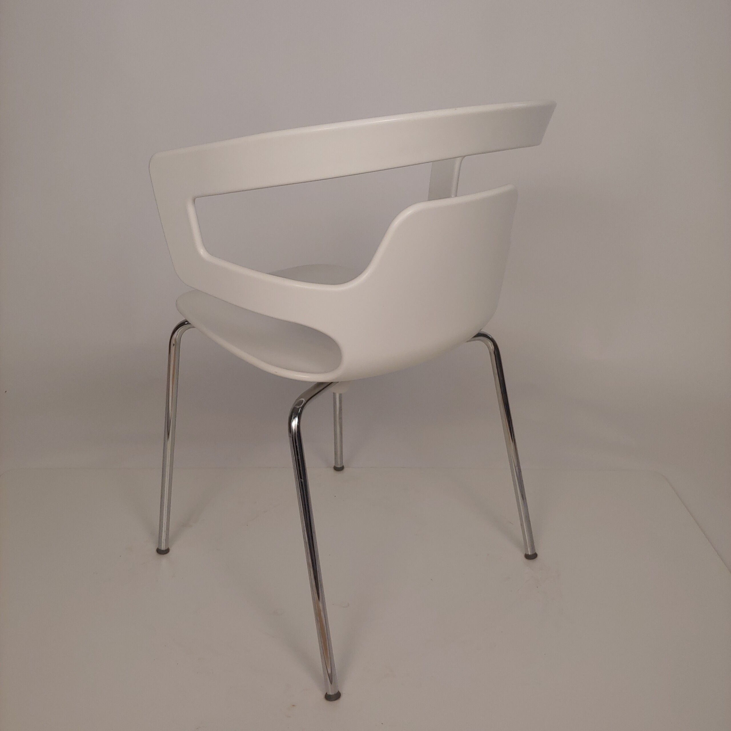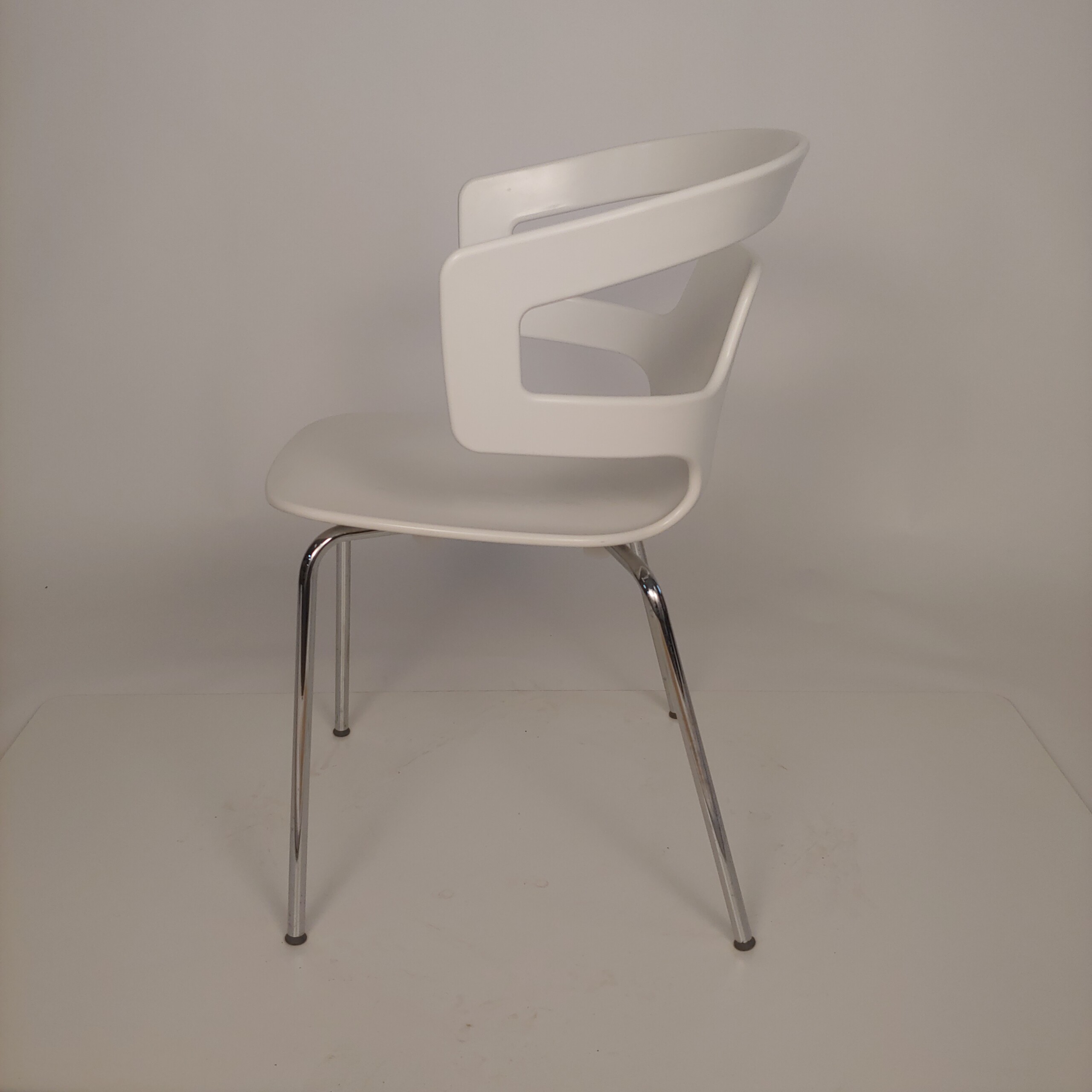 Sits och rygg i plast (vit). Ben i metall (krom).