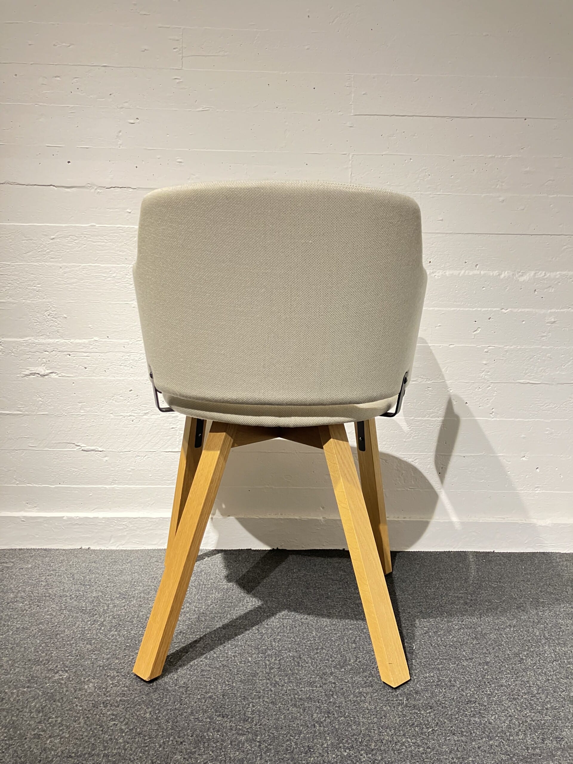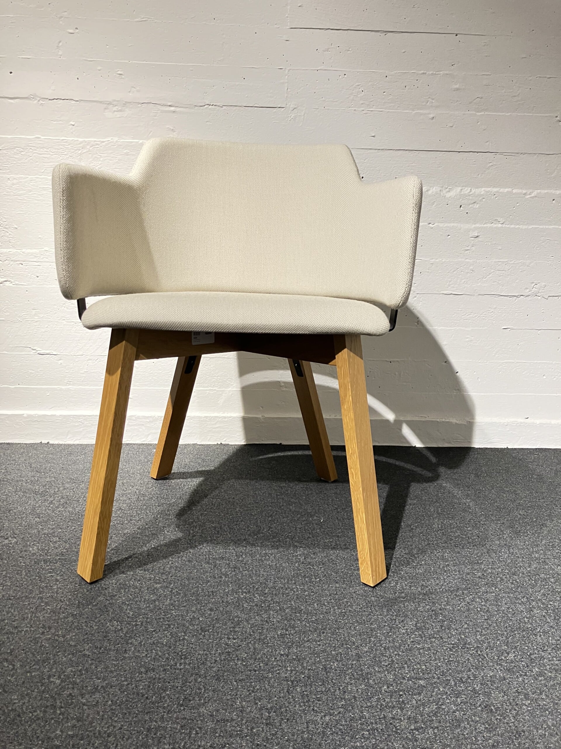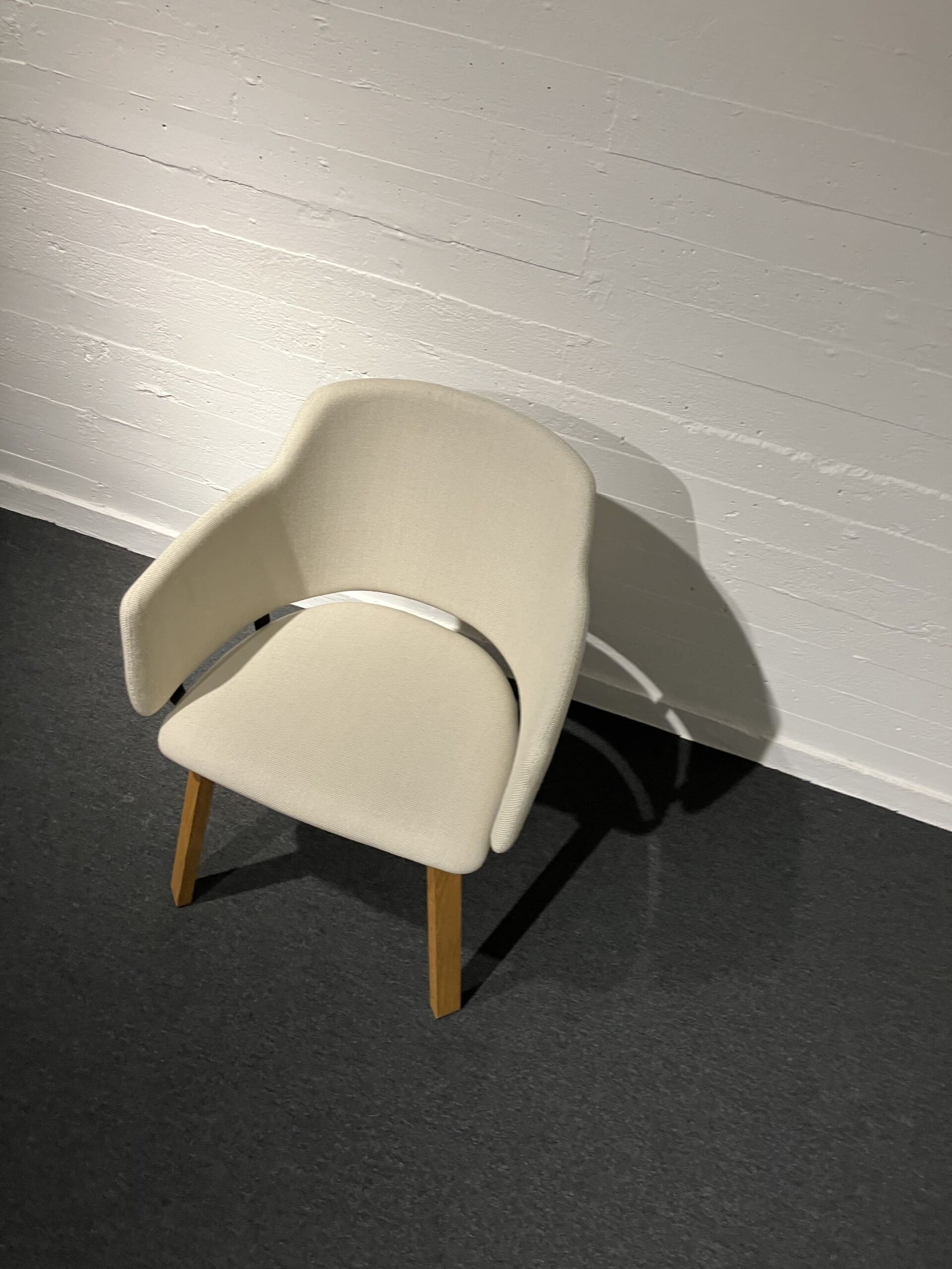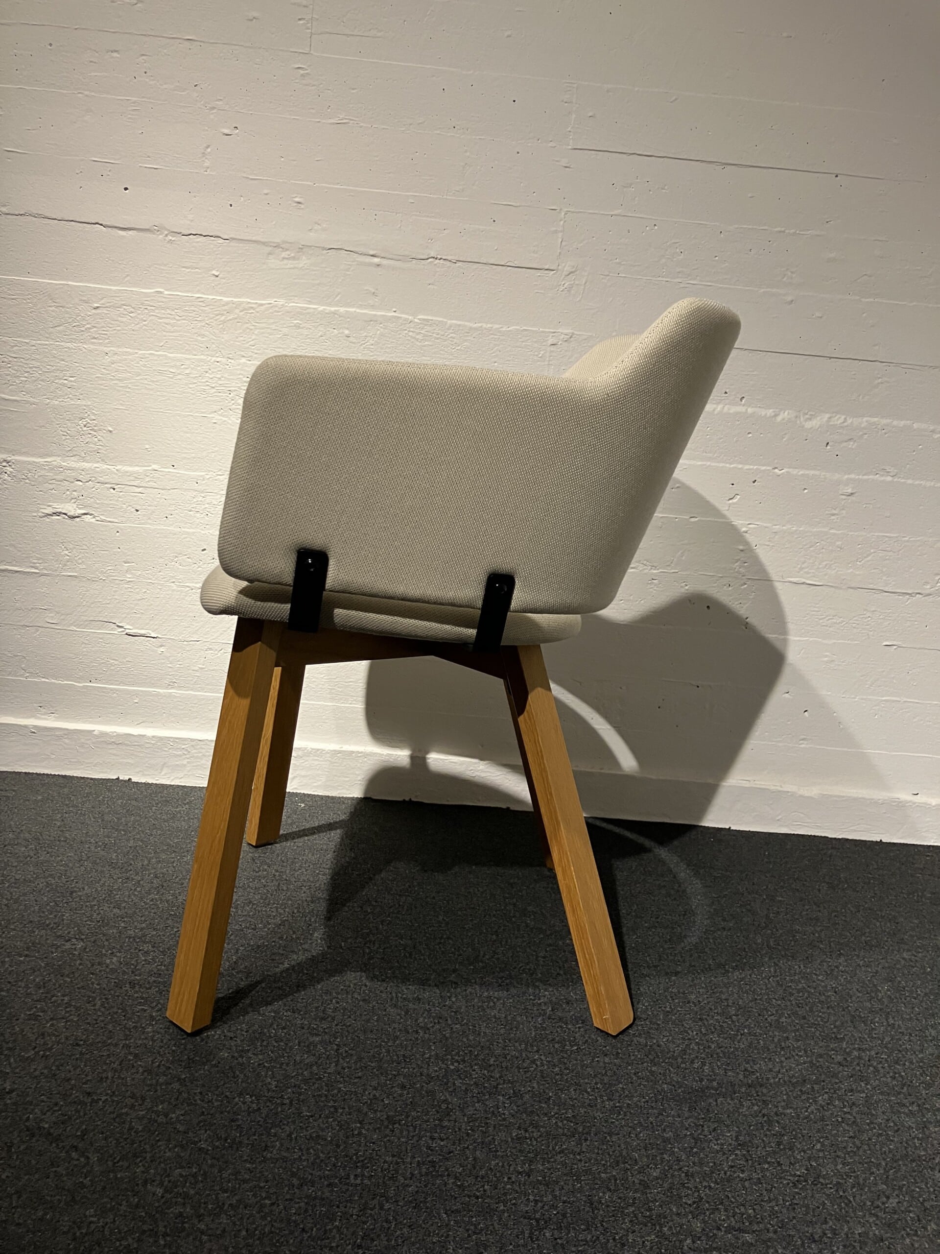Sits och rygg i tyg (beige). Ben i trä (ek).