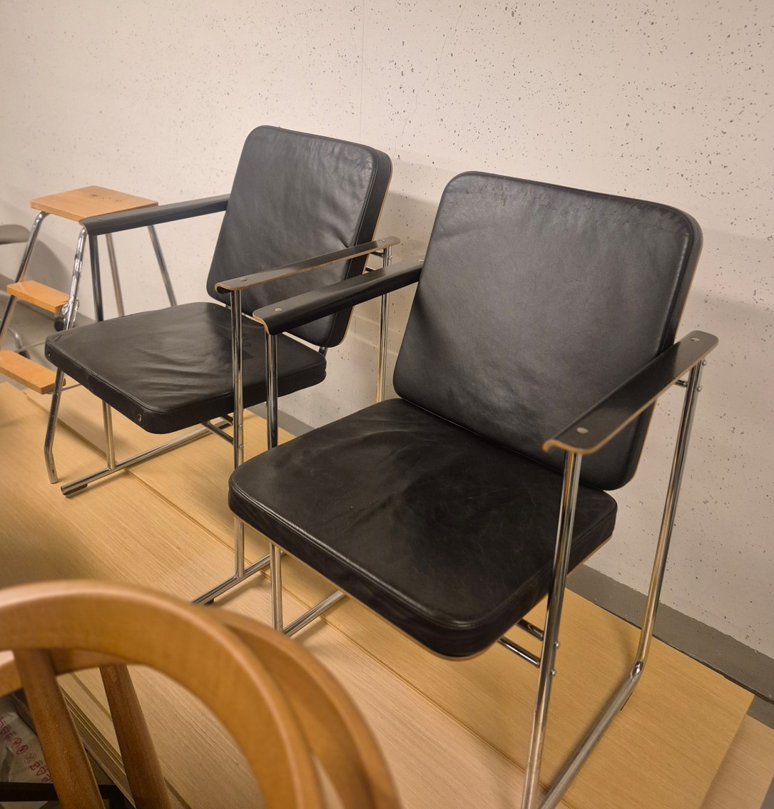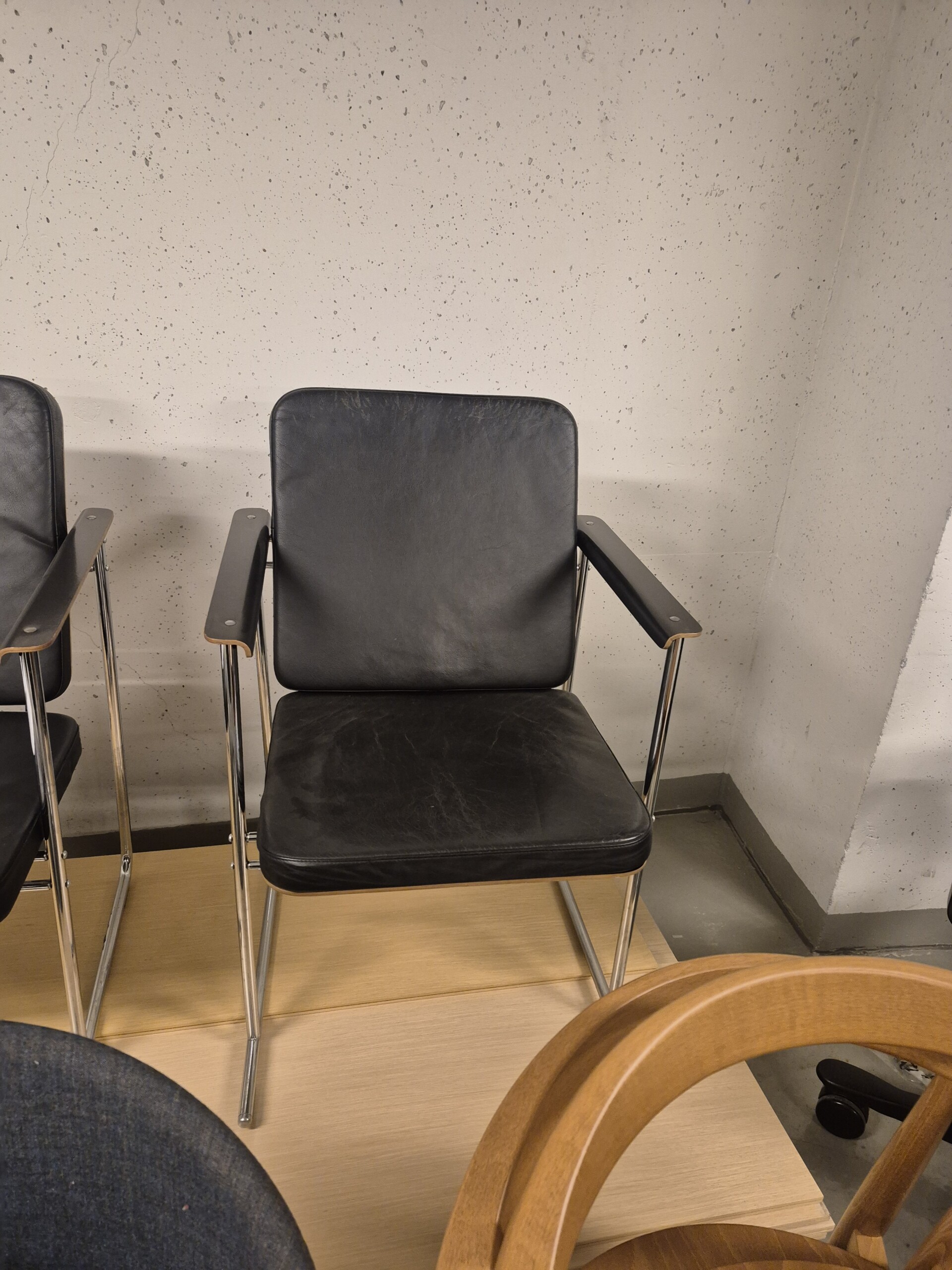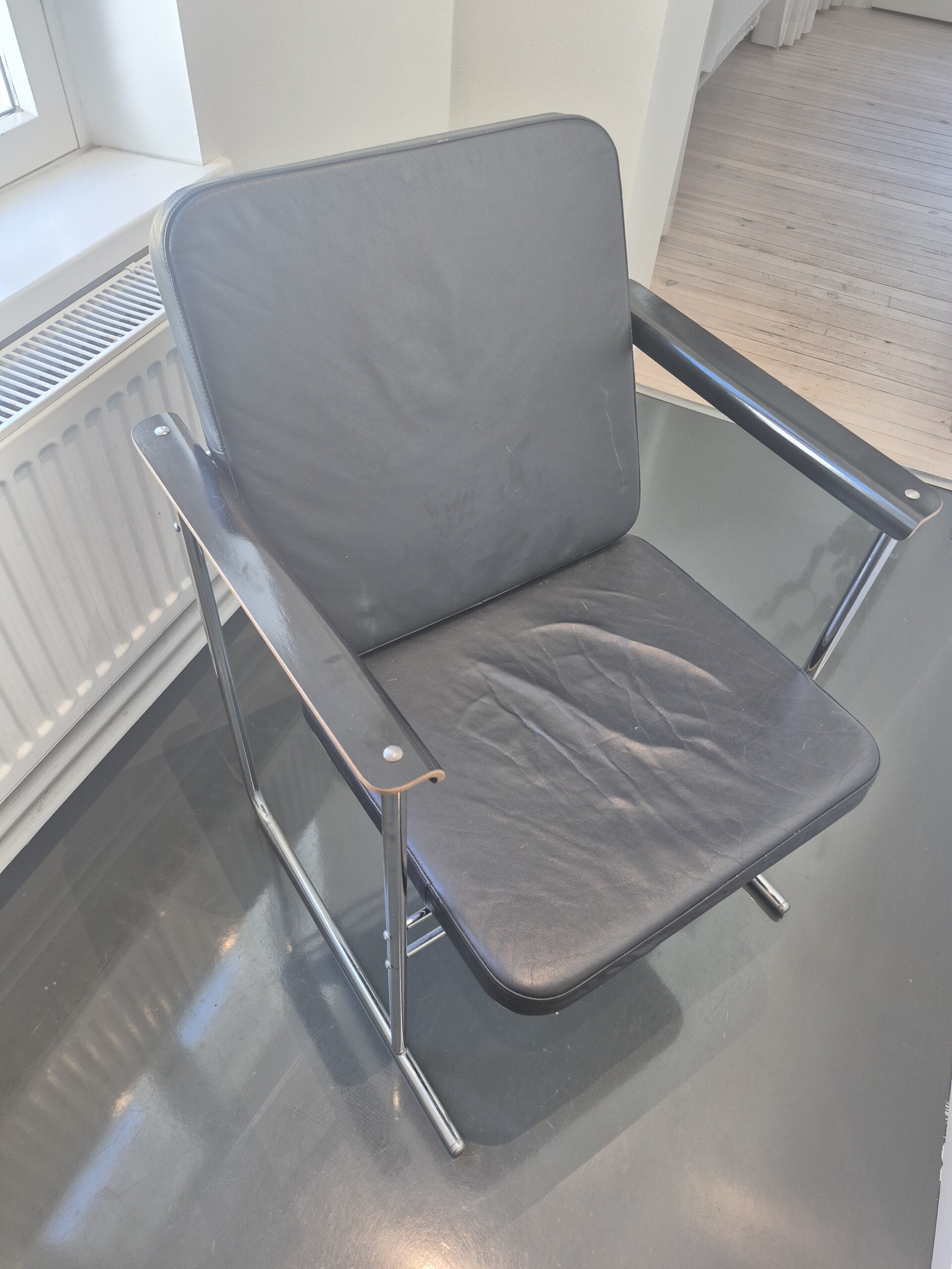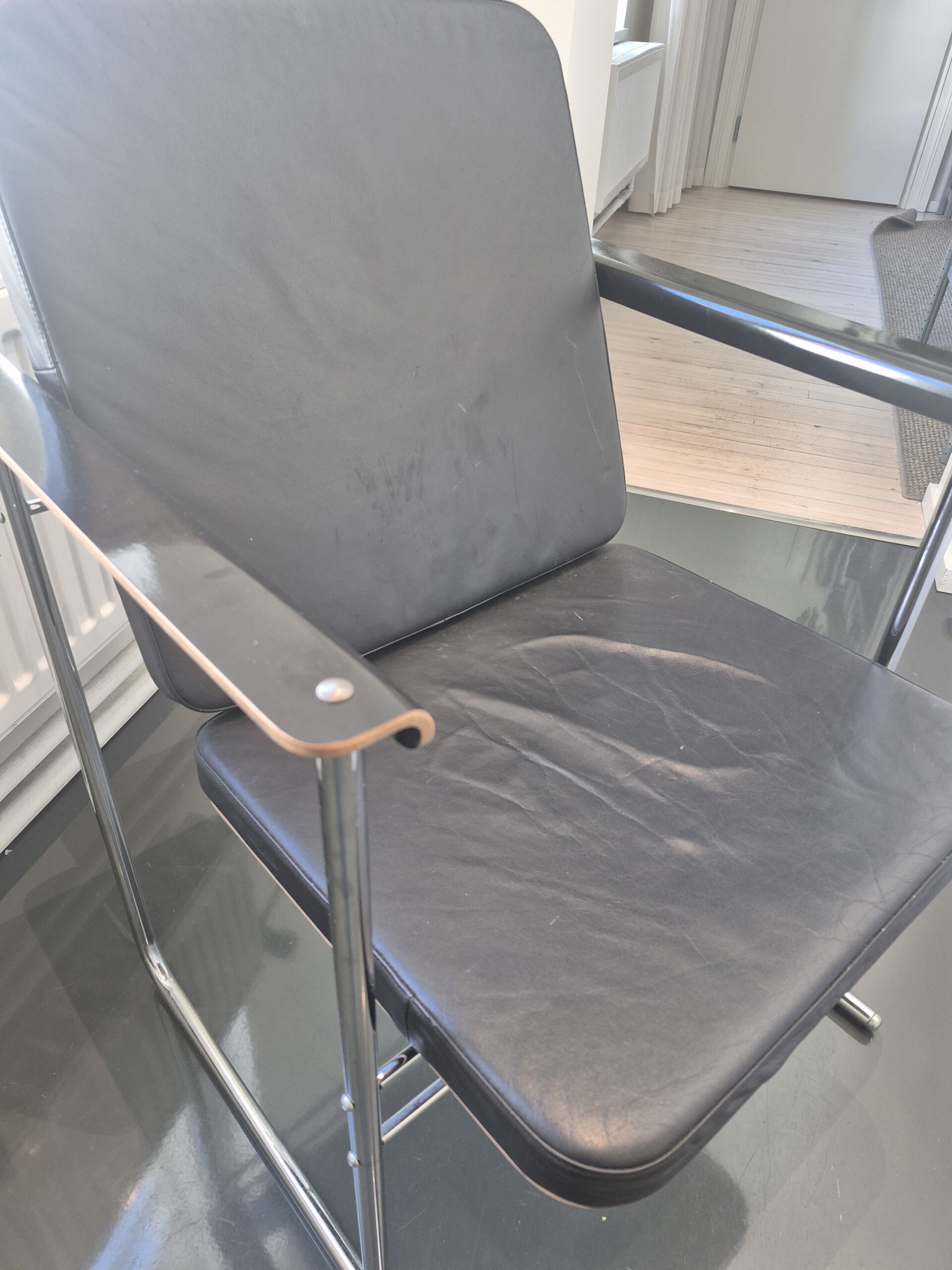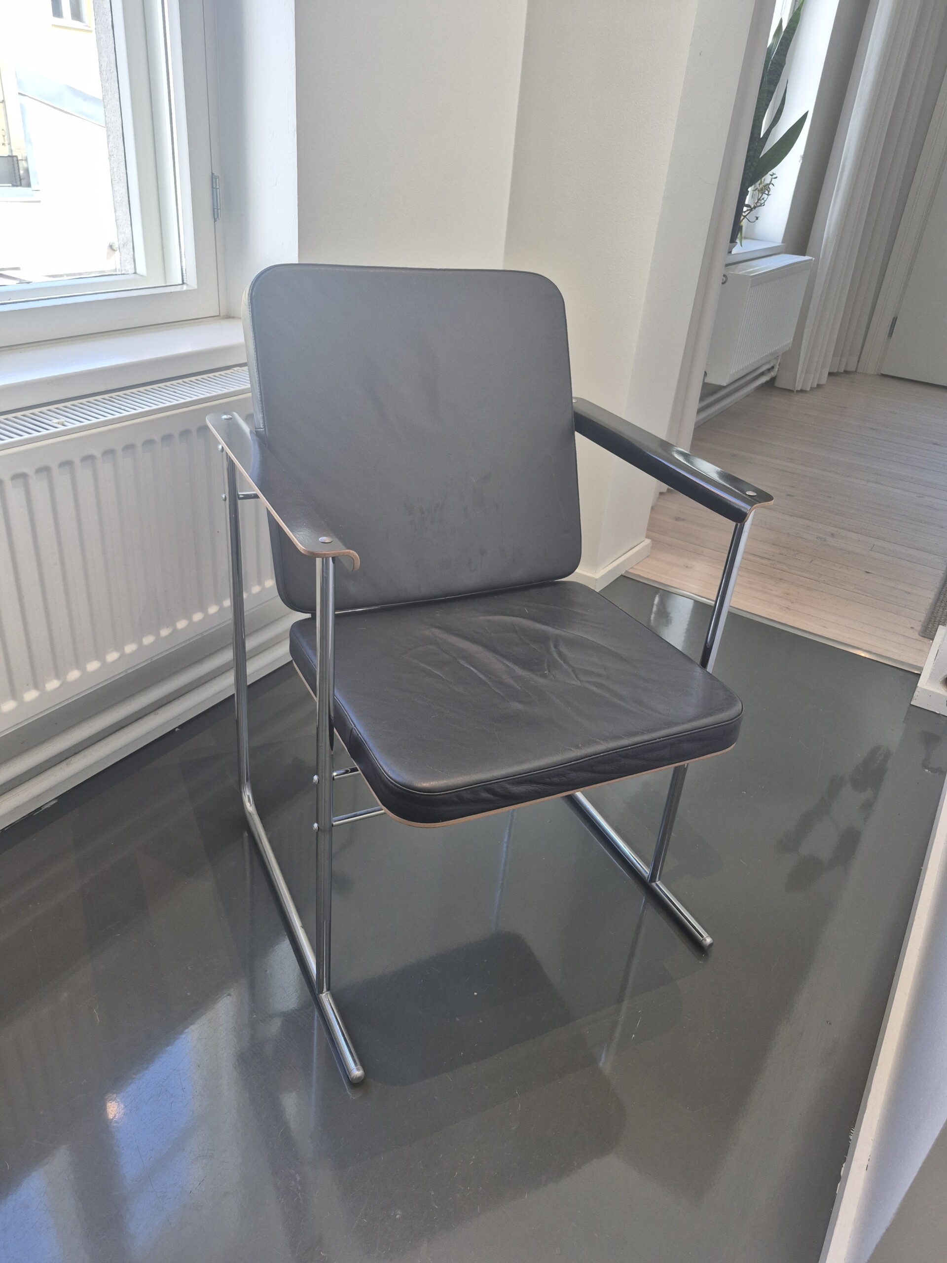Sits i läder (svart). Rygg i trä (svart). Ben i metall (krom).