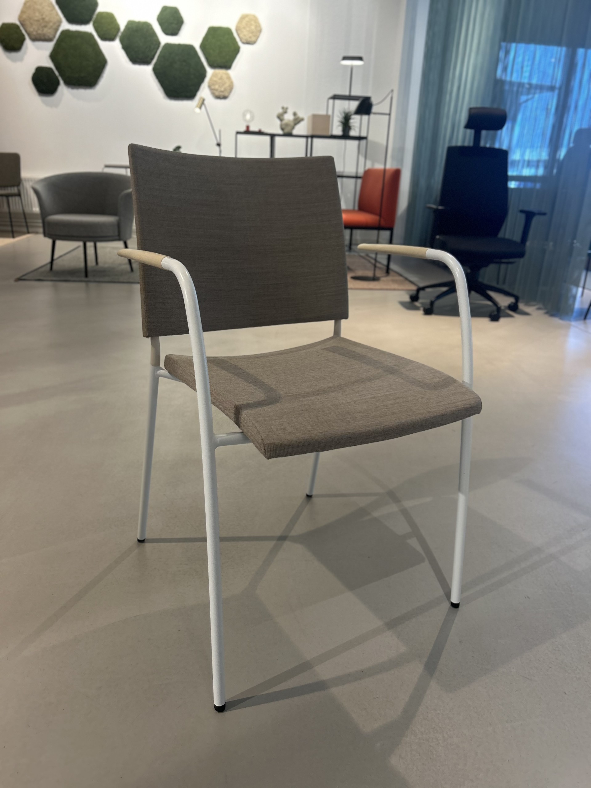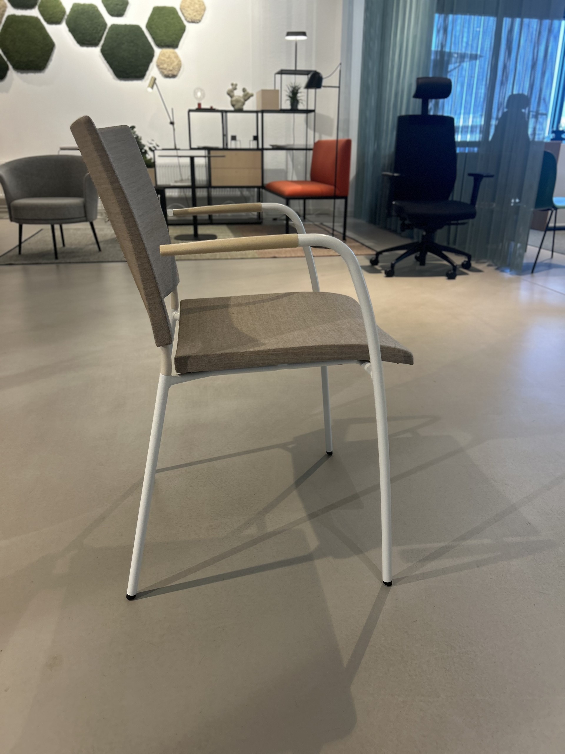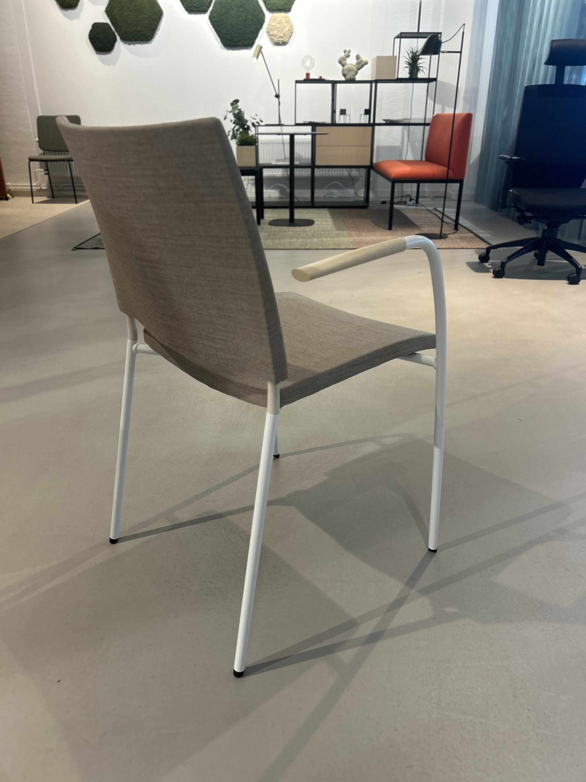 Sits och rygg i tyg (beige). Ben i metall (vit).