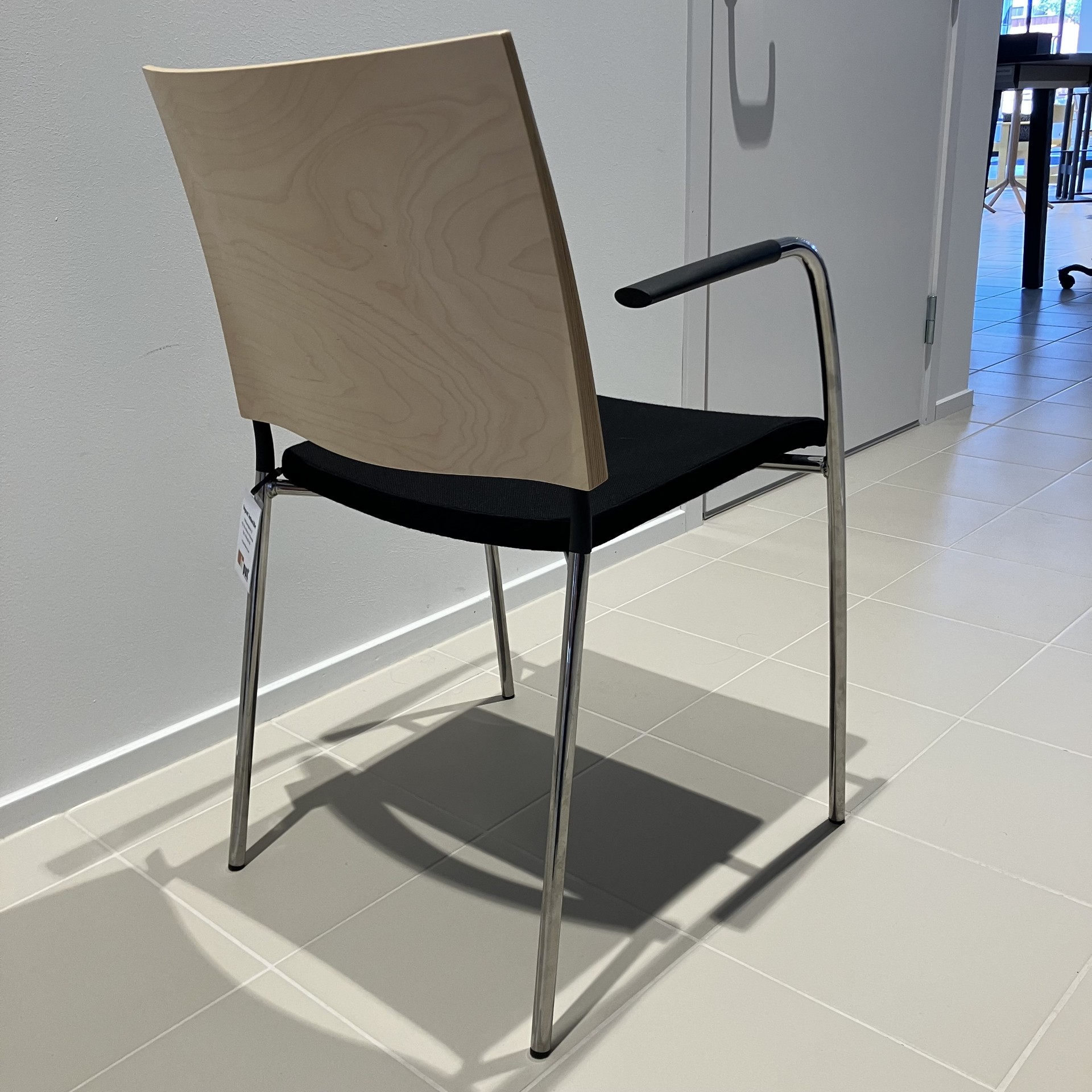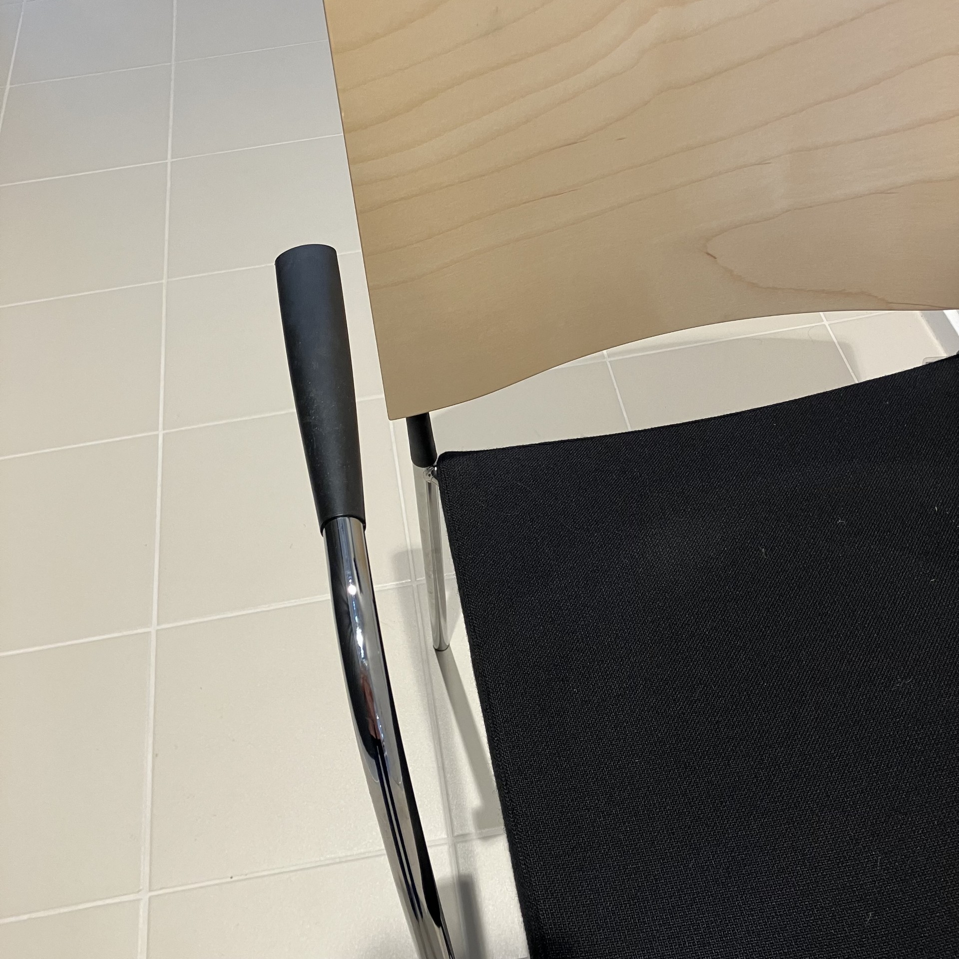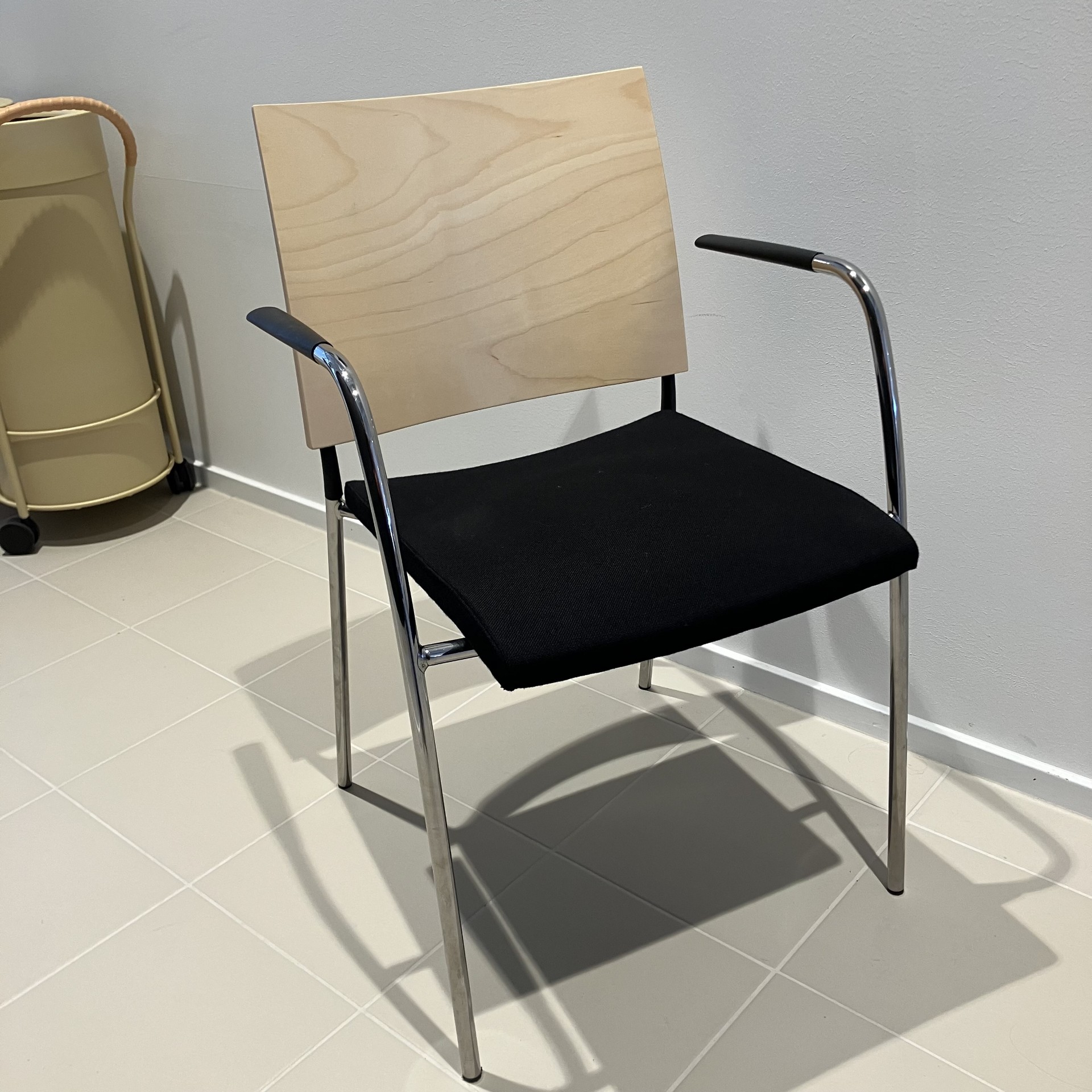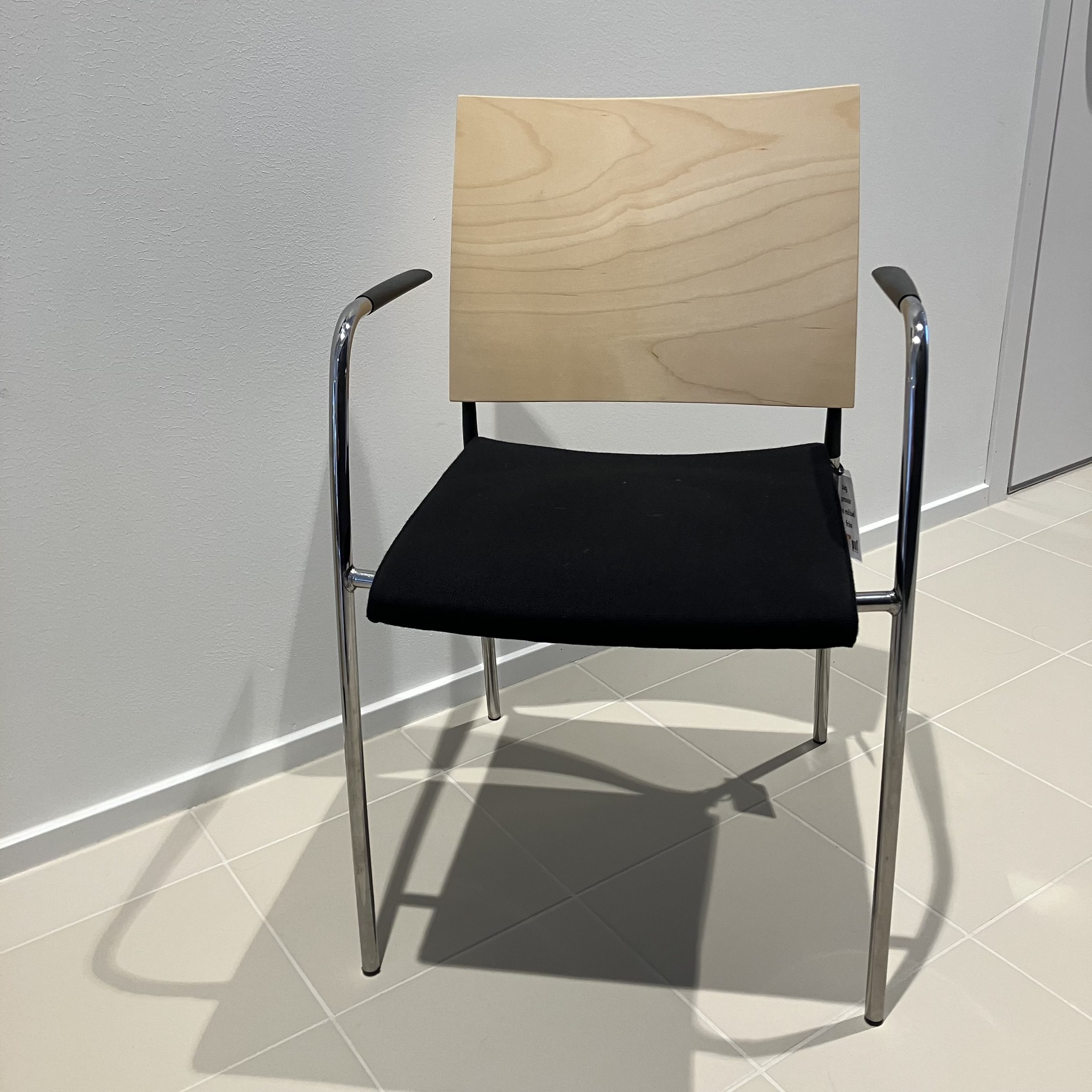 Sits i tyg (svart). Rygg i trä (björk). Ben i metall (krom).