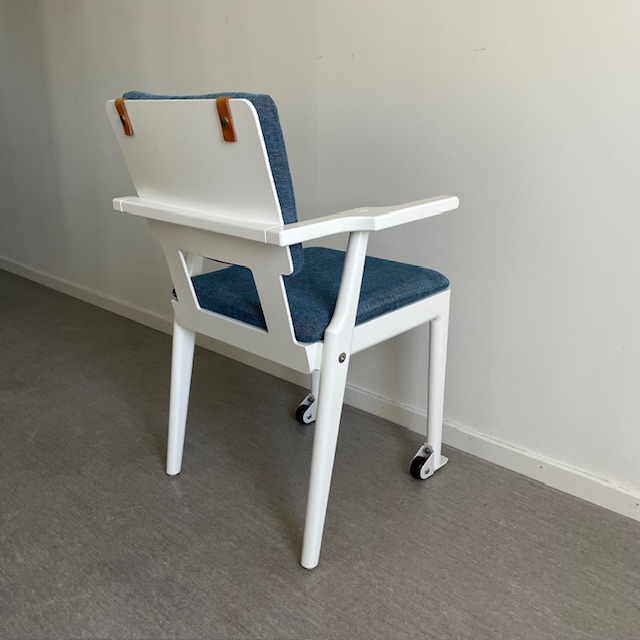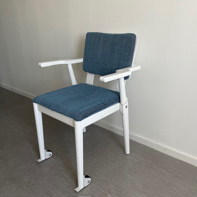 Sits och rygg i tyg (blå). Ben i trä (vit).