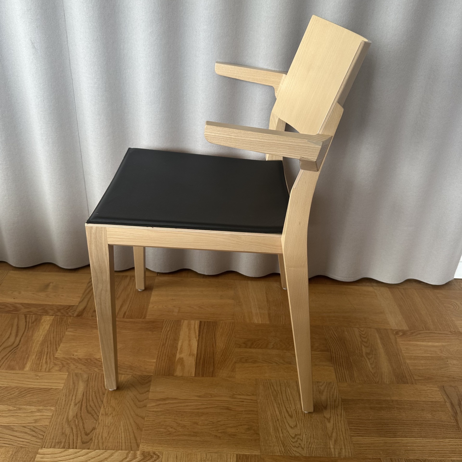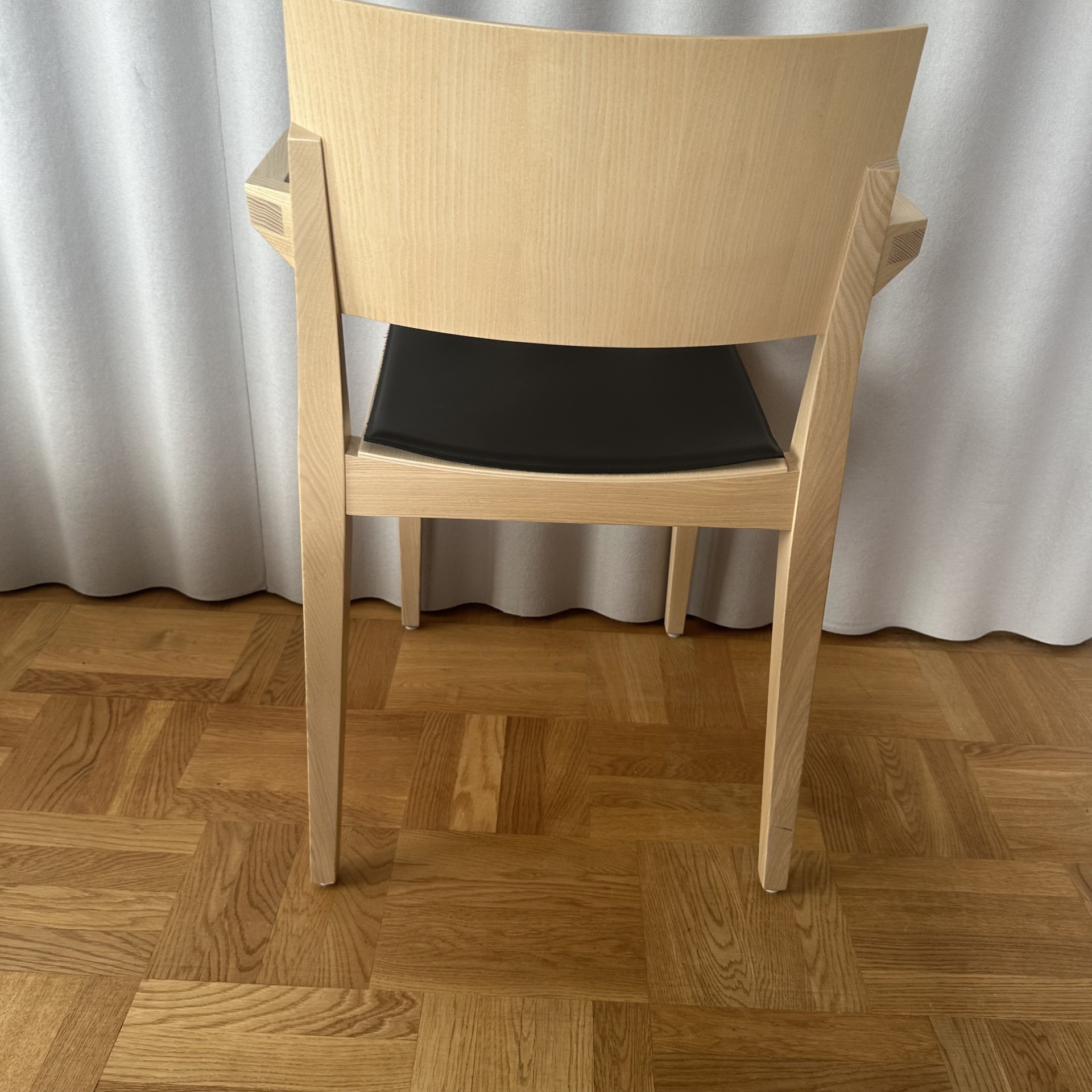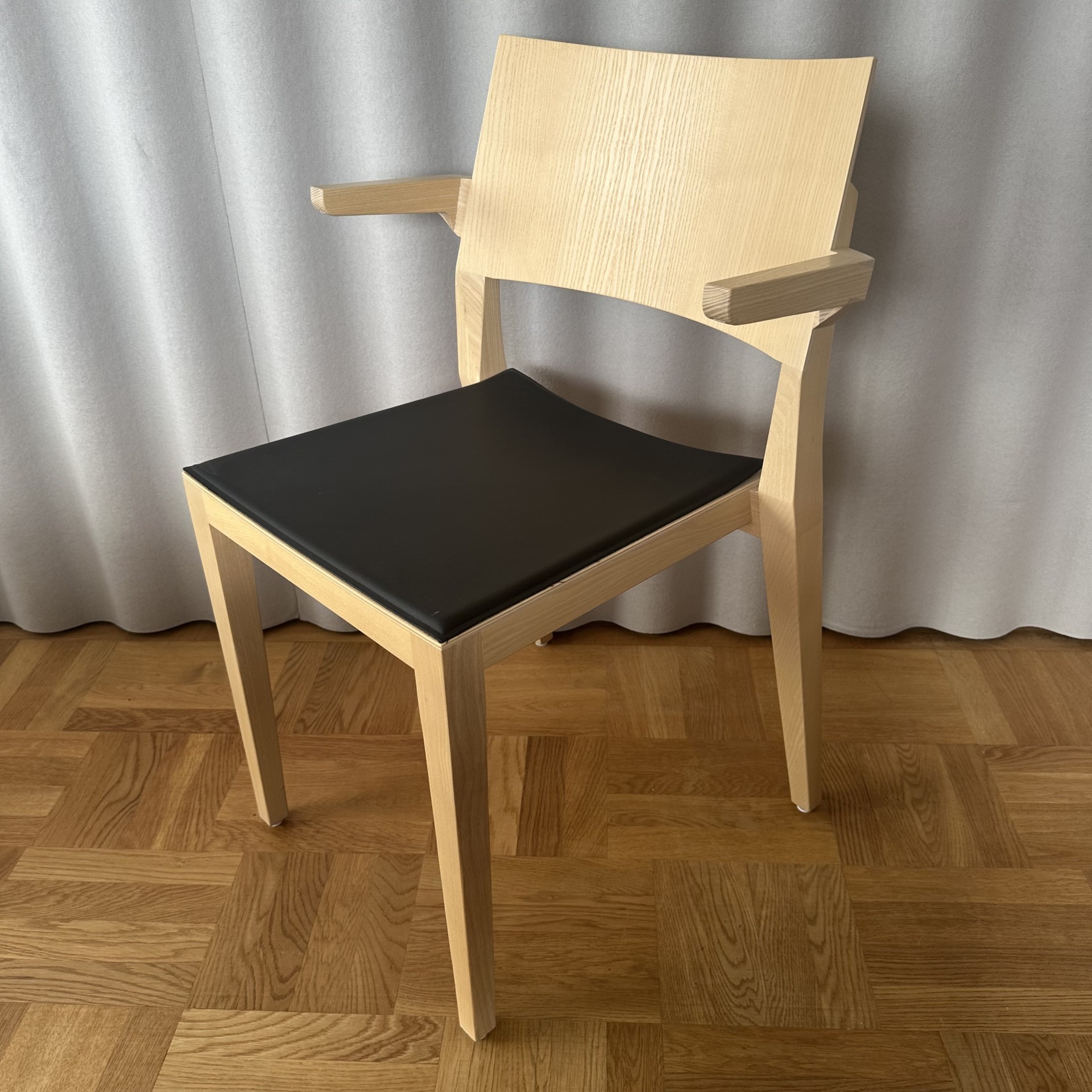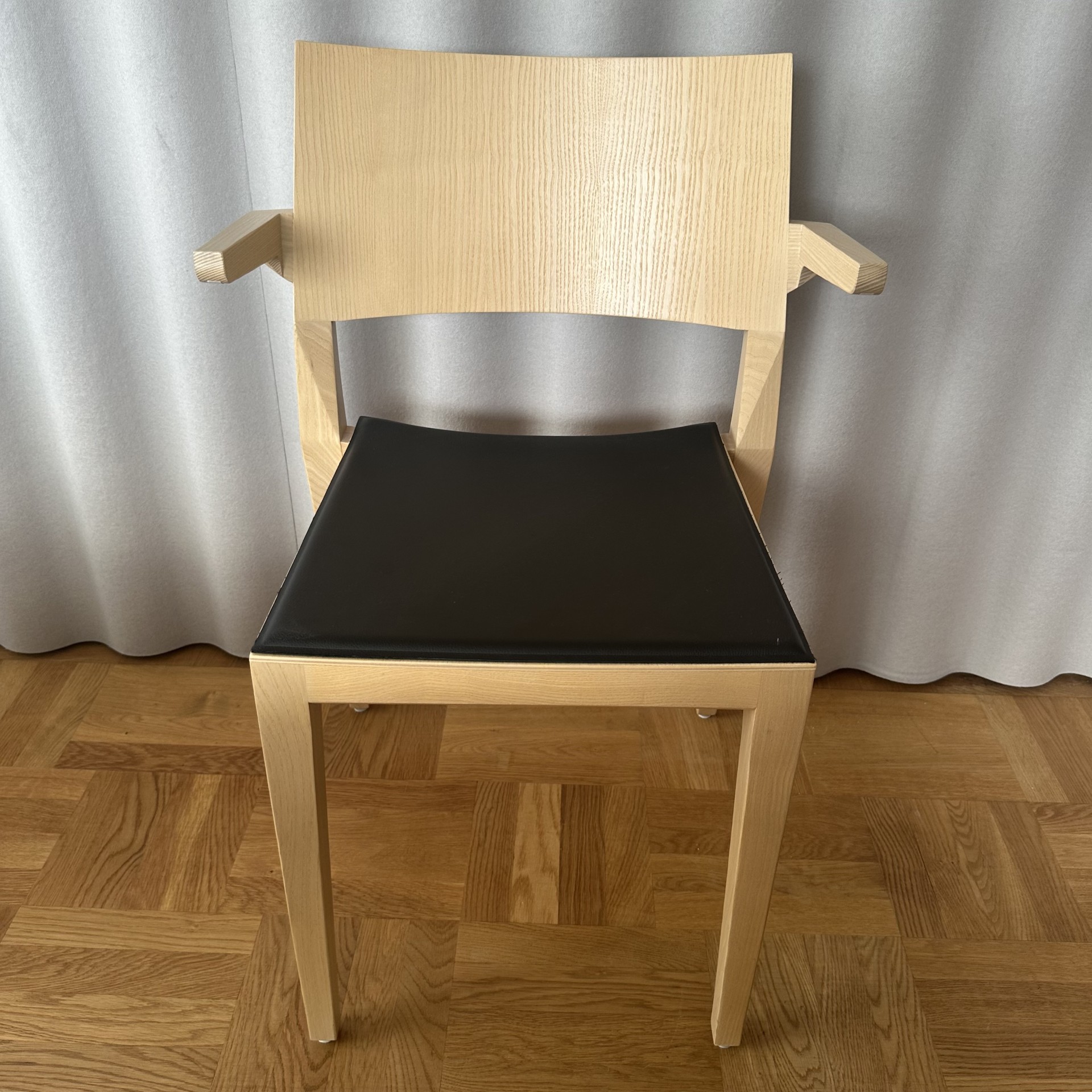 Sits i läder (svart). Rygg i trä (ask). Ben i trä (ask).