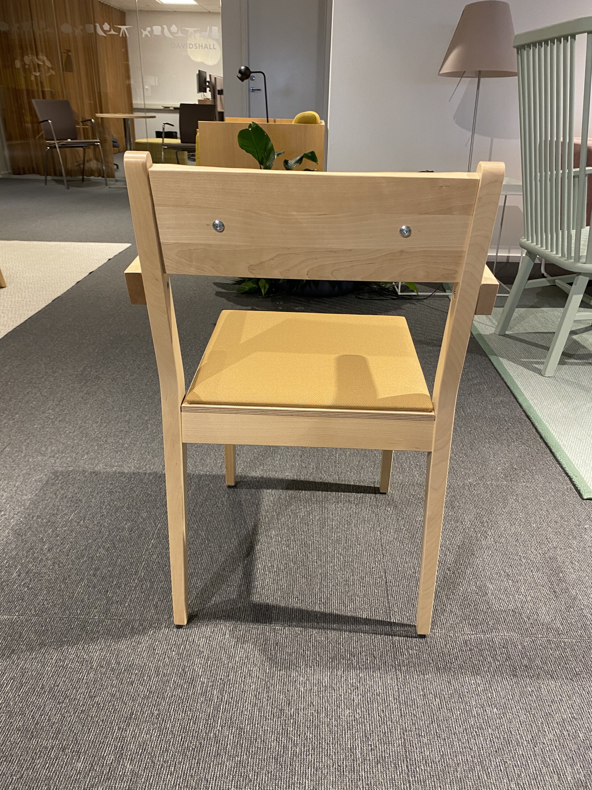 Sits och rygg i konstläder (gul). Ben i trä (björk).