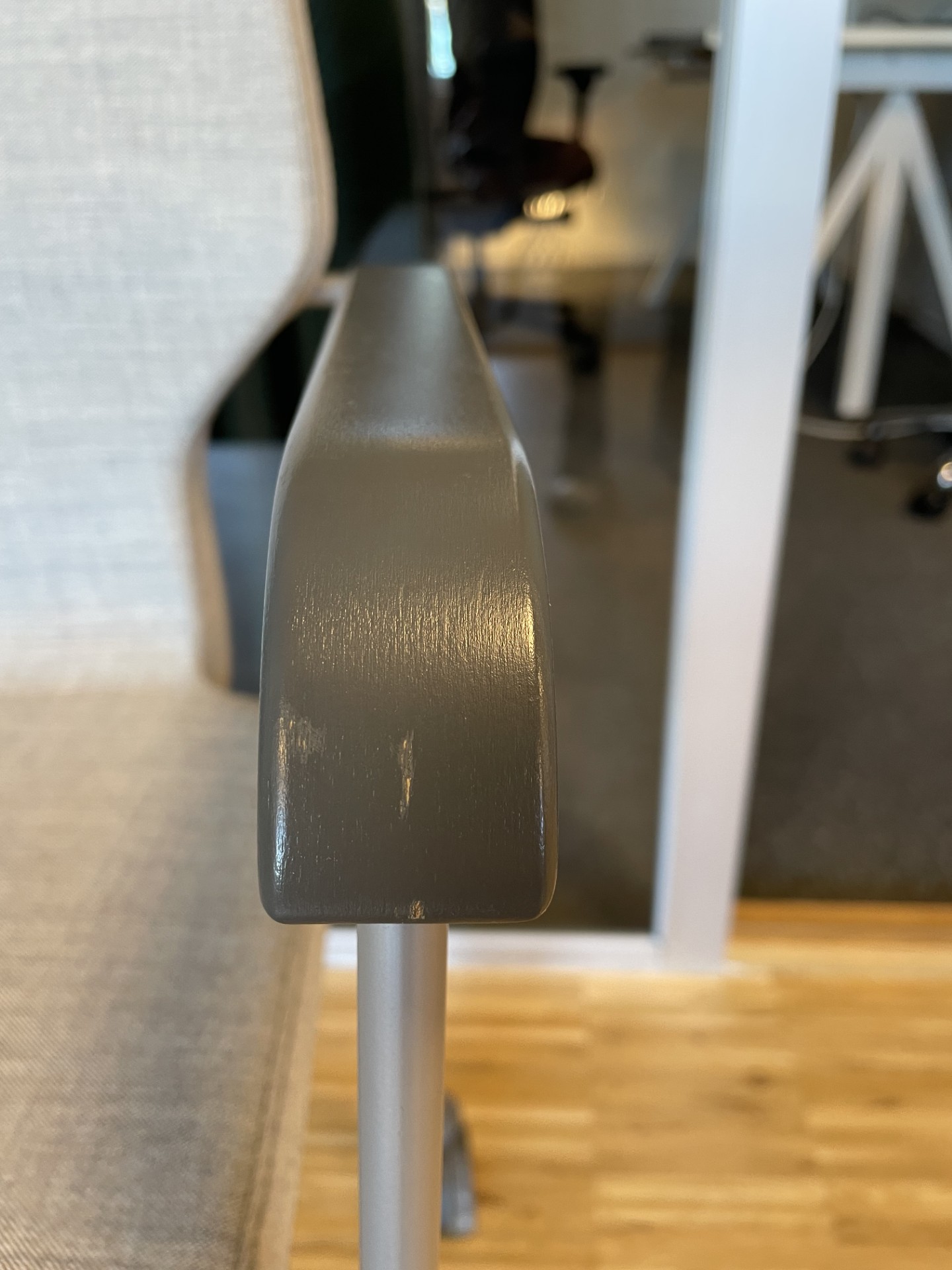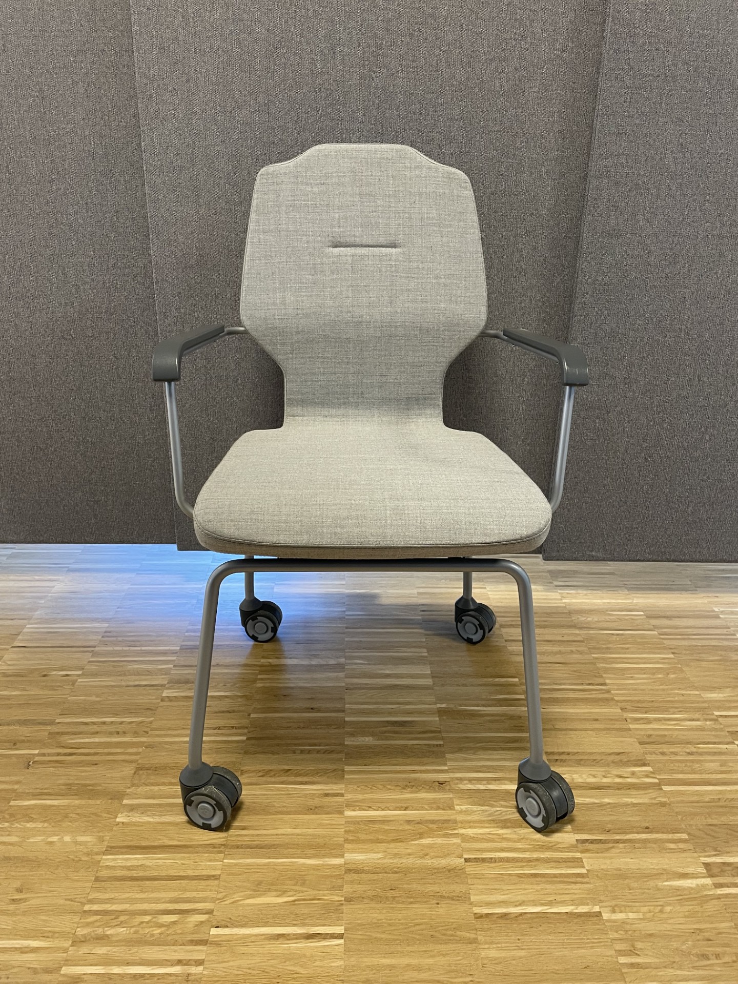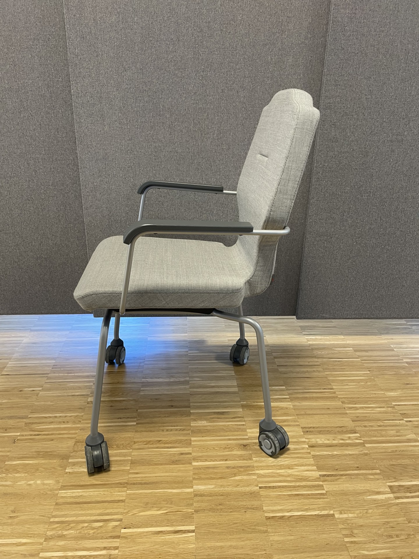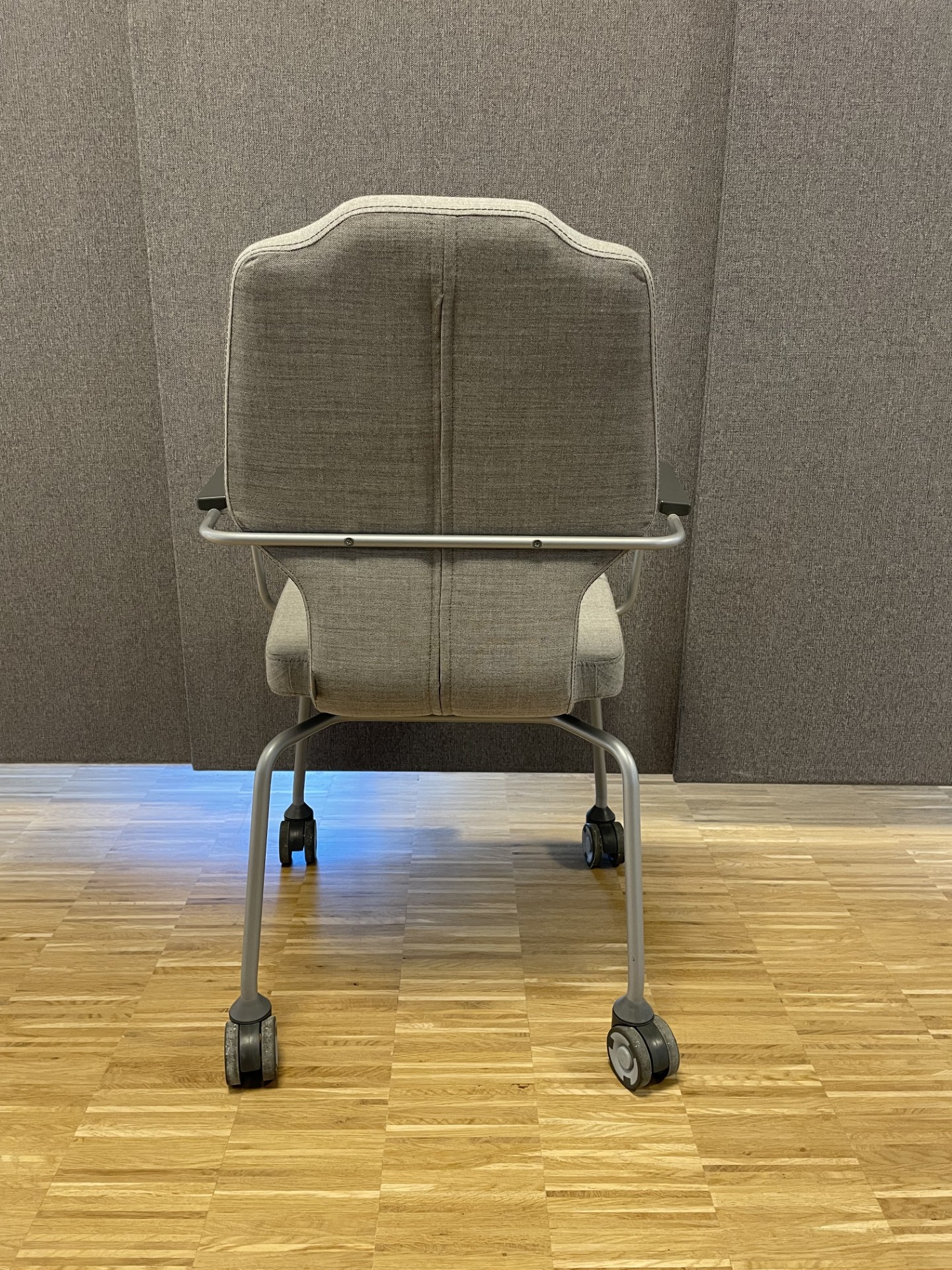 Sits och rygg i tyg (grå). Ben i metall (silver).