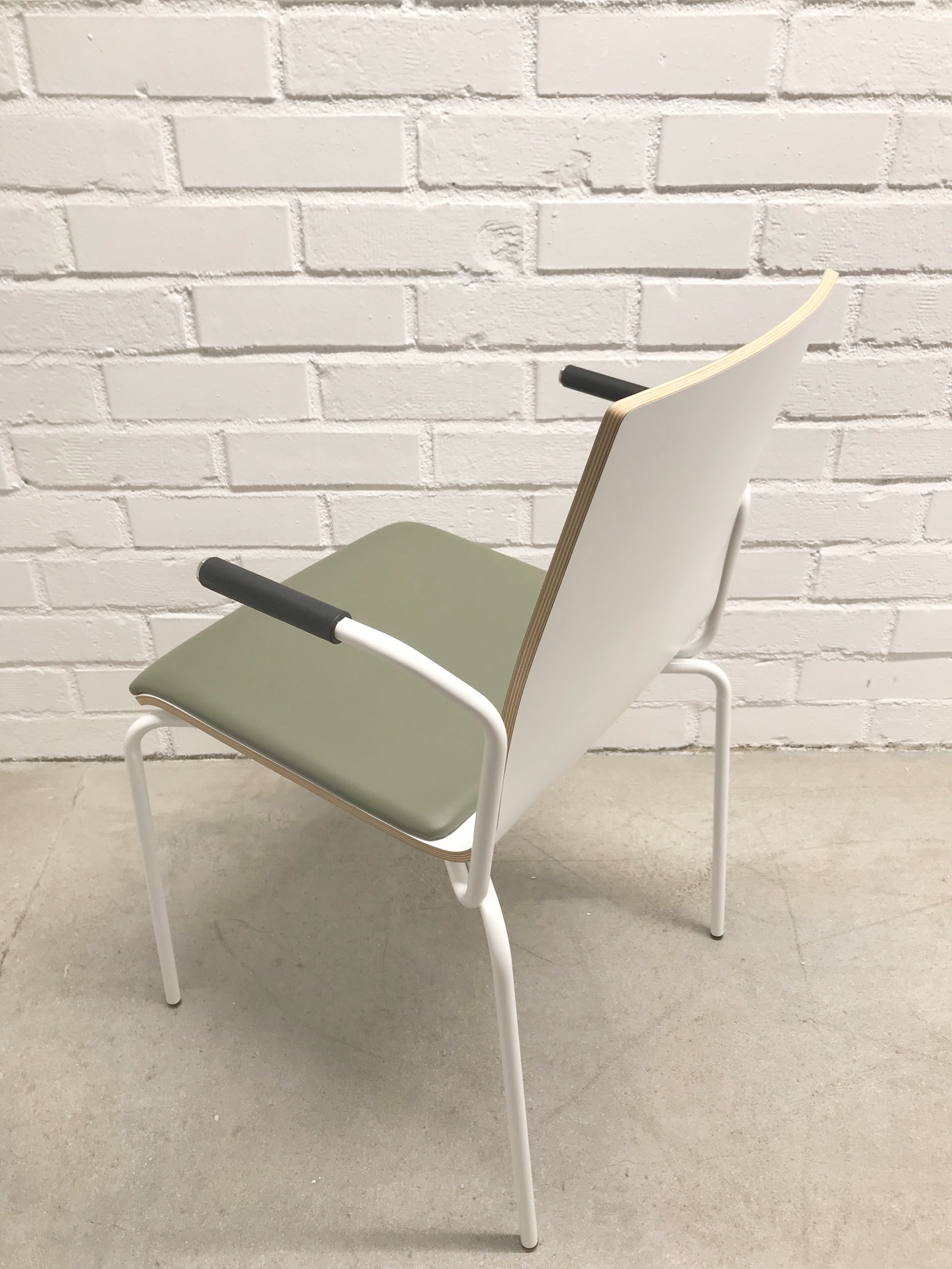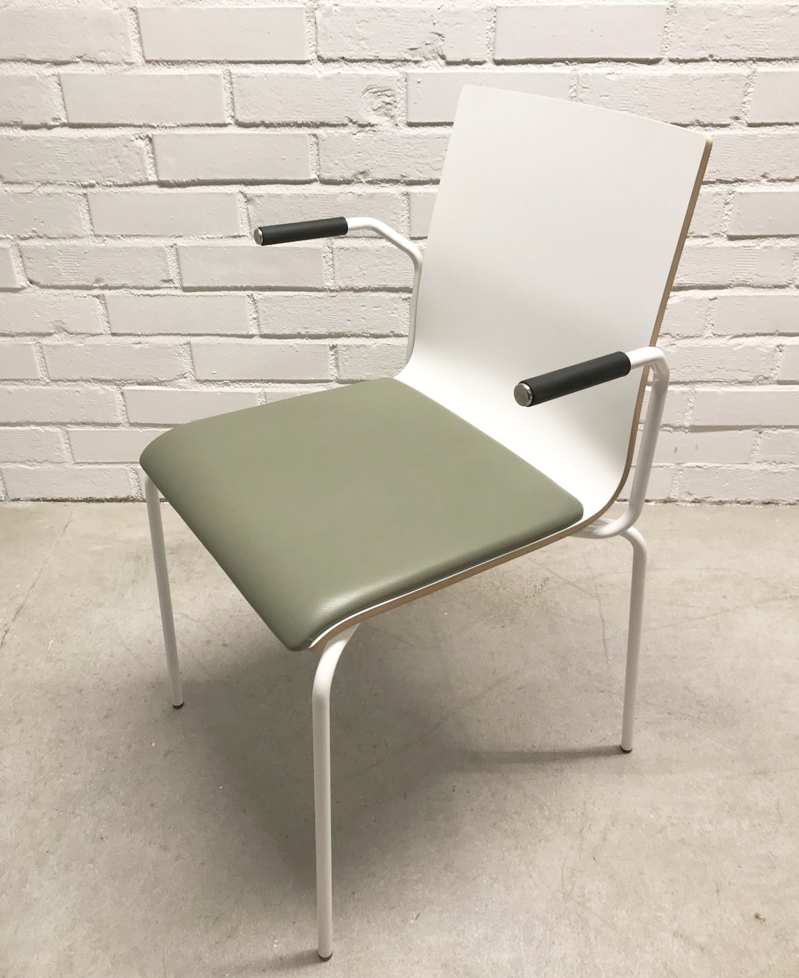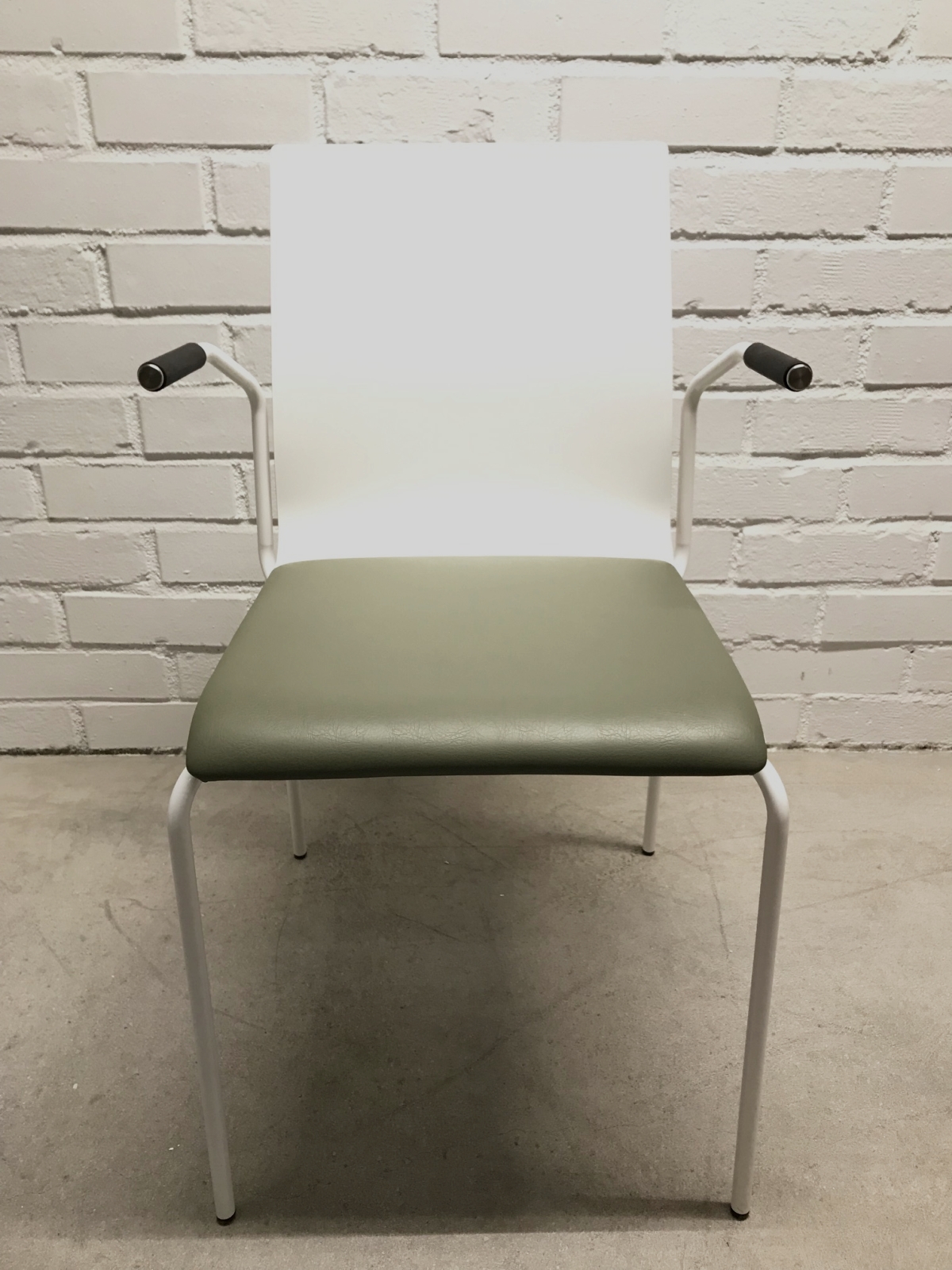Sits i konstläder (grön). Rygg i trä (vit). Ben i metall (vit).