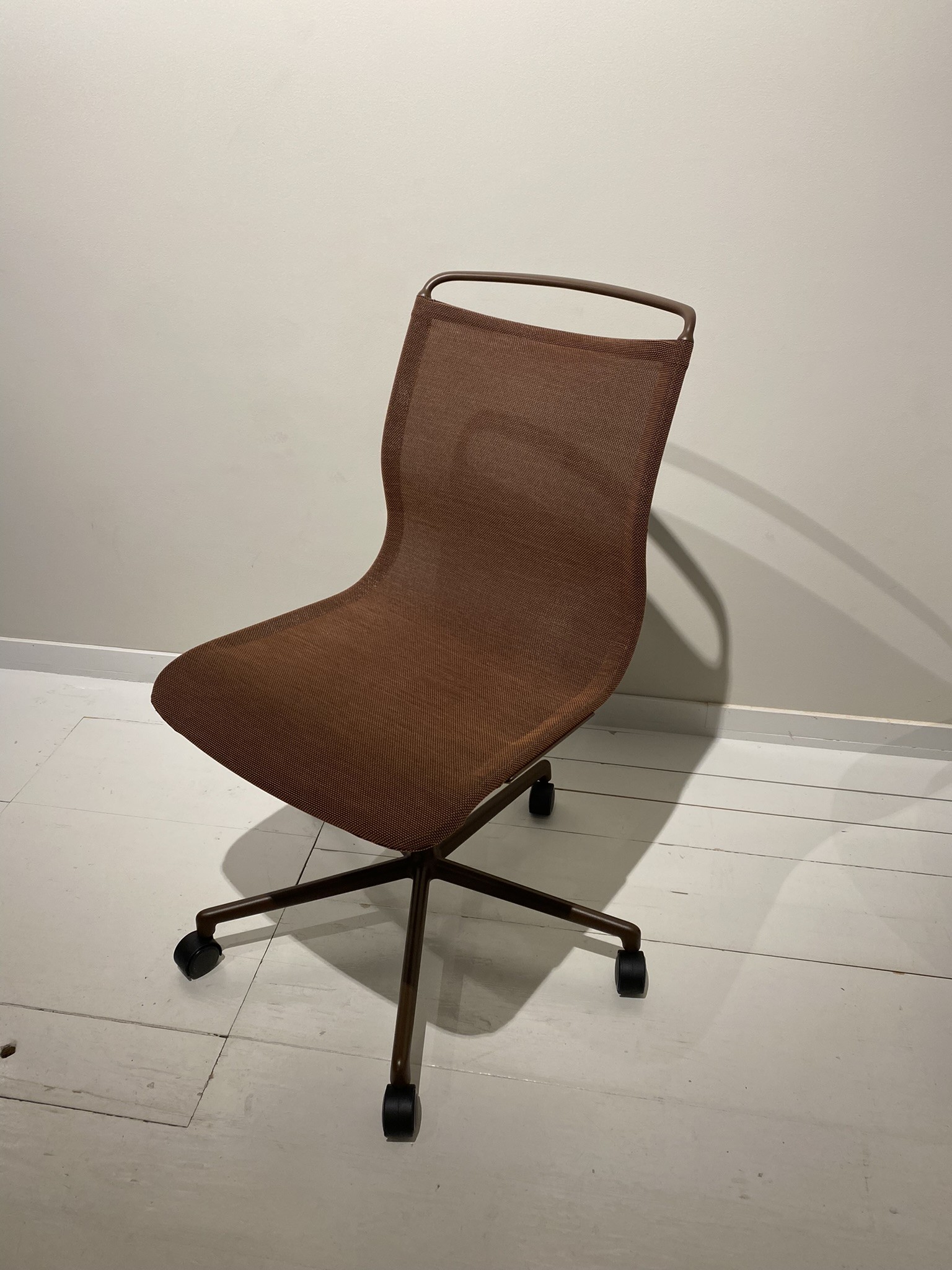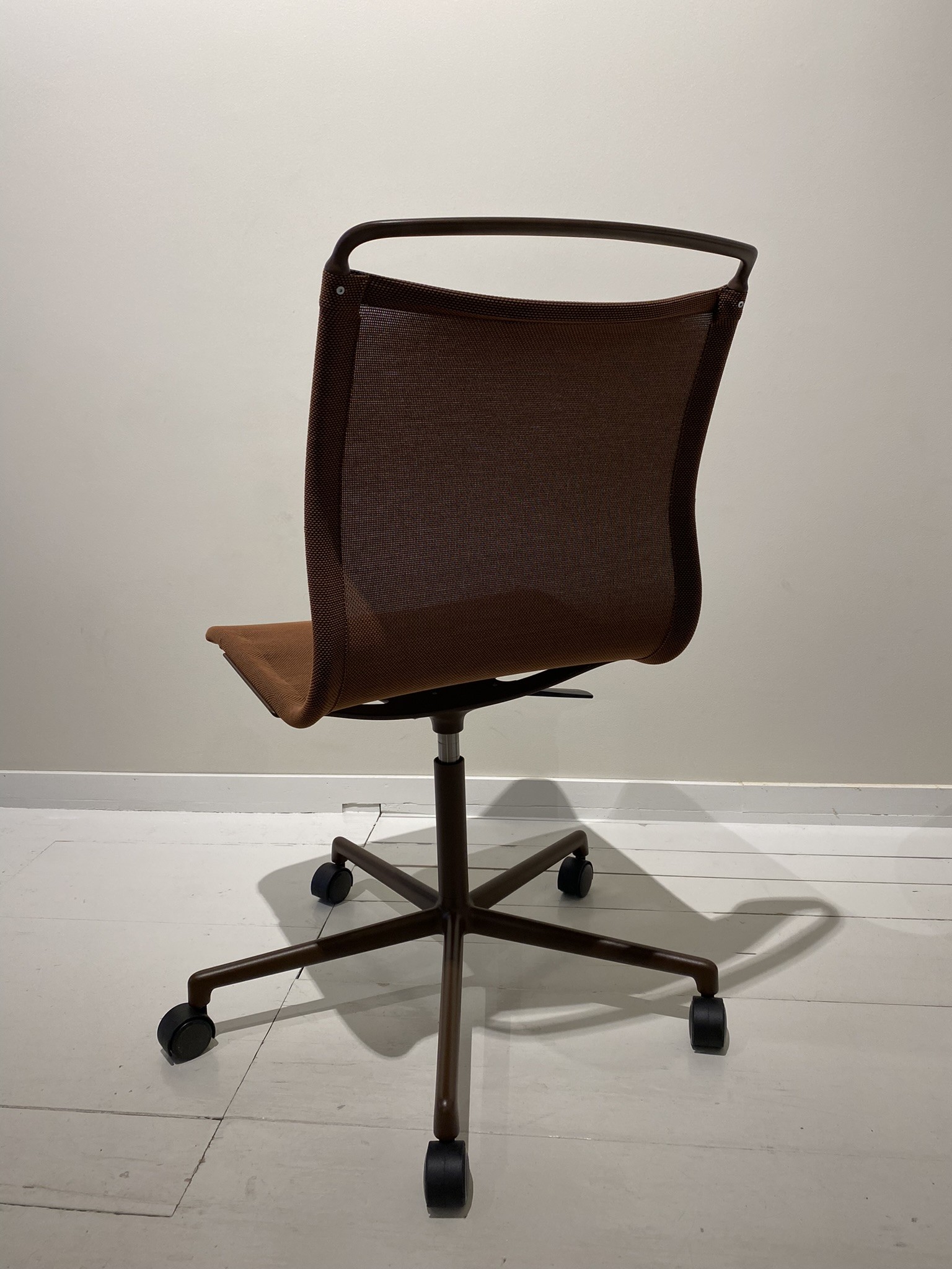 Sits och rygg i mesh (brun). Kryssfot i metall (brun). Höj- och sänkbar.