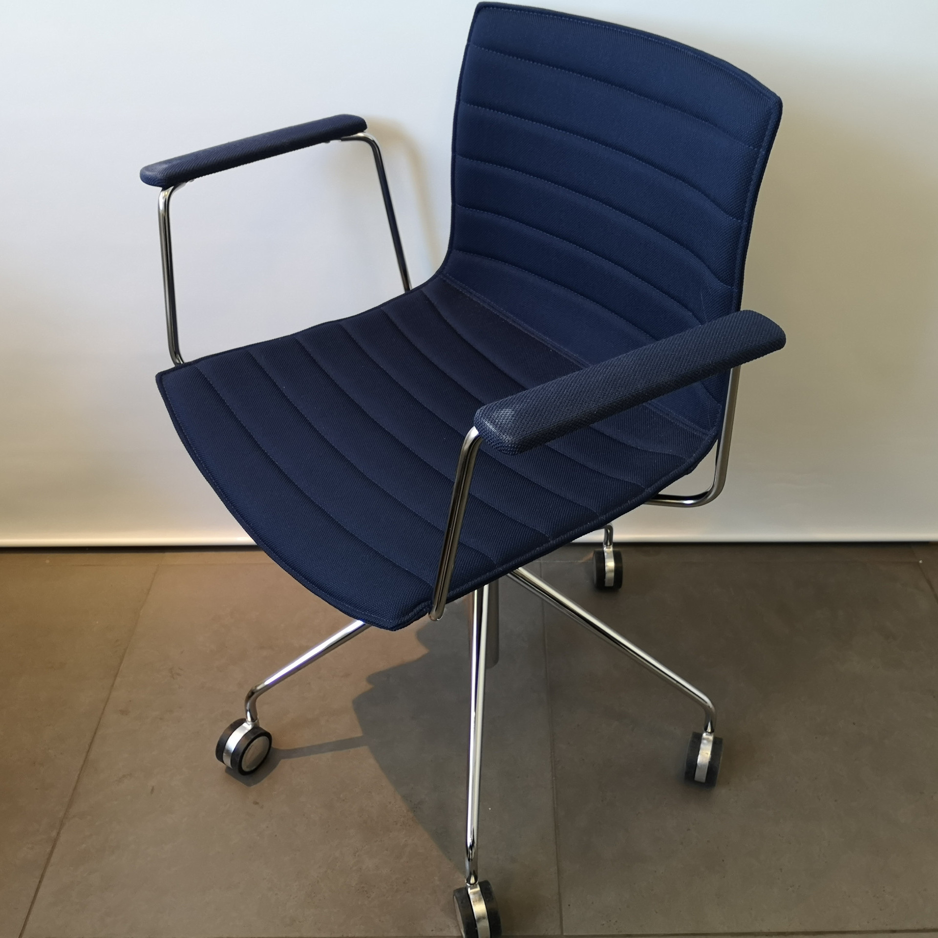 Sits och rygg i tyg (blå). Kryssfot i metall (krom). Höj- och sänkbar.
