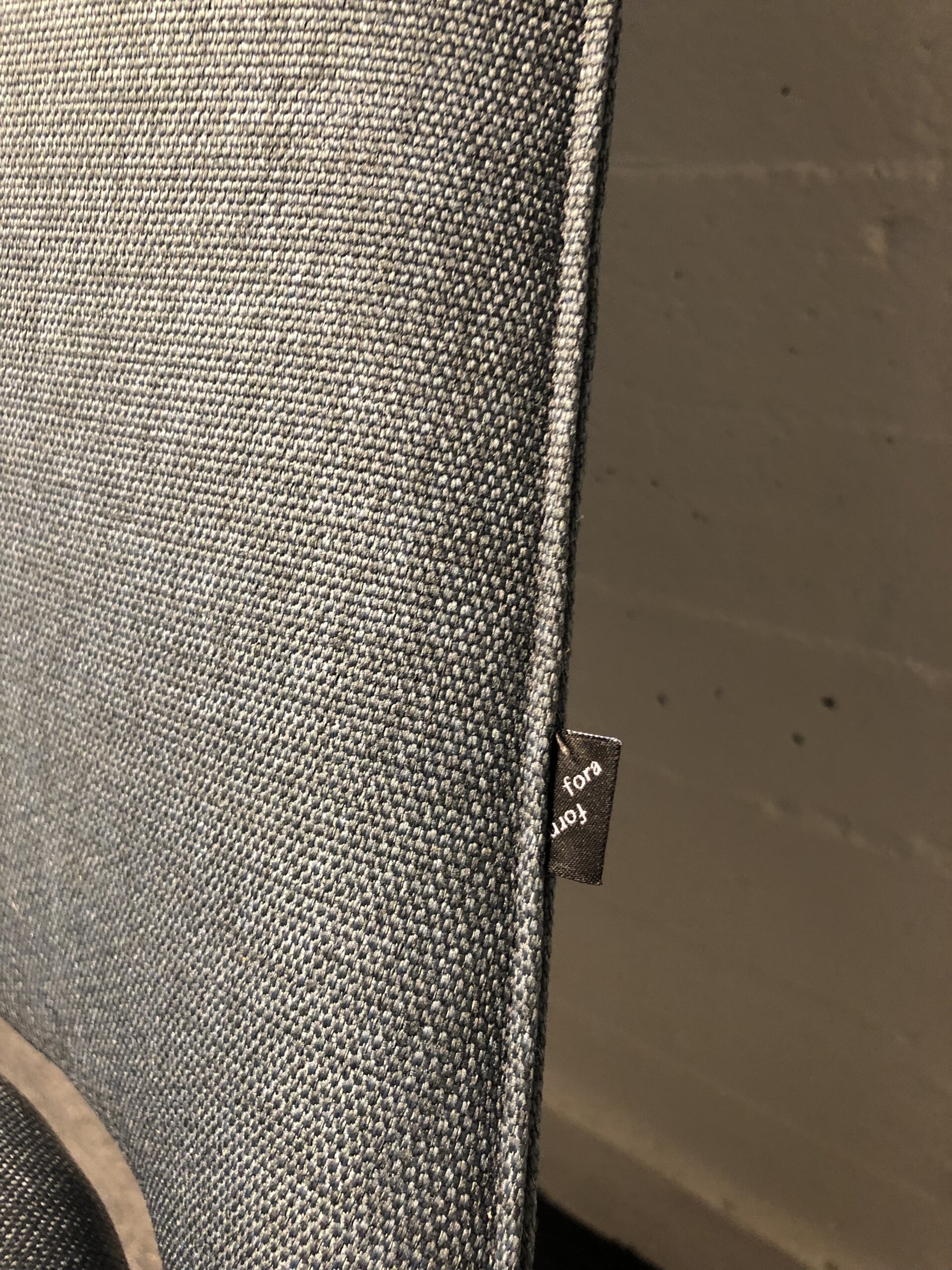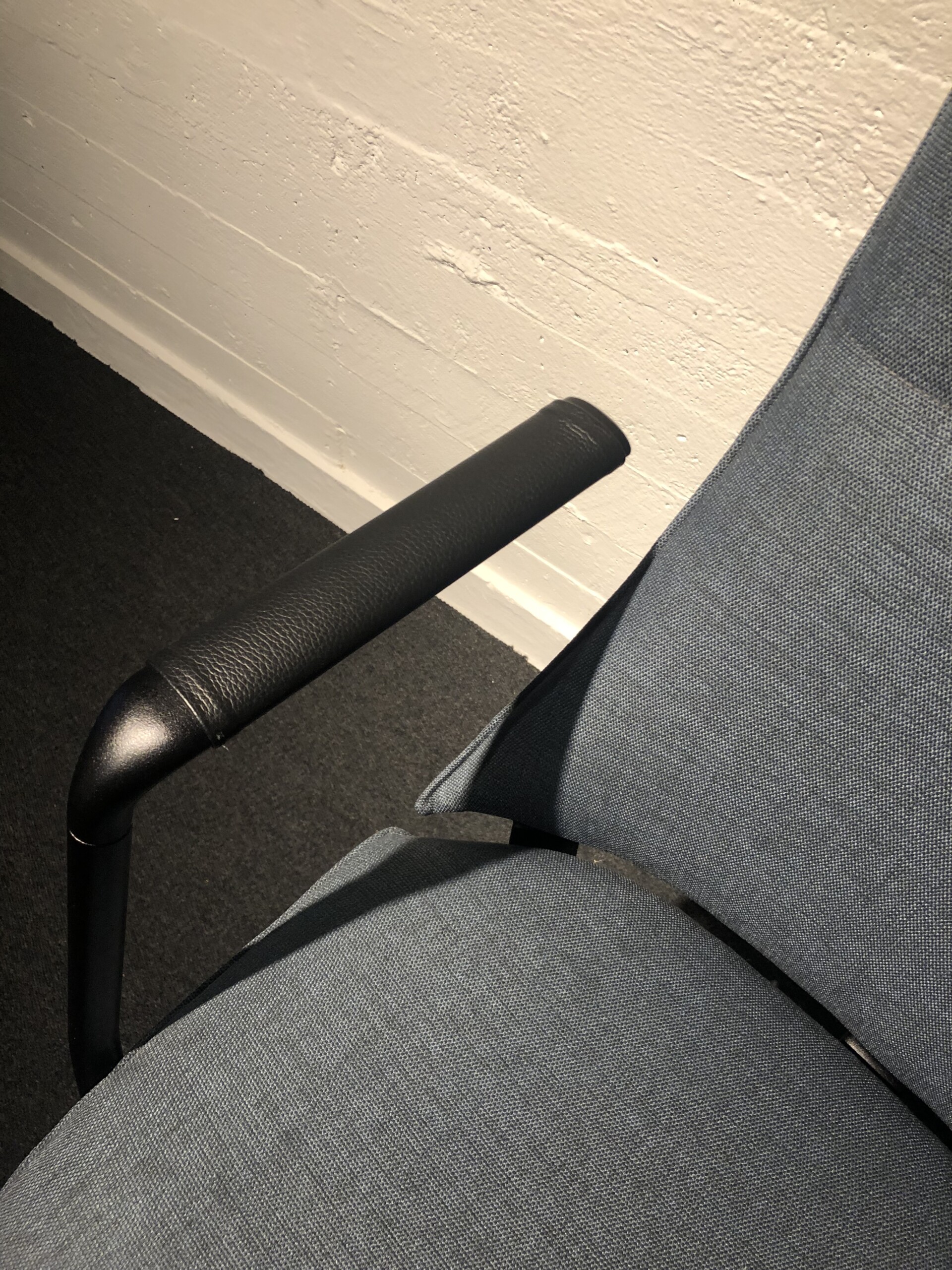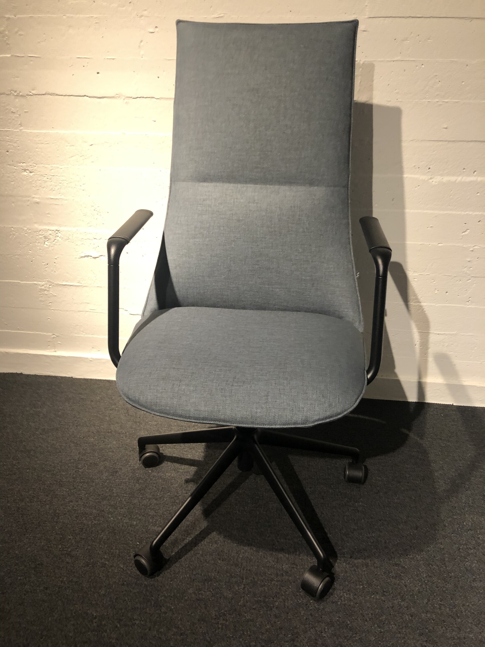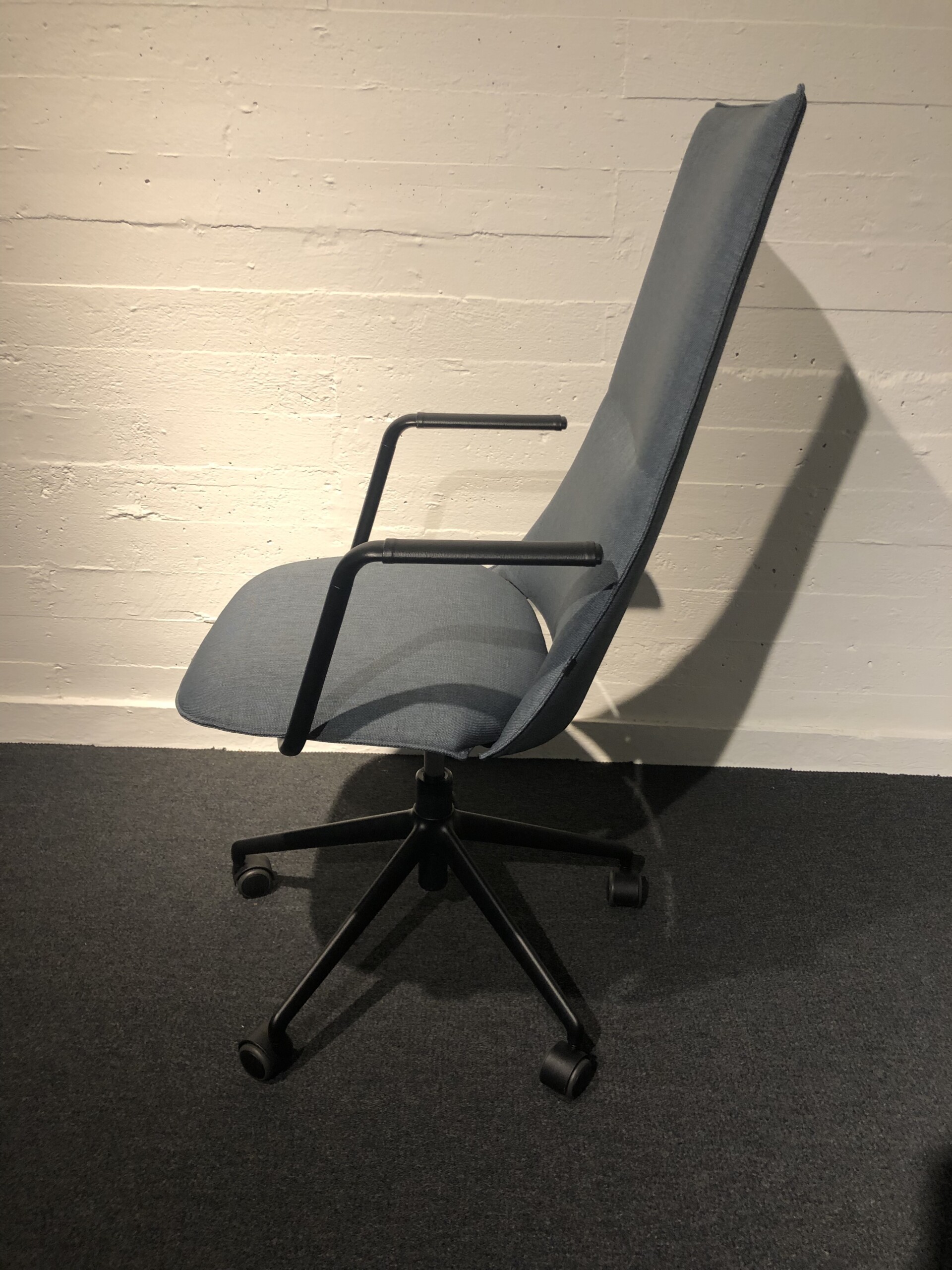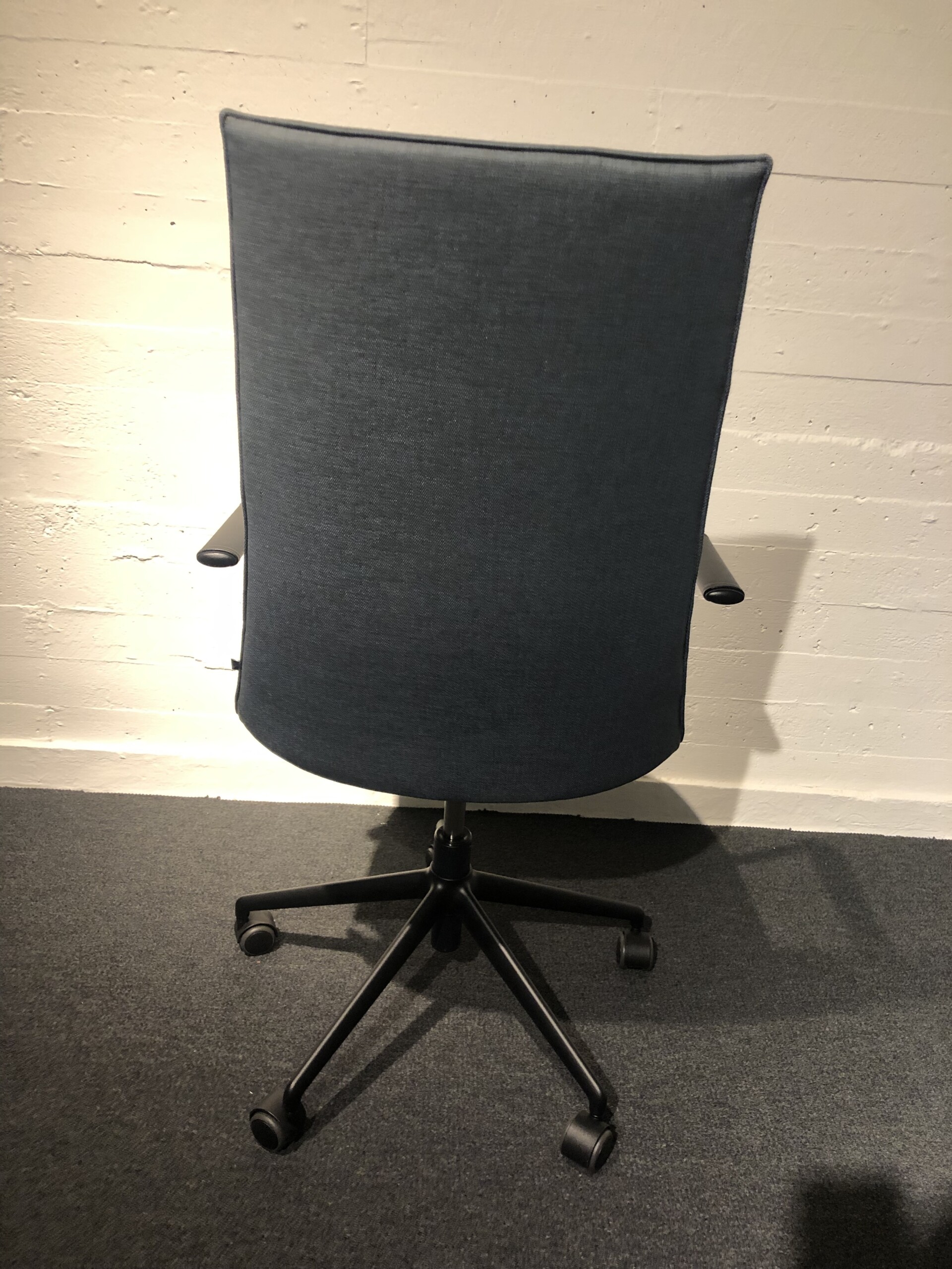 Sits och rygg i tyg (blå). Kryssfot i metall (svart). Höj- och sänkbar.