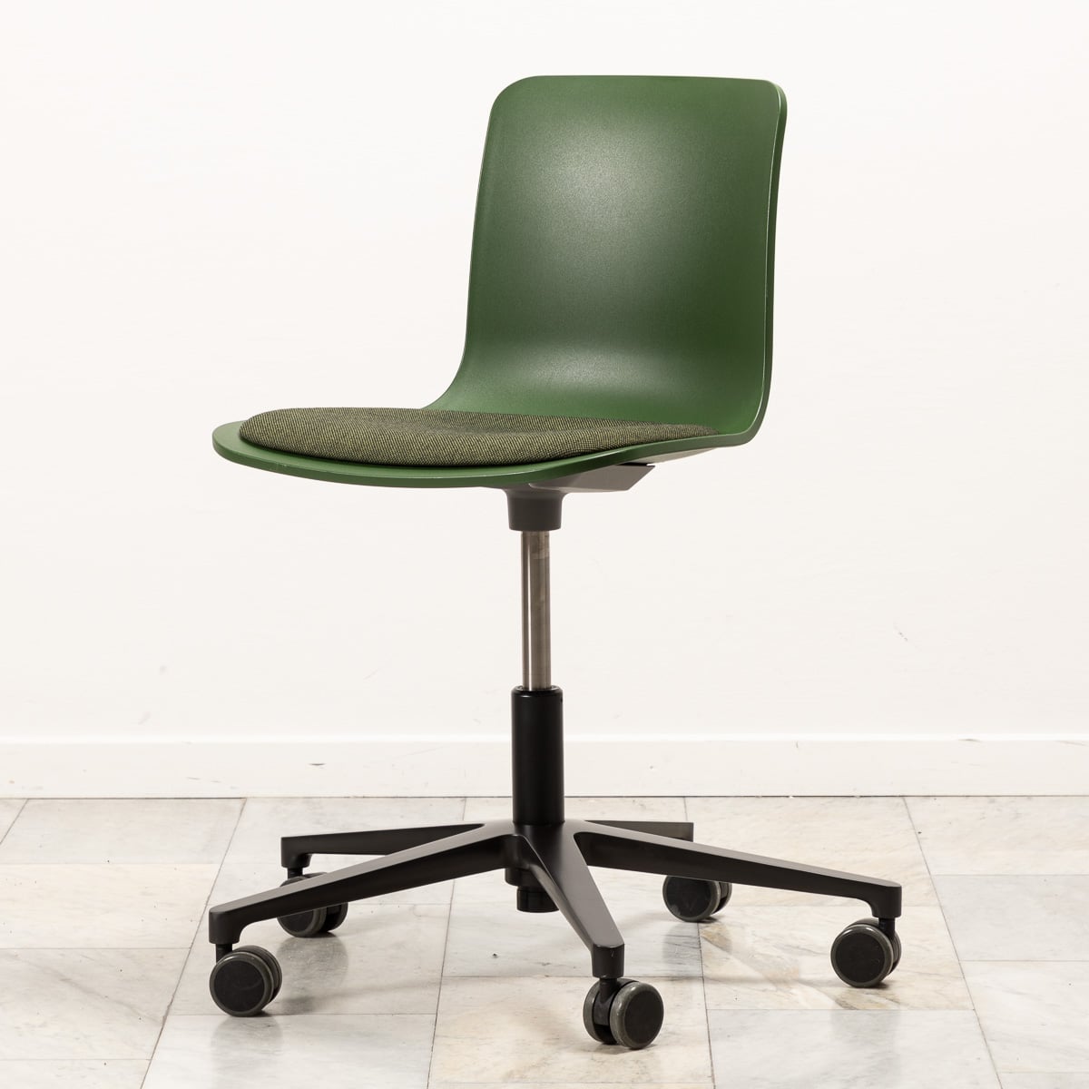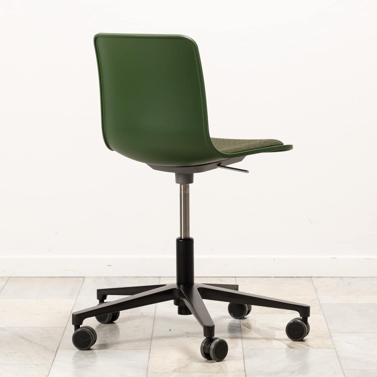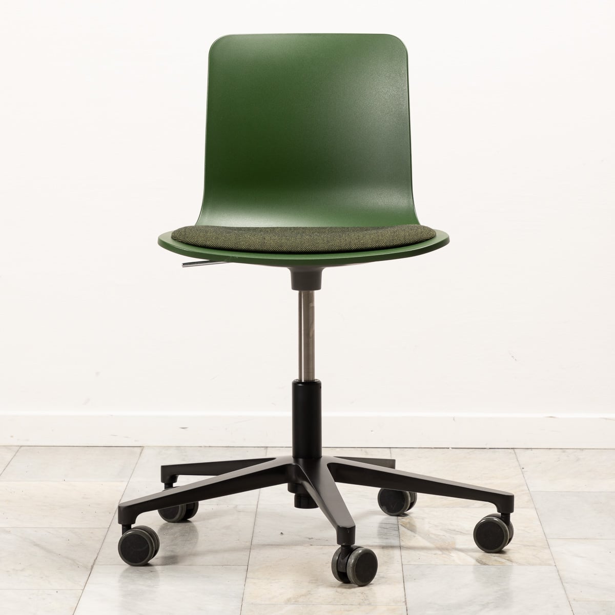 Sits och rygg i plast (grön). Kryssfot i metall (svart). Höj- och sänkbar.
