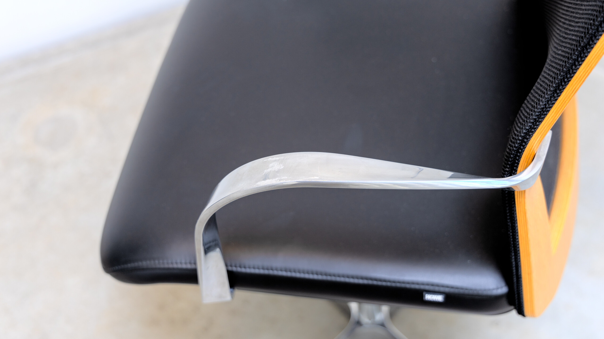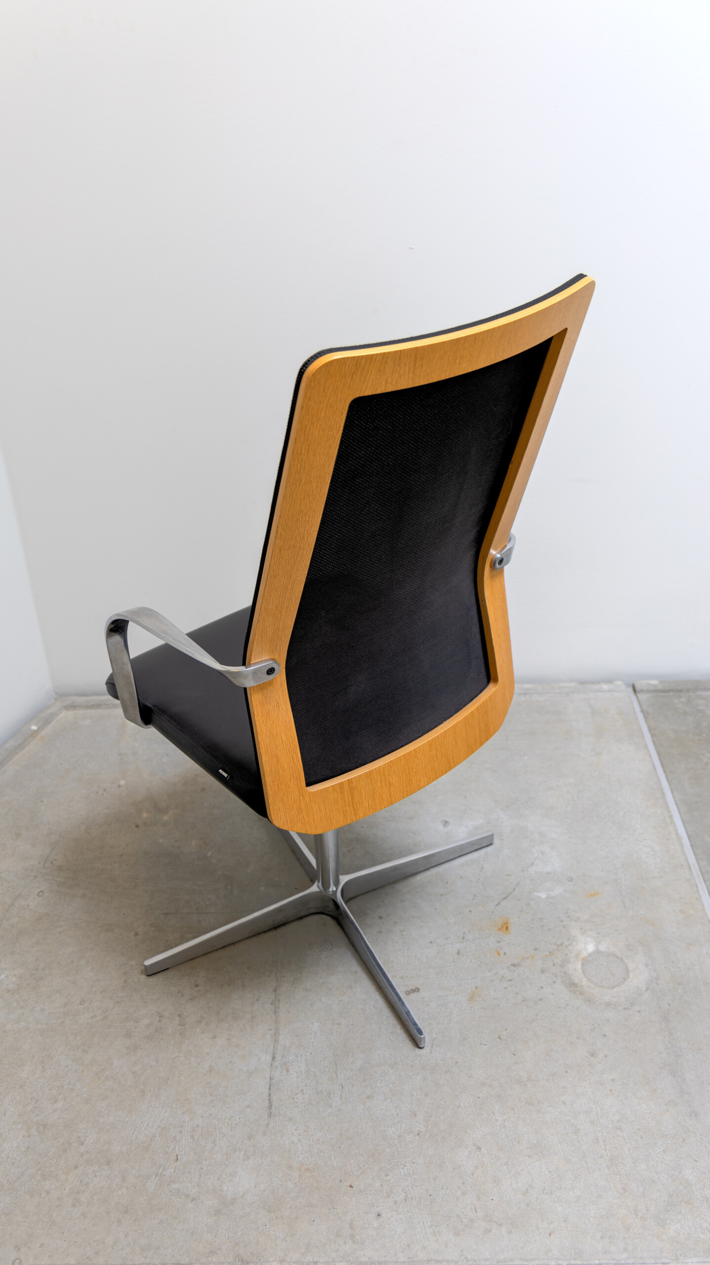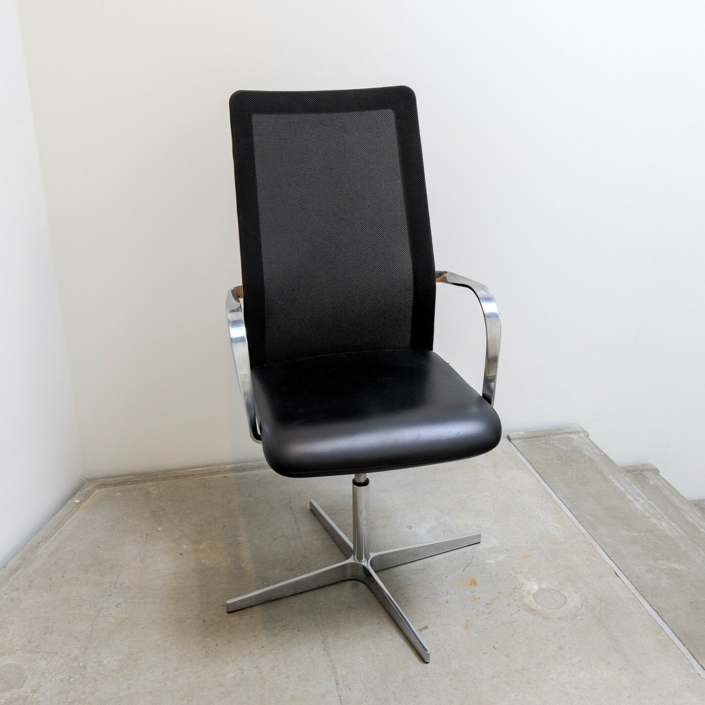 Sits i läder (svart). Rygg i mesh (svart). Kryssfot i metall (aluminium). Höj- och sänkbar.