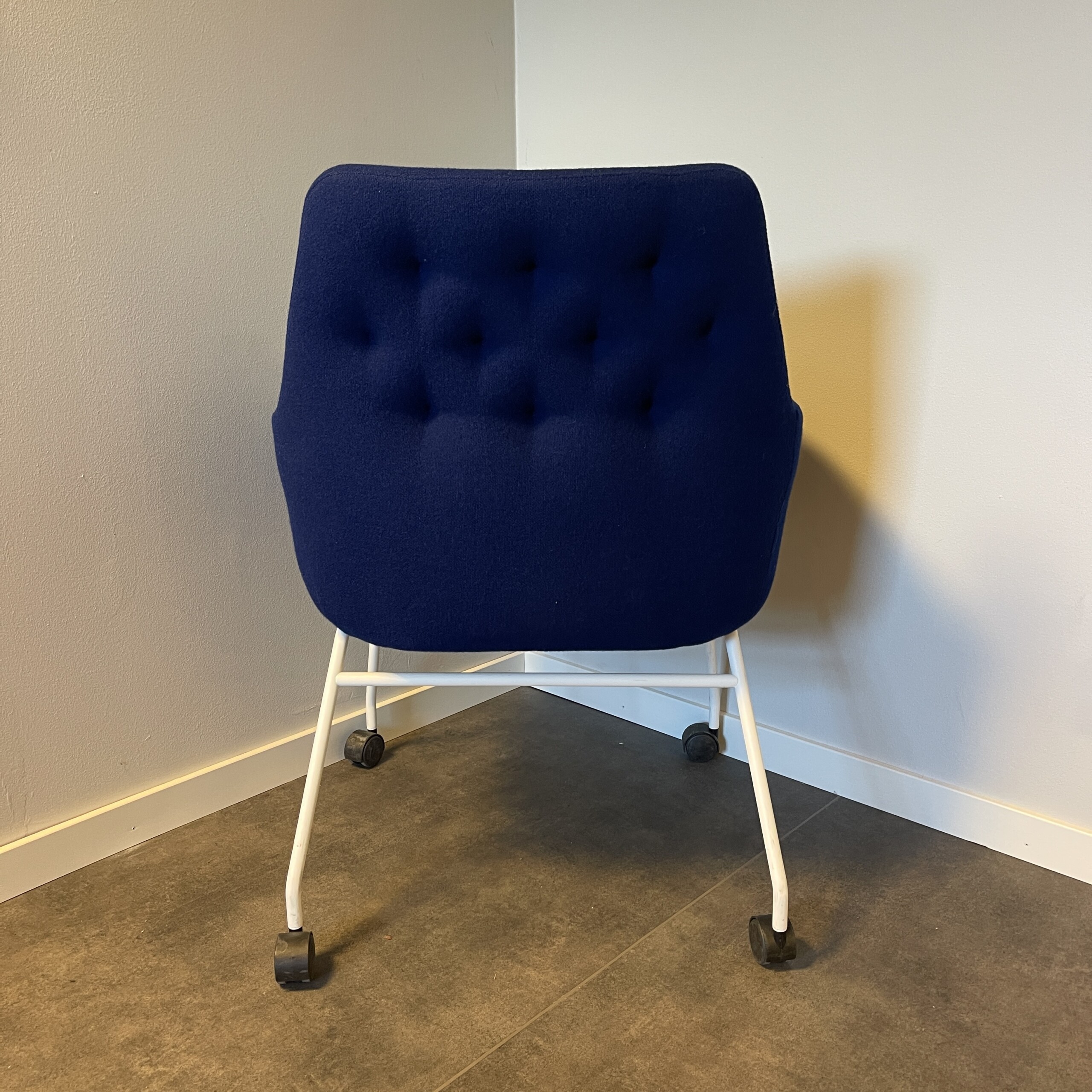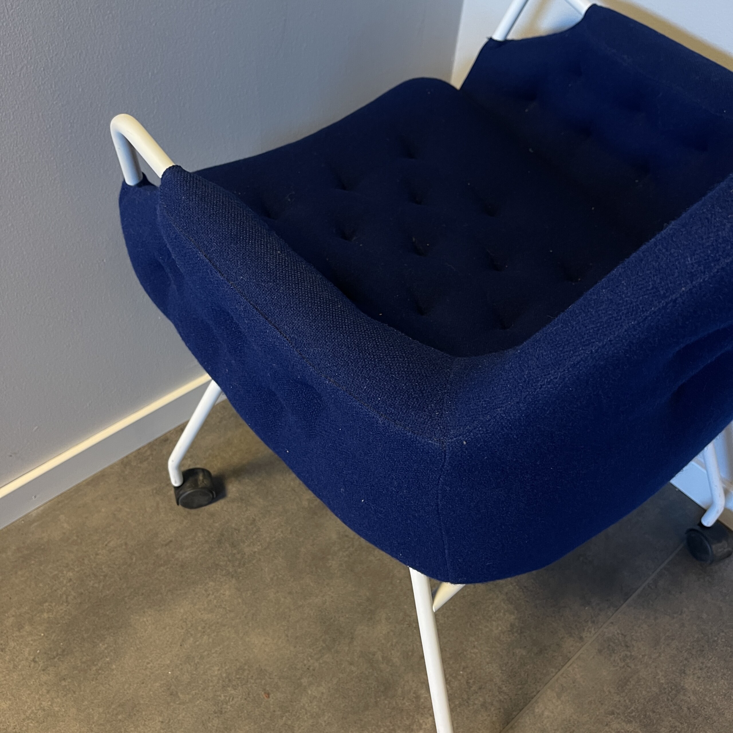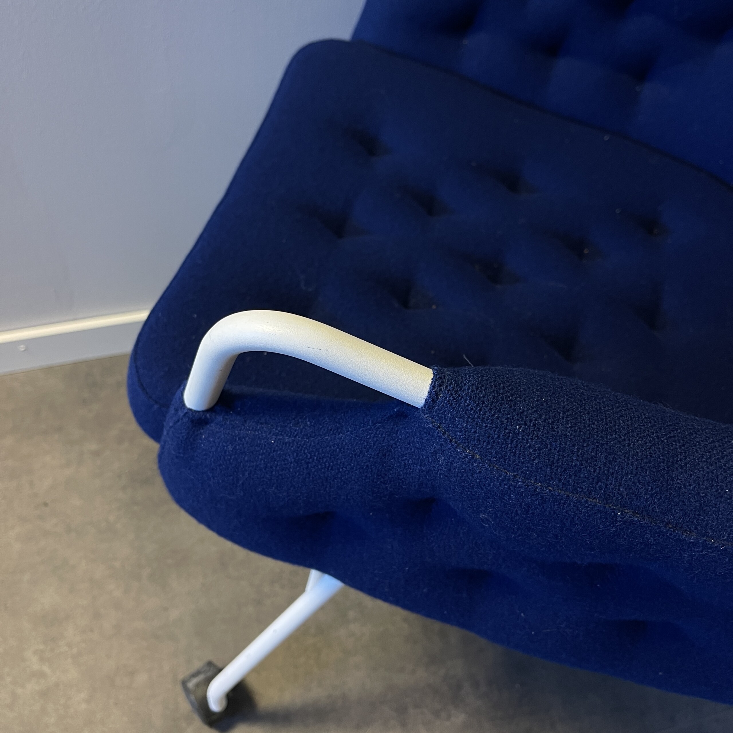 Sits och rygg i tyg (blå). Ben i metall (vit).