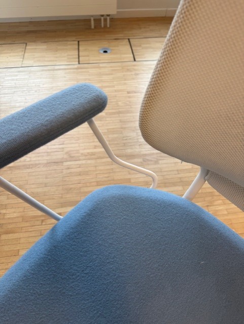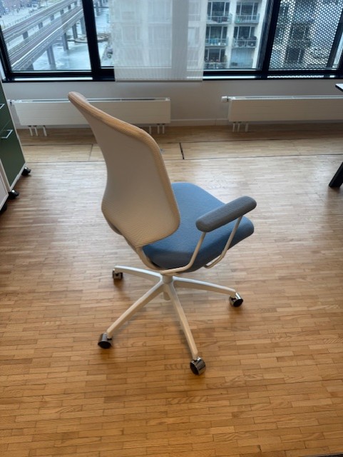 Sits i tyg (blå). Rygg i mesh (vit). Kryssfot i metall (vit). Höj- och sänkbar.