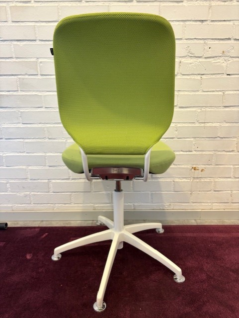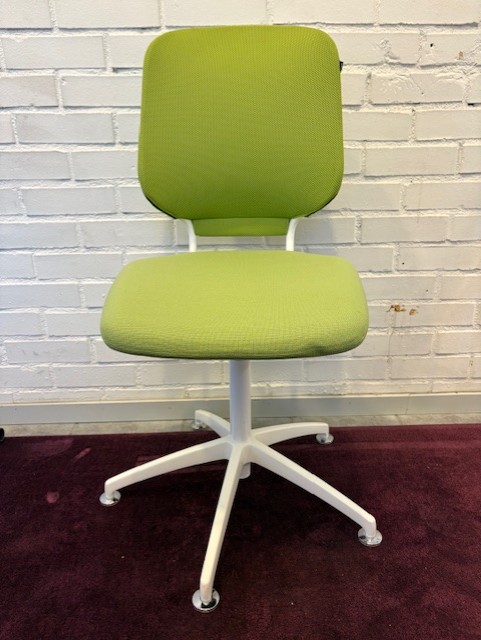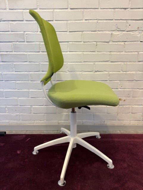 Sits i tyg (grön). Rygg i mesh (grön). Kryssfot i metall (vit). Höj- och sänkbar.