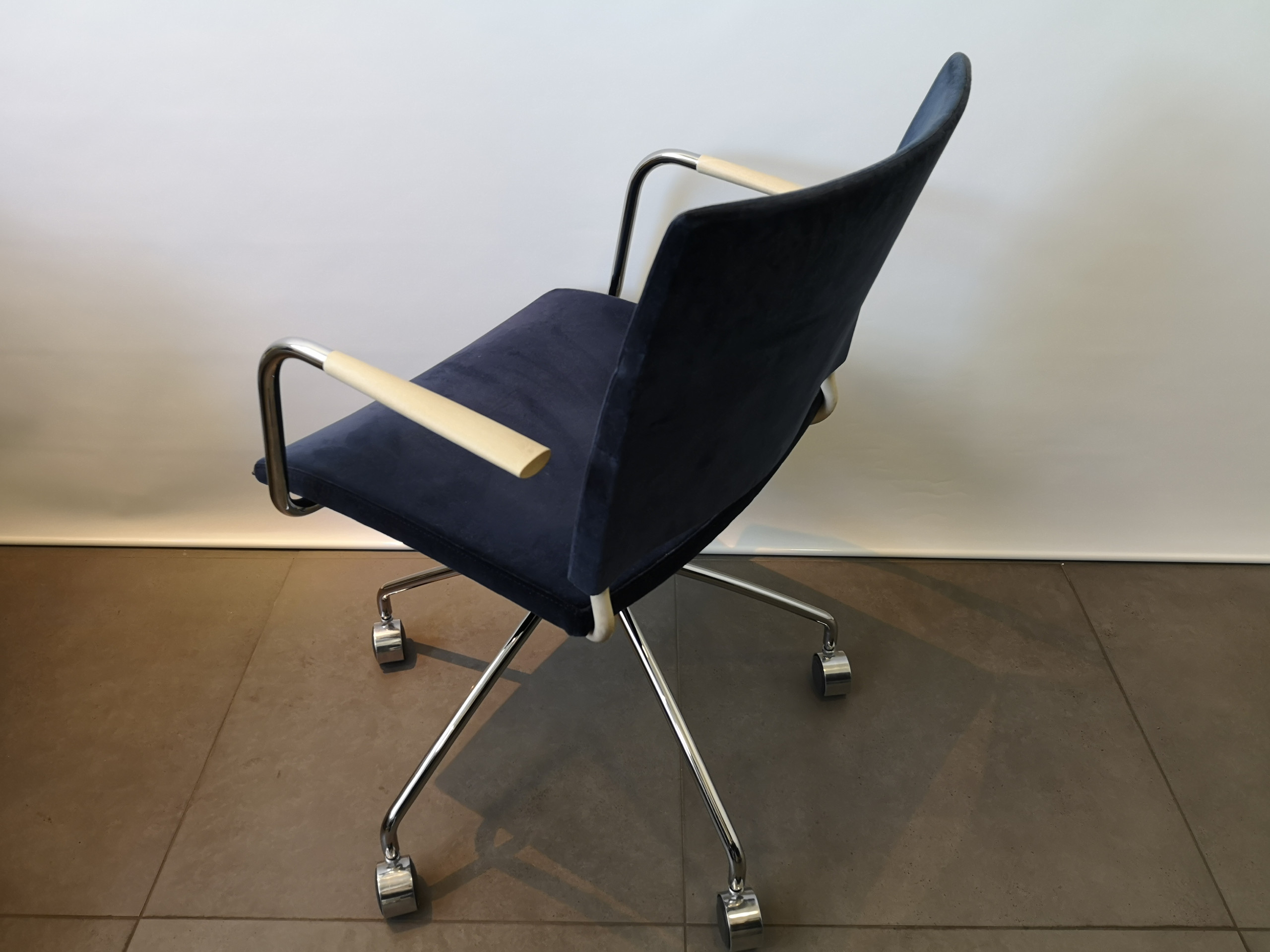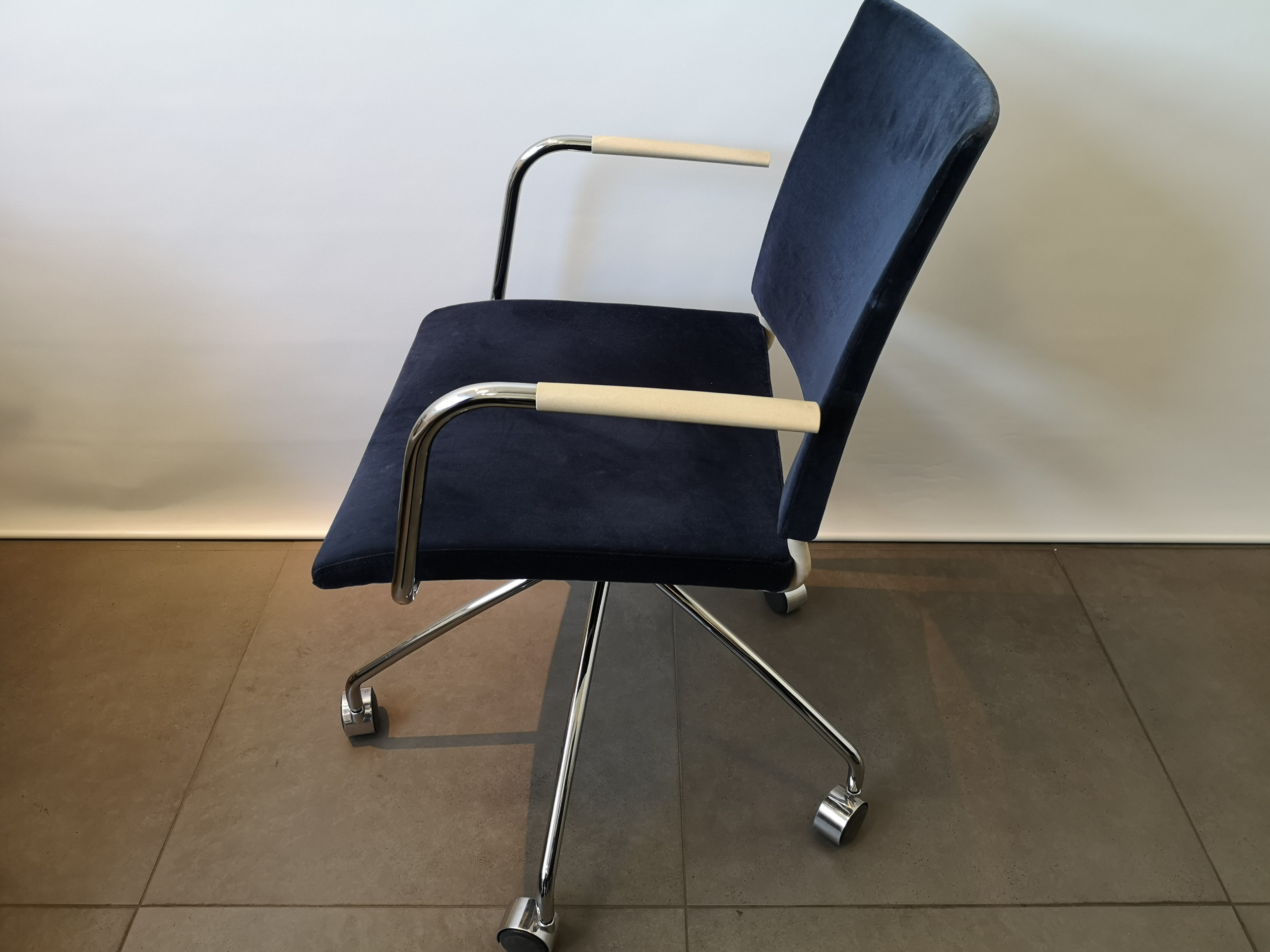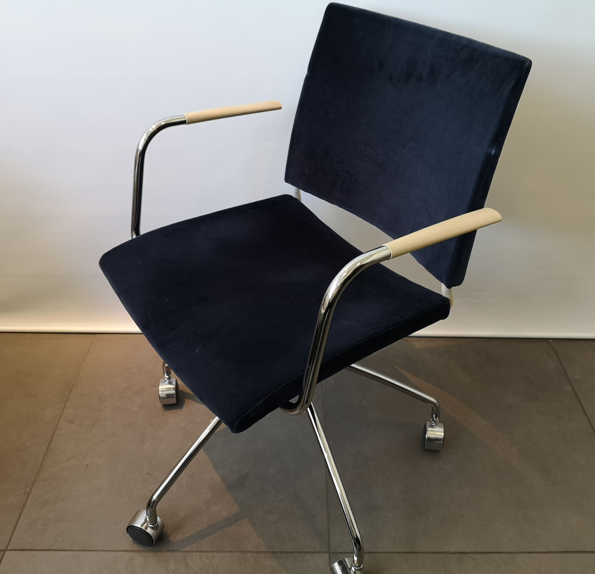 Sits och rygg i tyg (blå). Kryssfot i metall (krom).