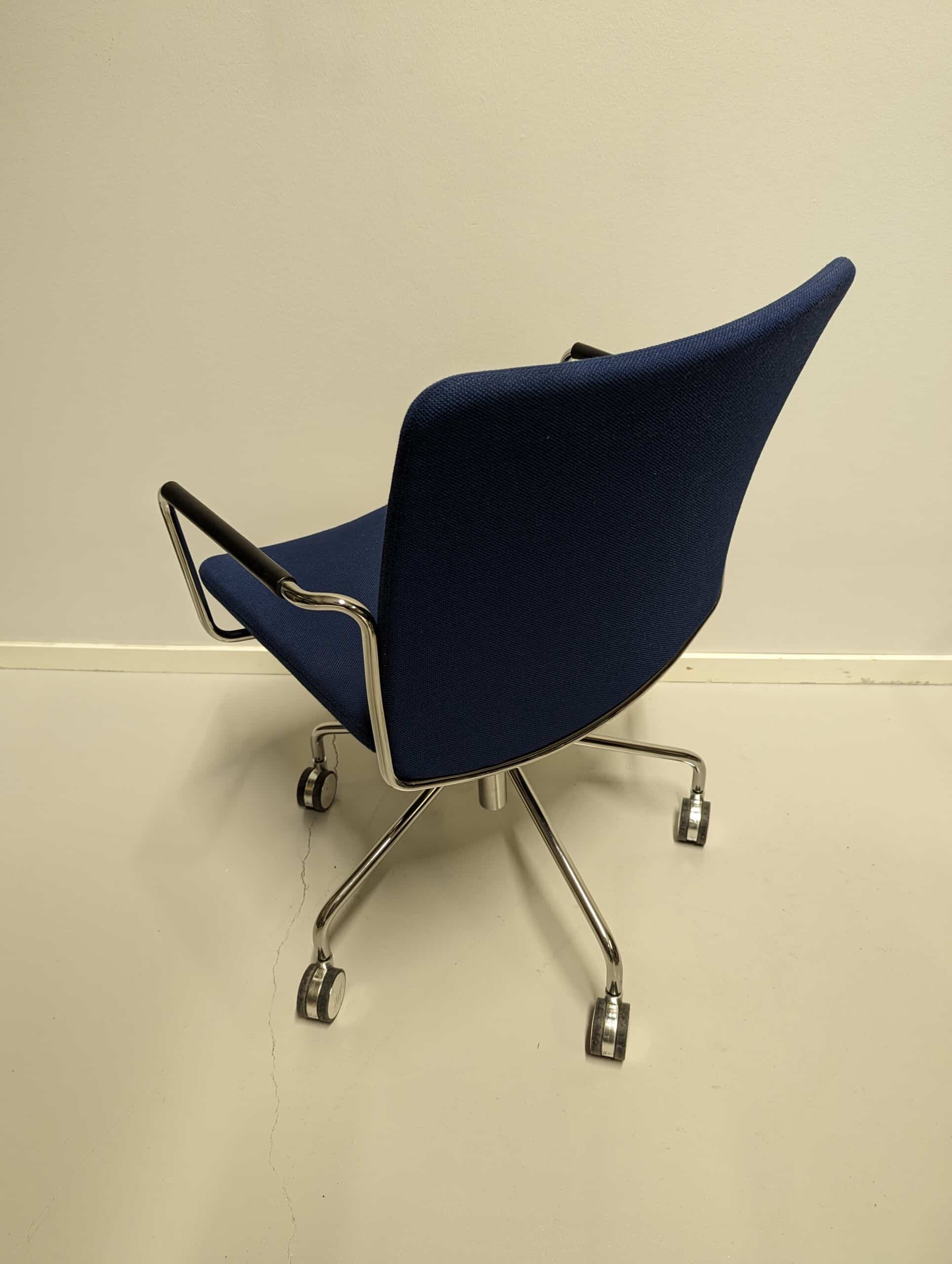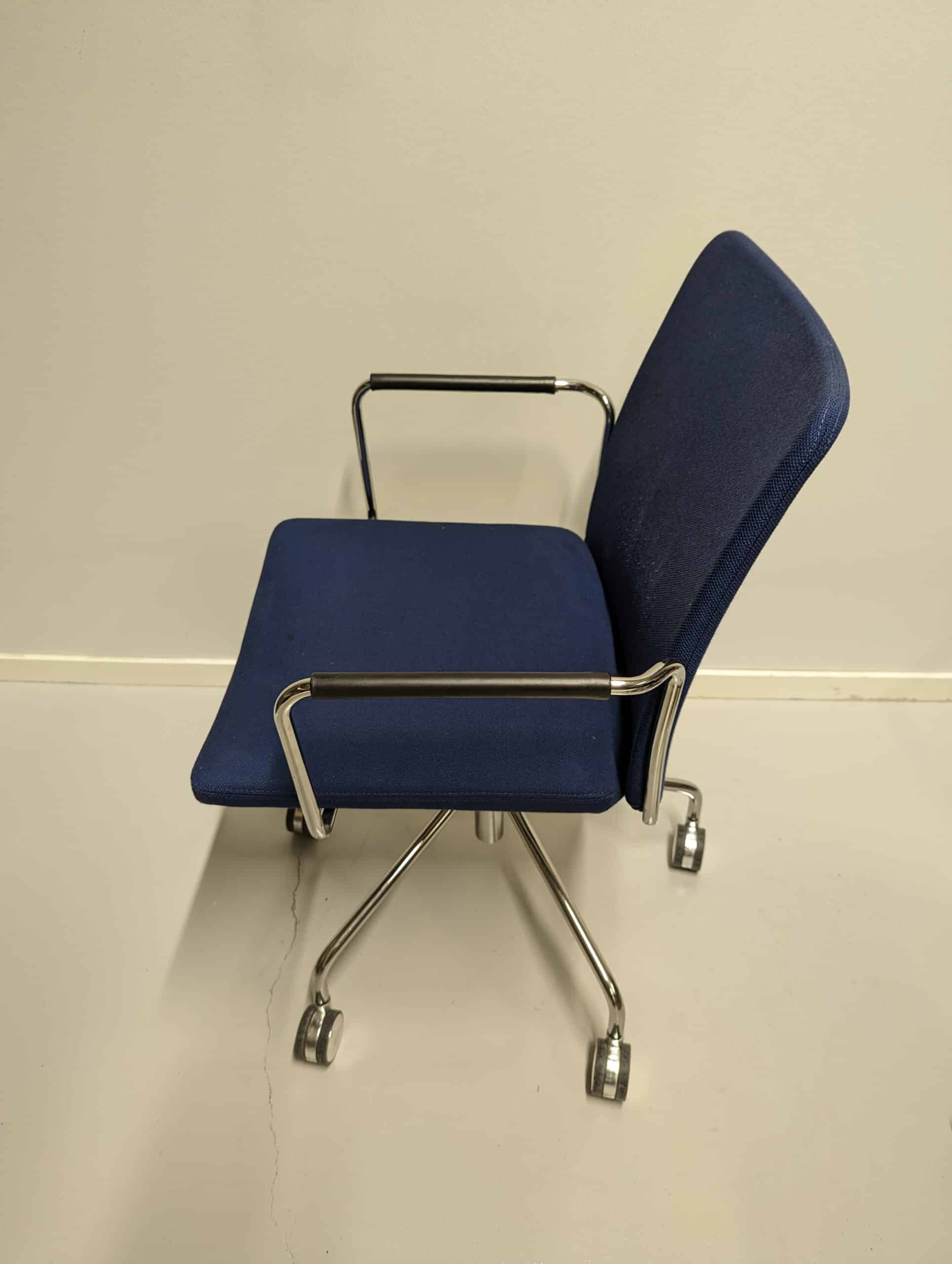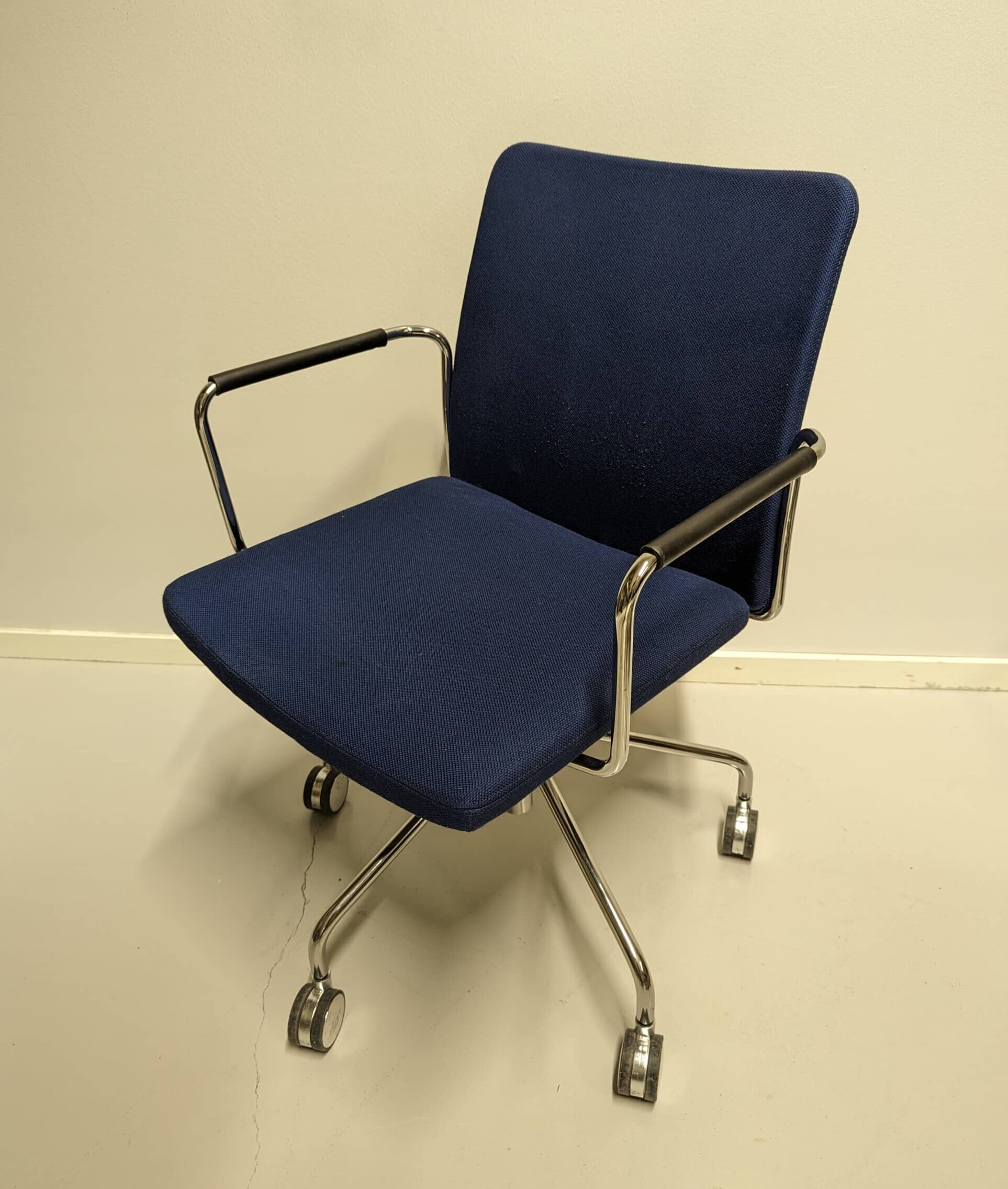 Sits och rygg i tyg (blå). Kryssfot i metall (krom). Höj- och sänkbar.