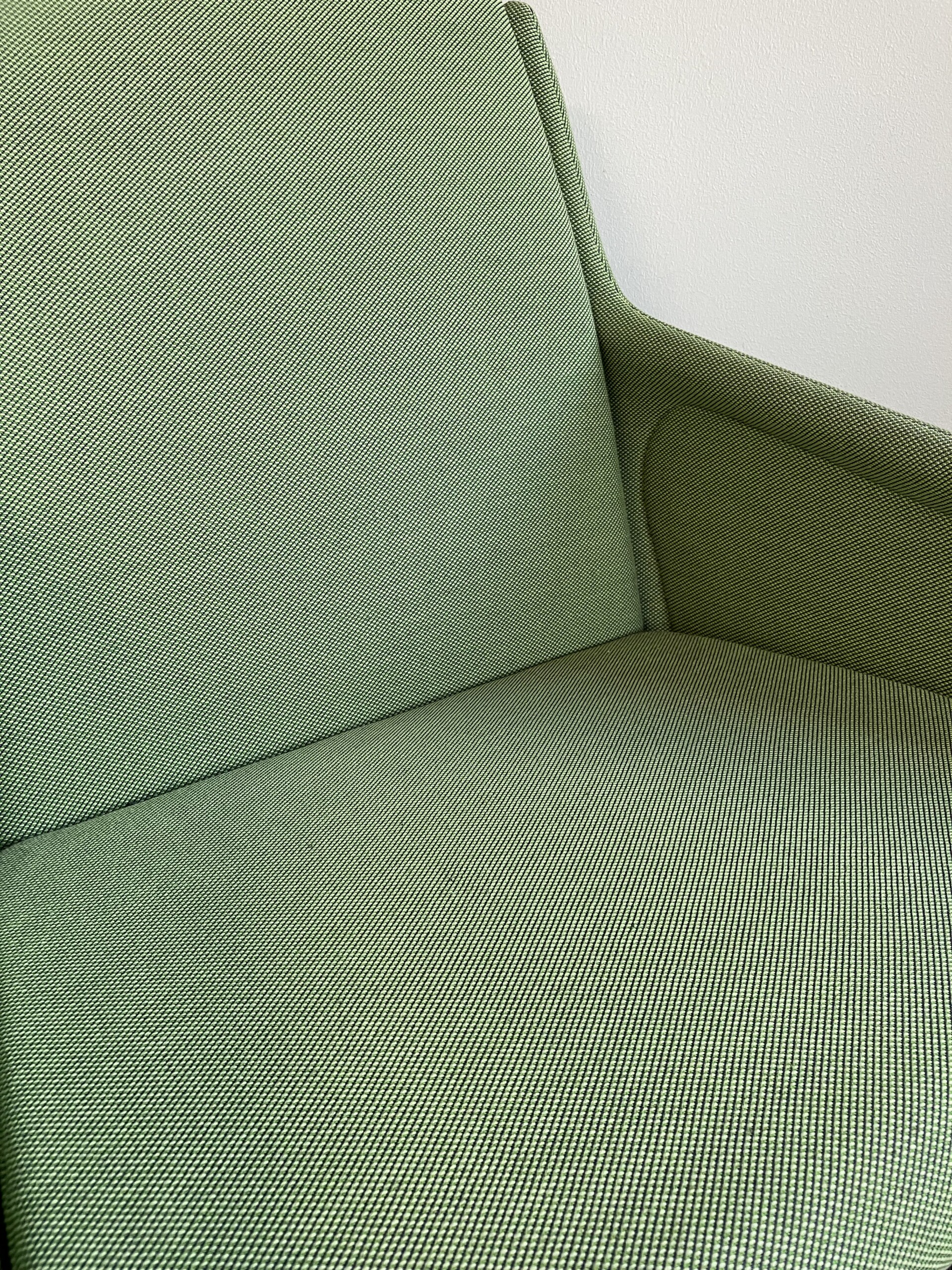 Sits och rygg i tyg (grön). Ben i metall (vit).