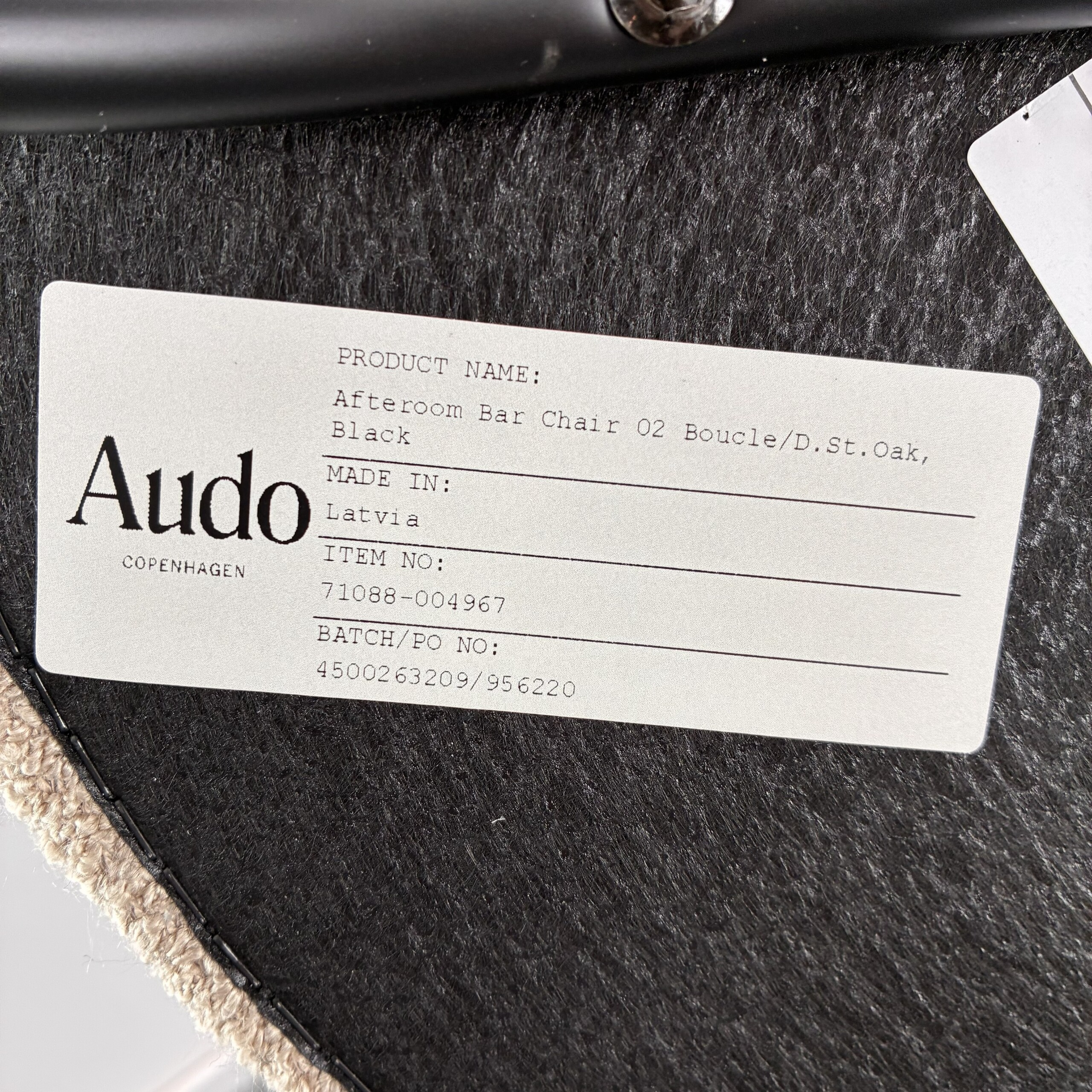 | Tyg | beige | Audo, Bouclé, 02 | Trä | ek | Ben | Metall | svart |