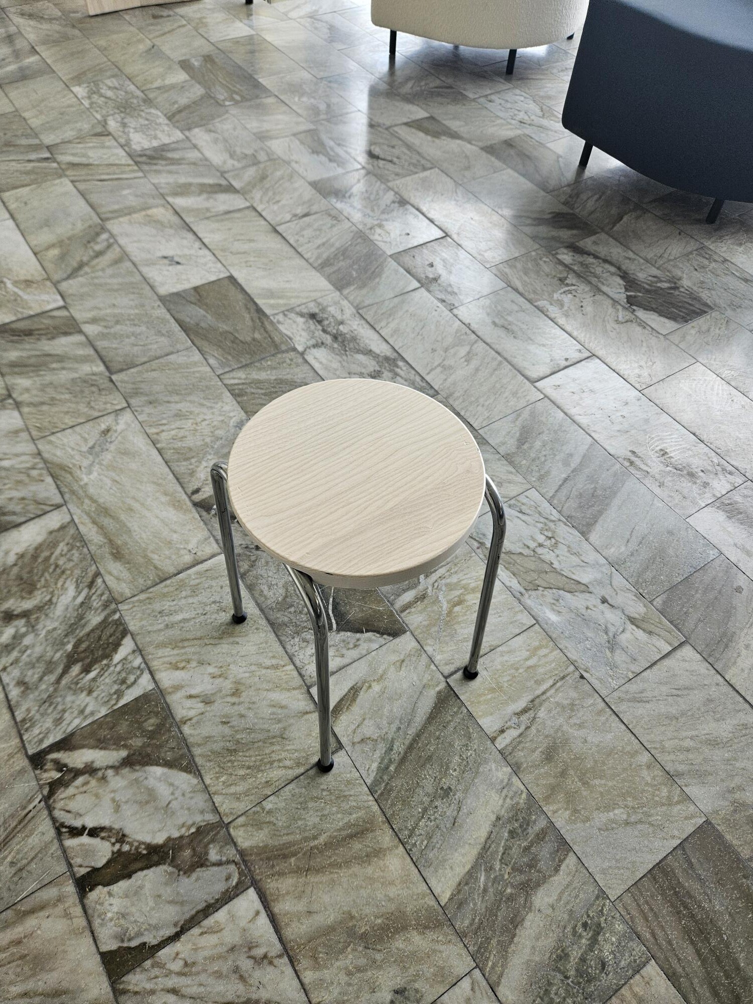 Sits i trä (ask). Ben i metall (krom).