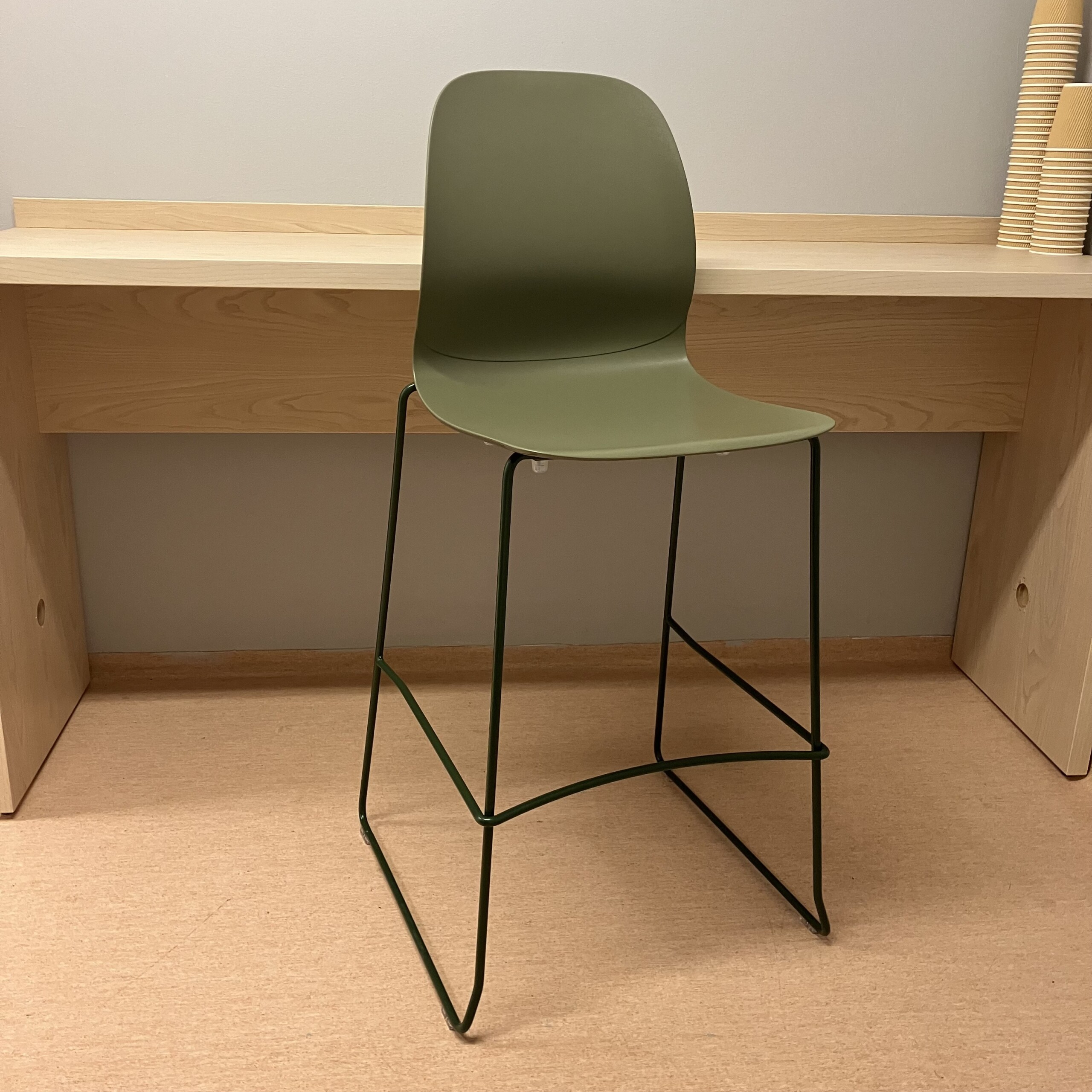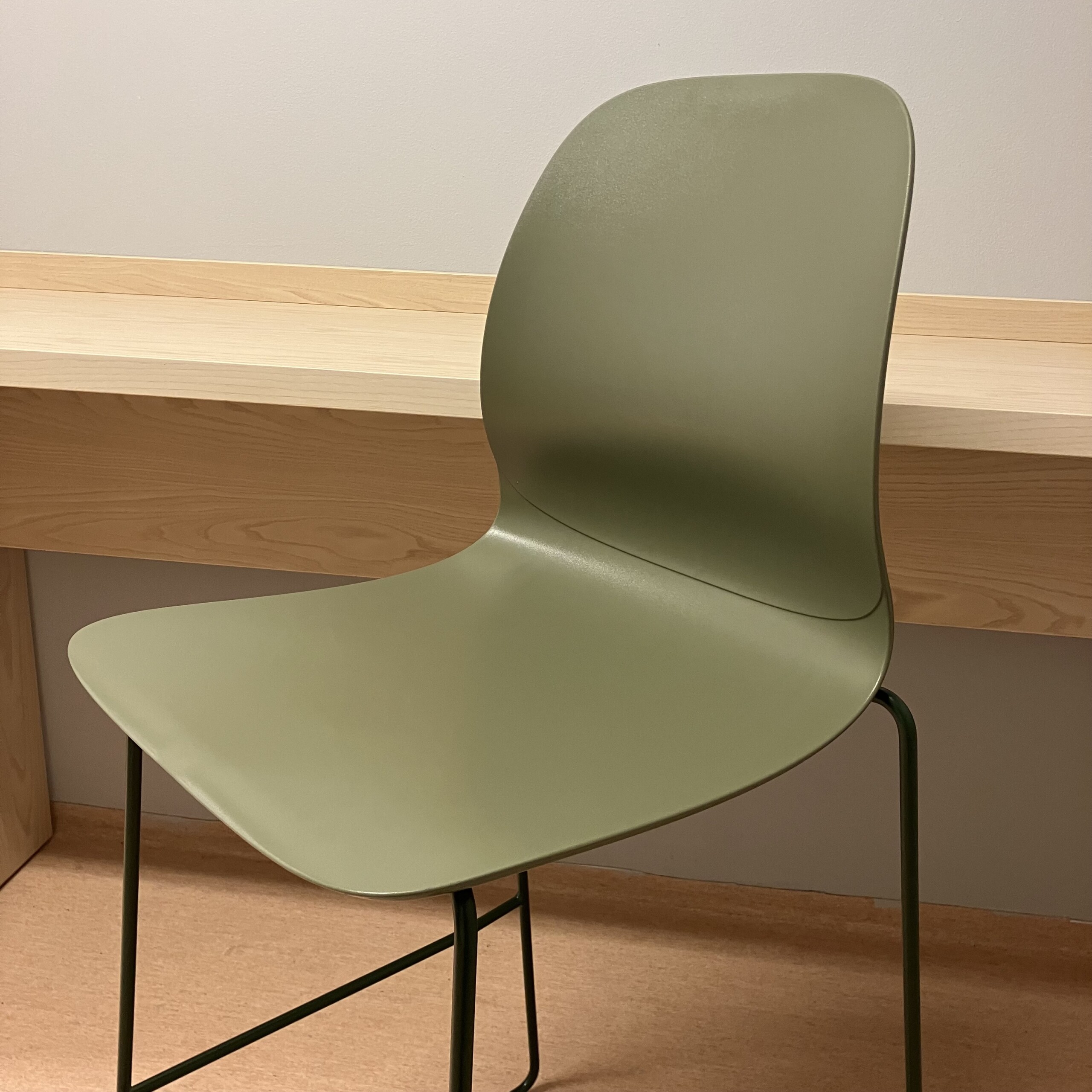 Sits och rygg i plast (grön). Medstativ i metall (grön).