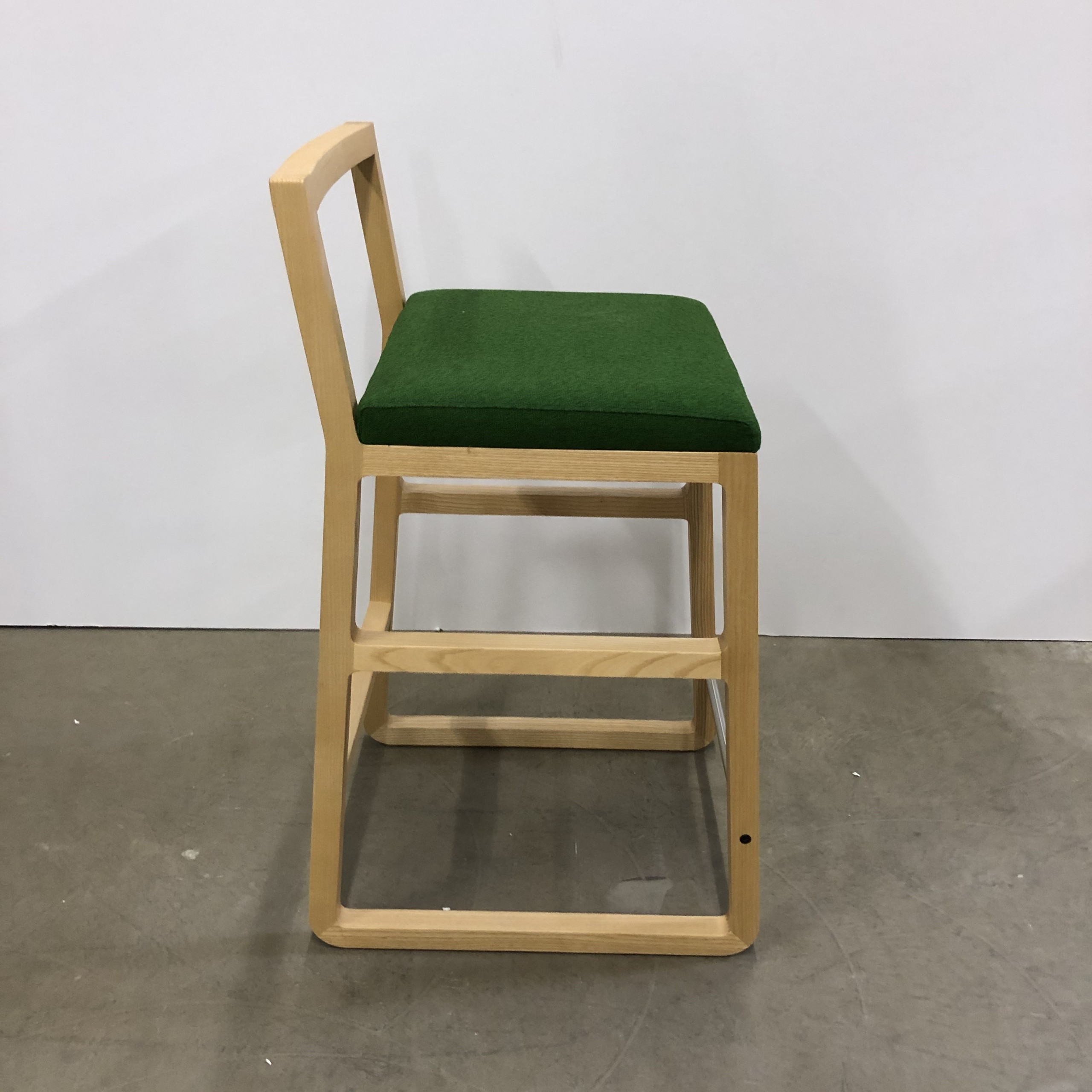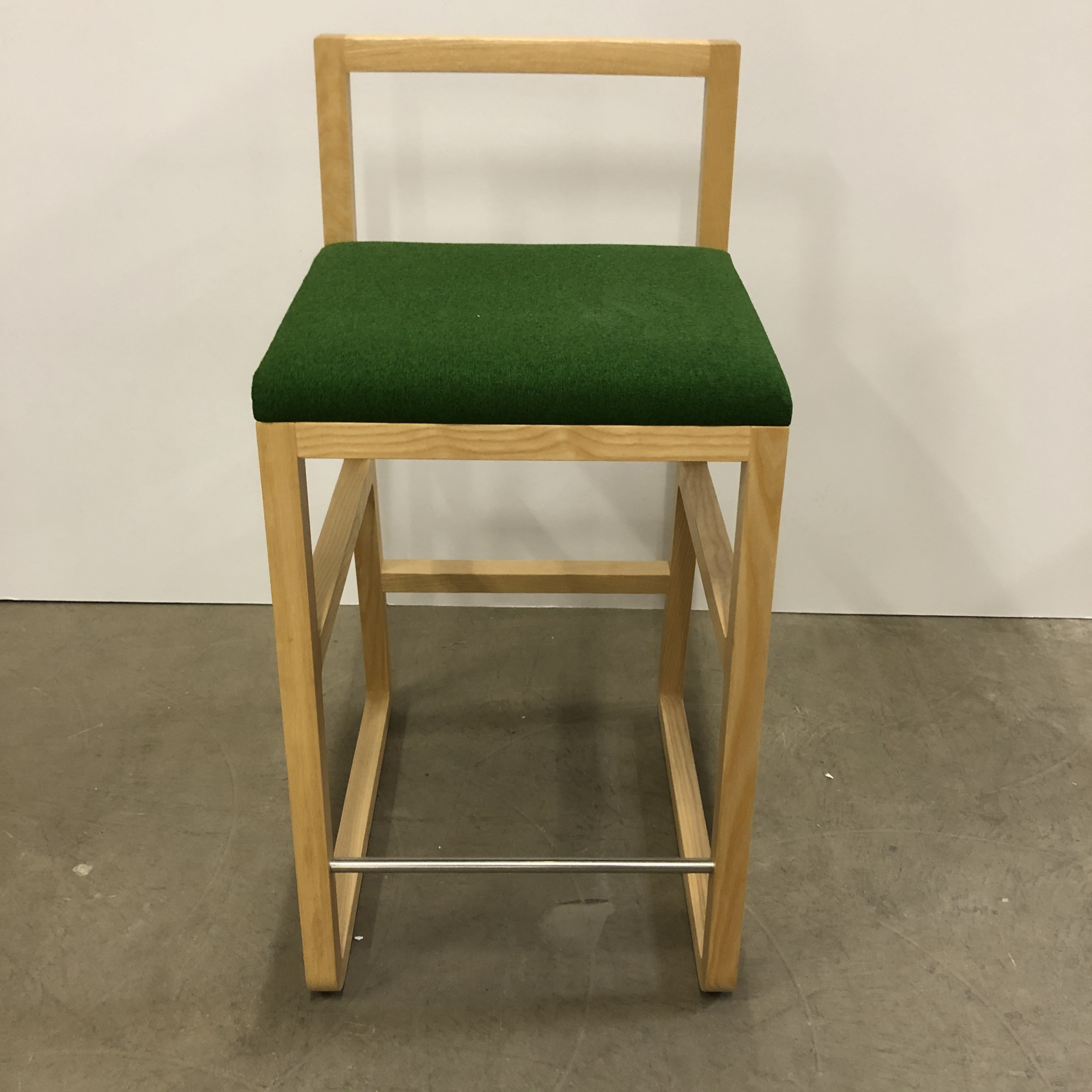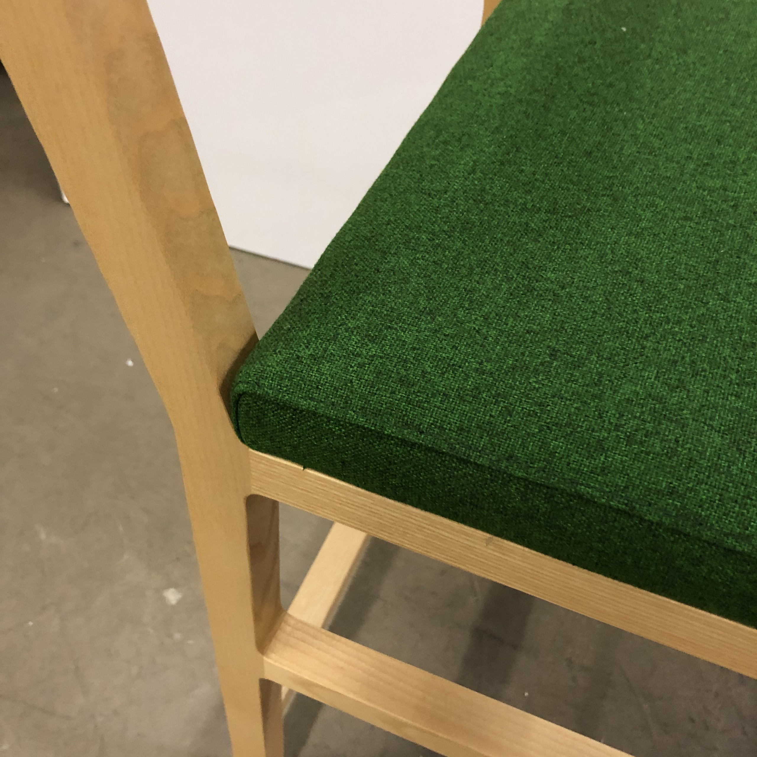 Sits i tyg (grön). Rygg i trä (ask). Medstativ i trä (ask).