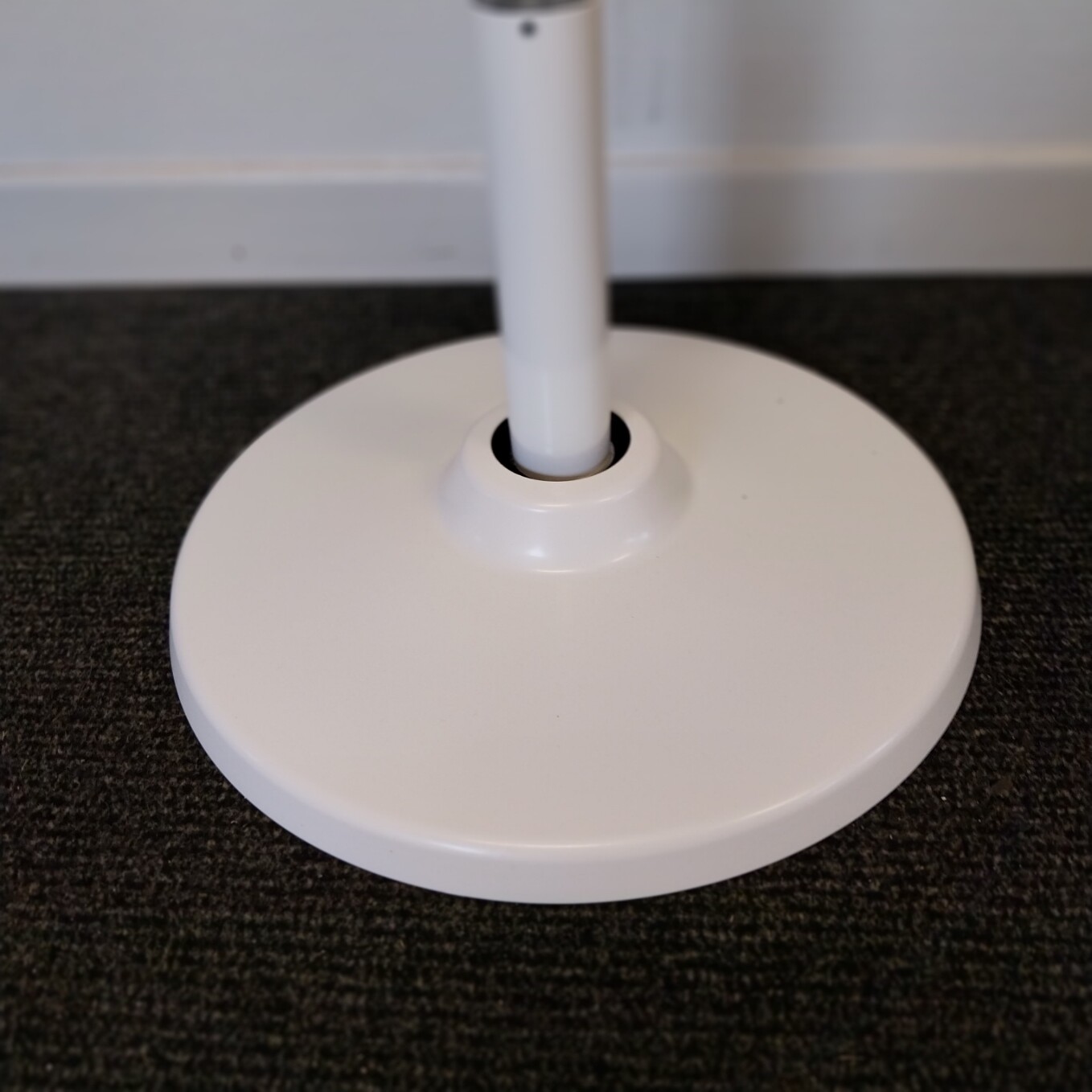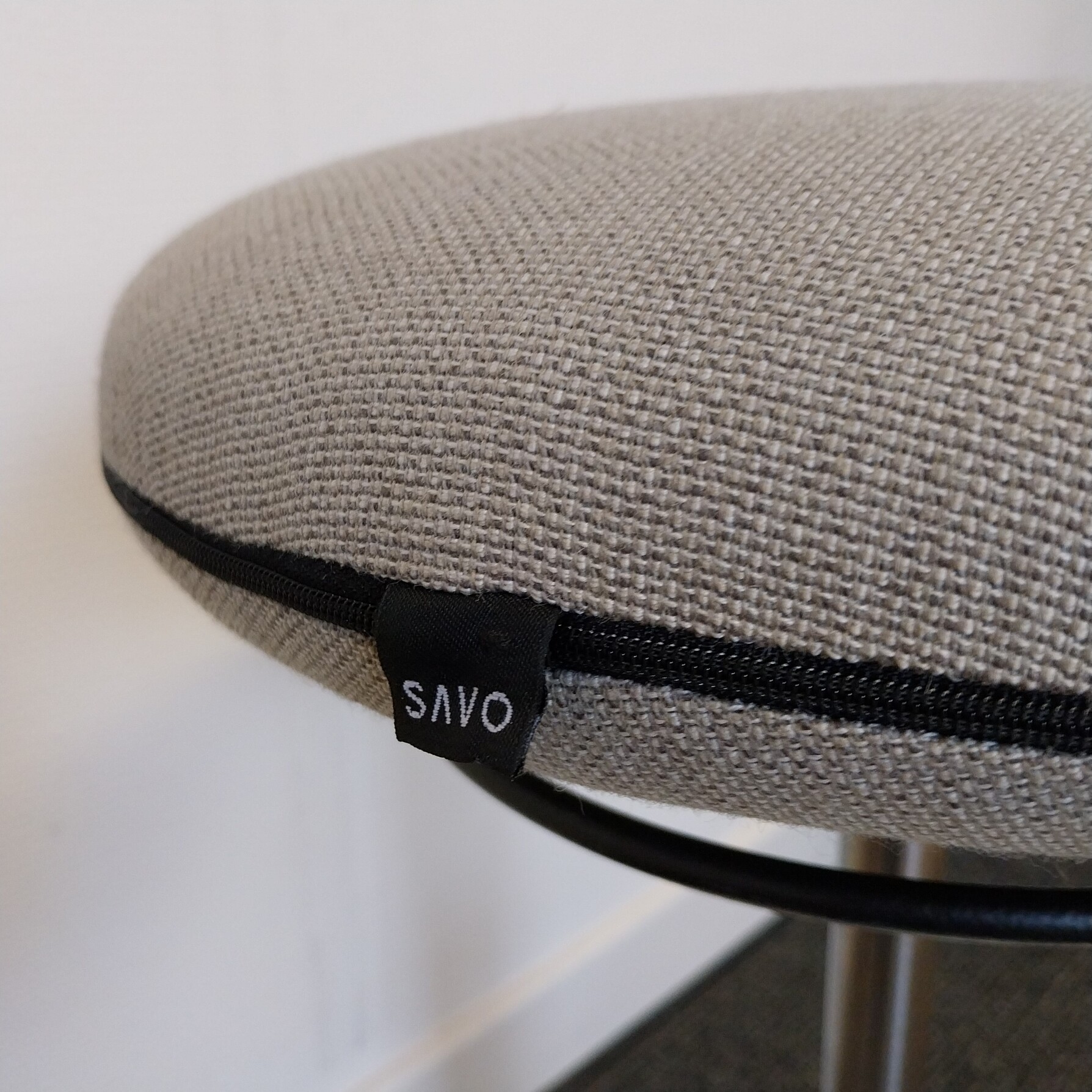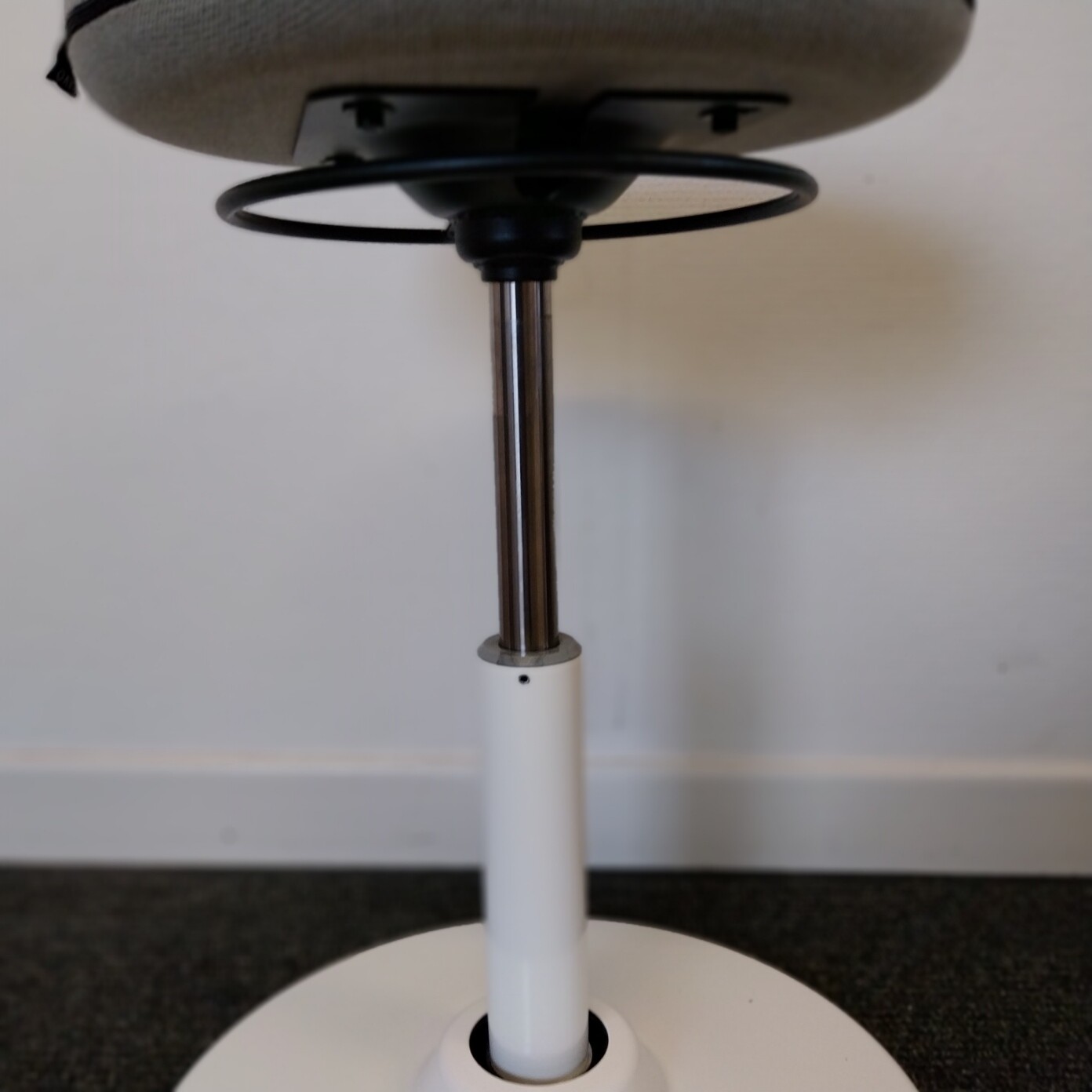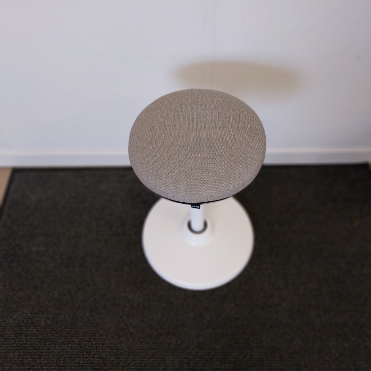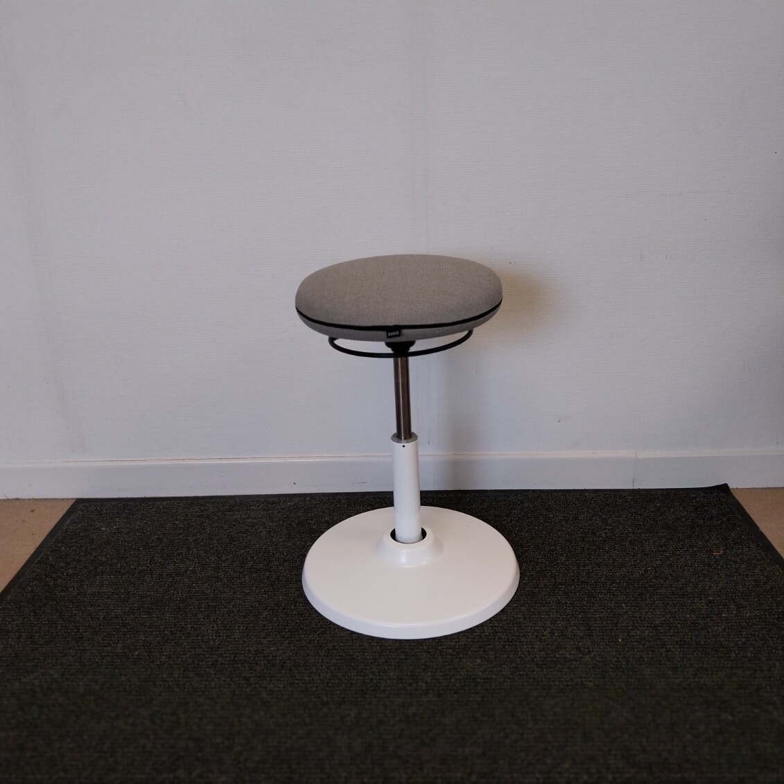 Sits i tyg (grå). Pelarfot i metall (vit).