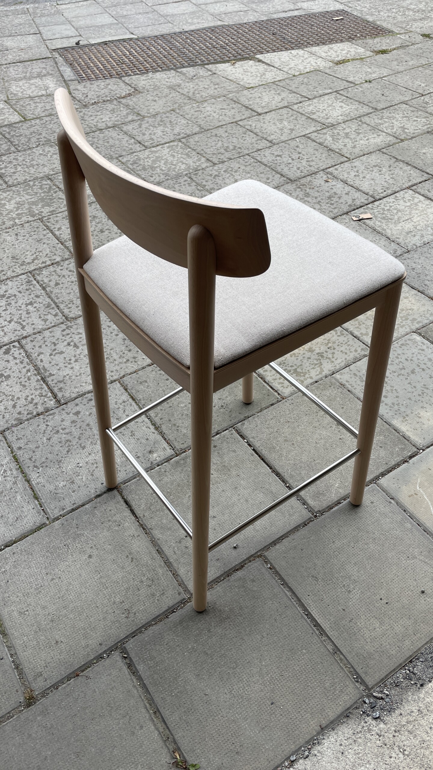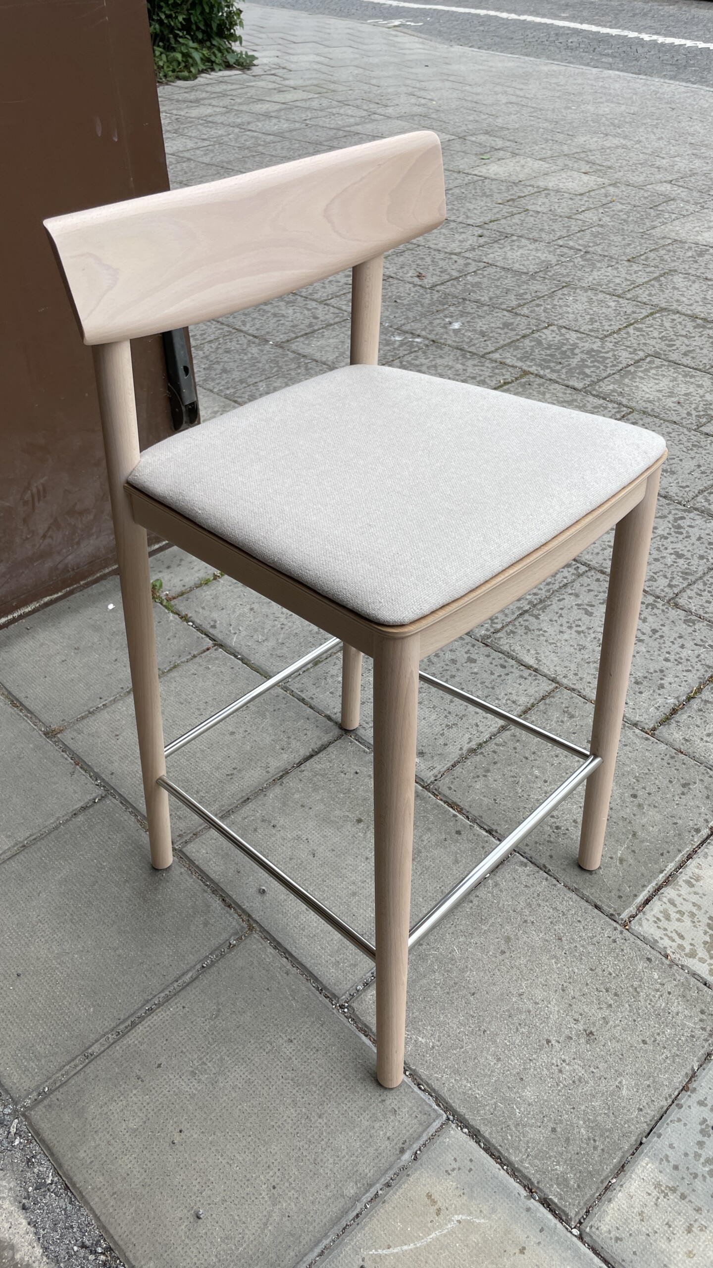 Sits i tyg (beige). Rygg i trä (björk). Ben i trä (björk).