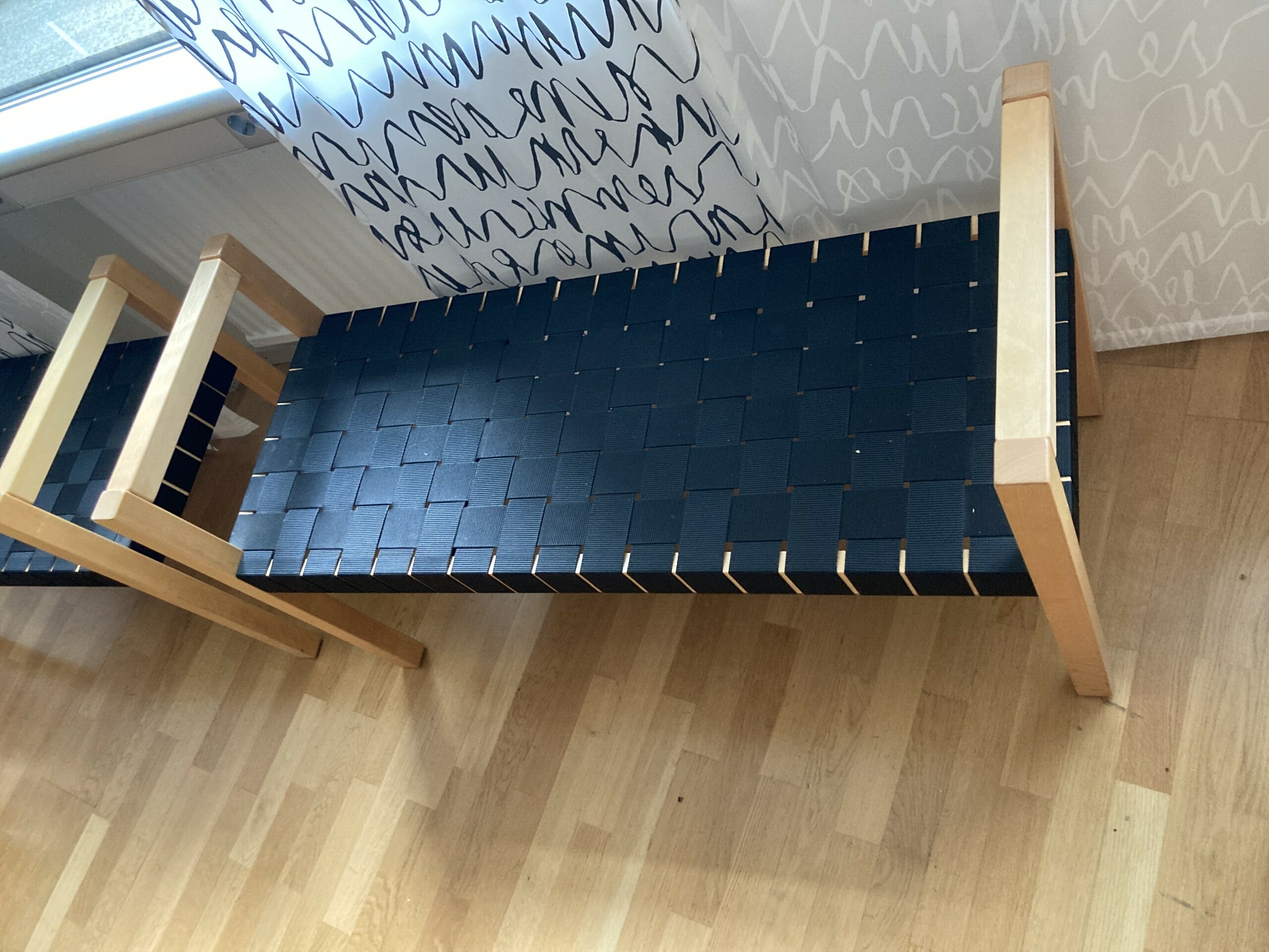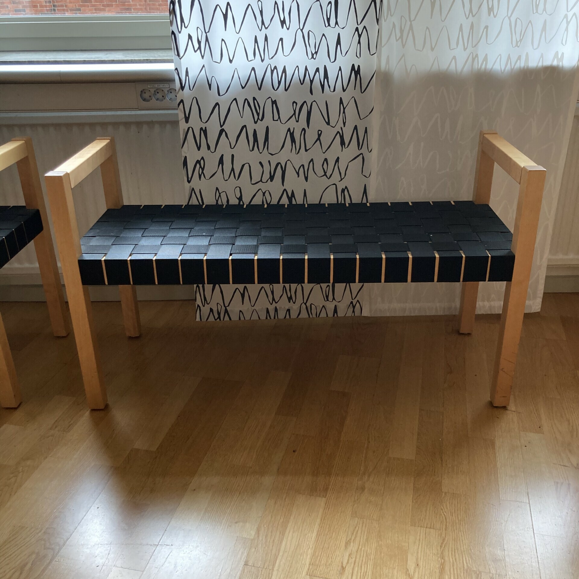 Sits i sadelgjord (svart). Ben i trä.