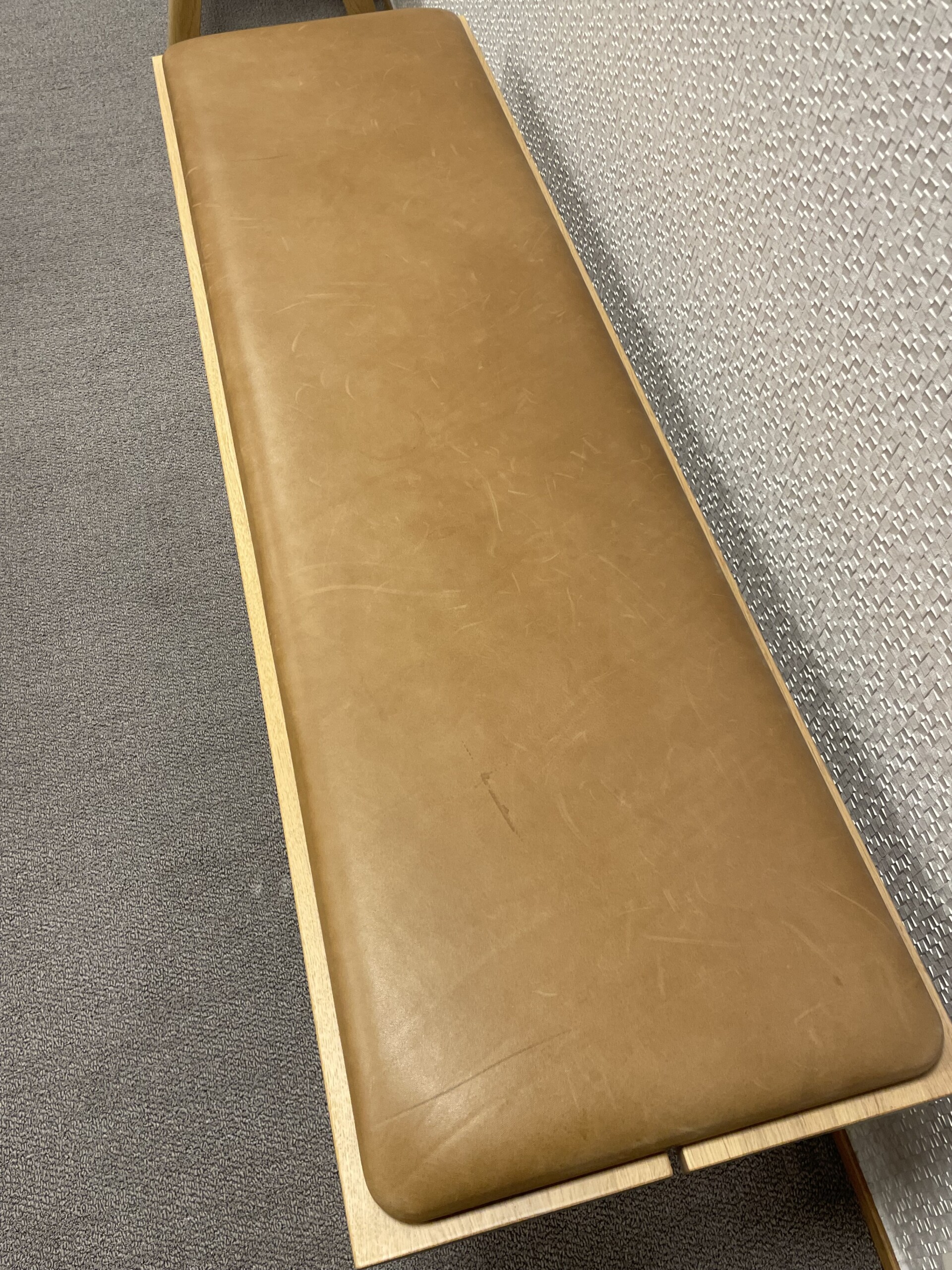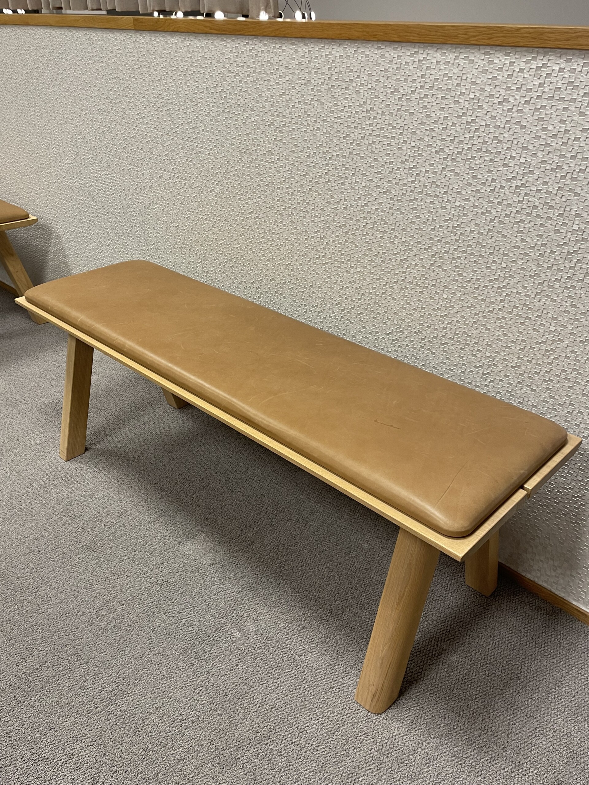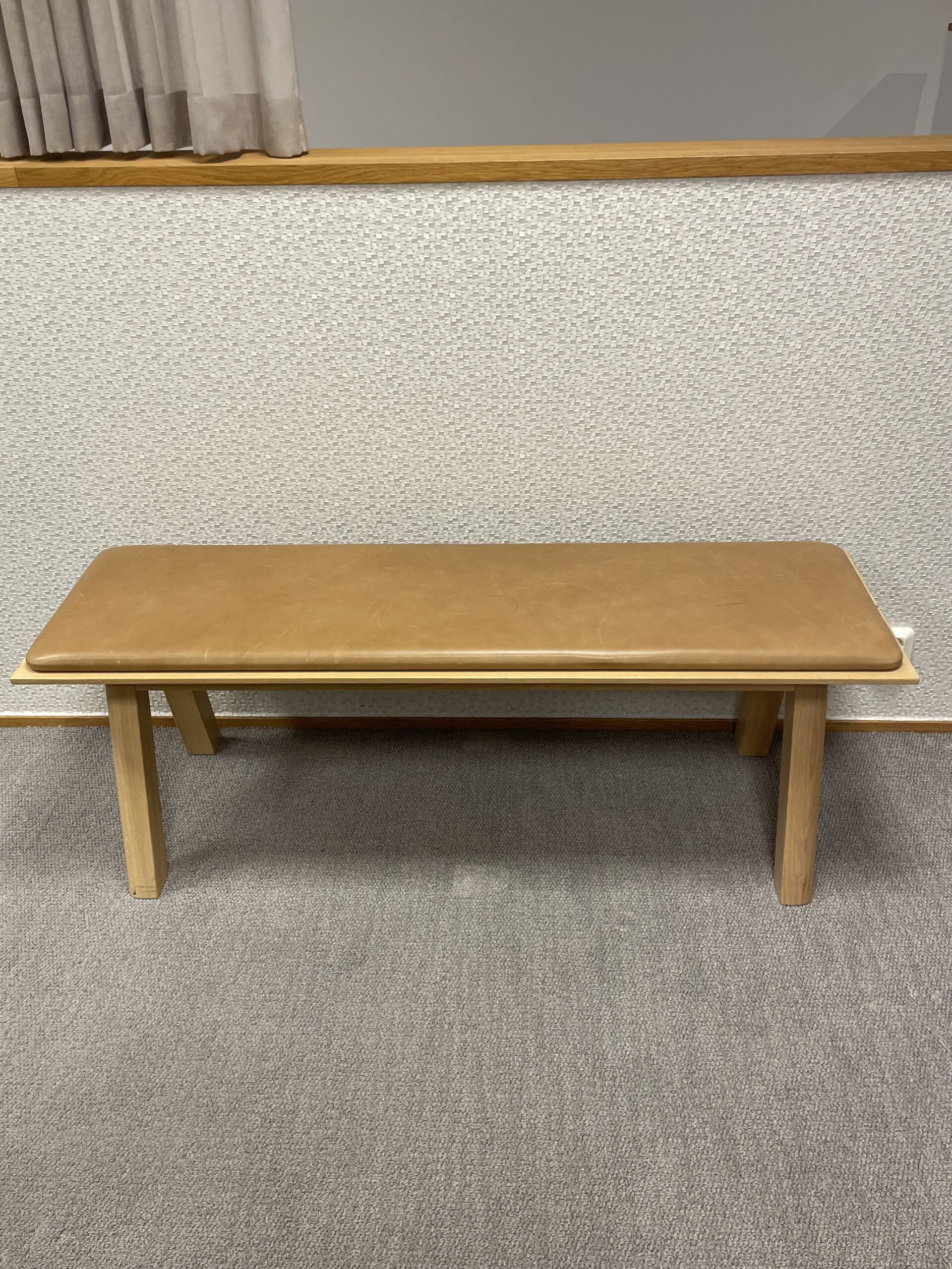 Sits i läder (brun). Ben i trä (ek).