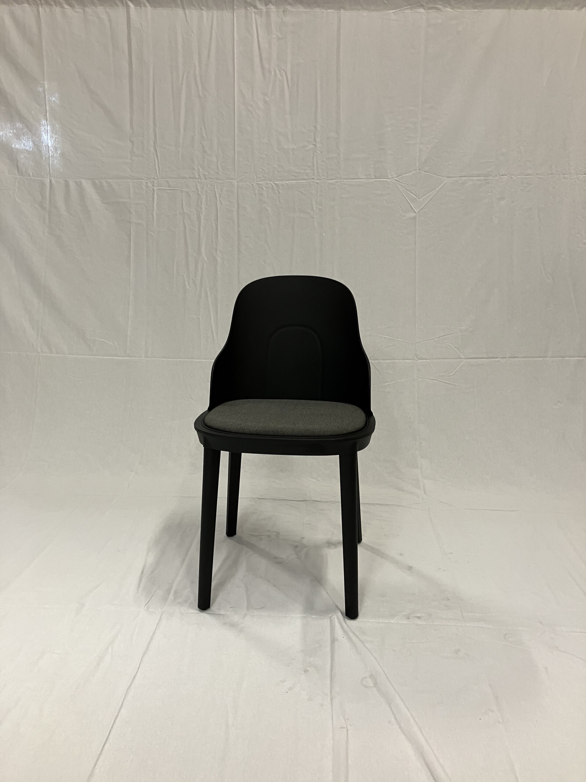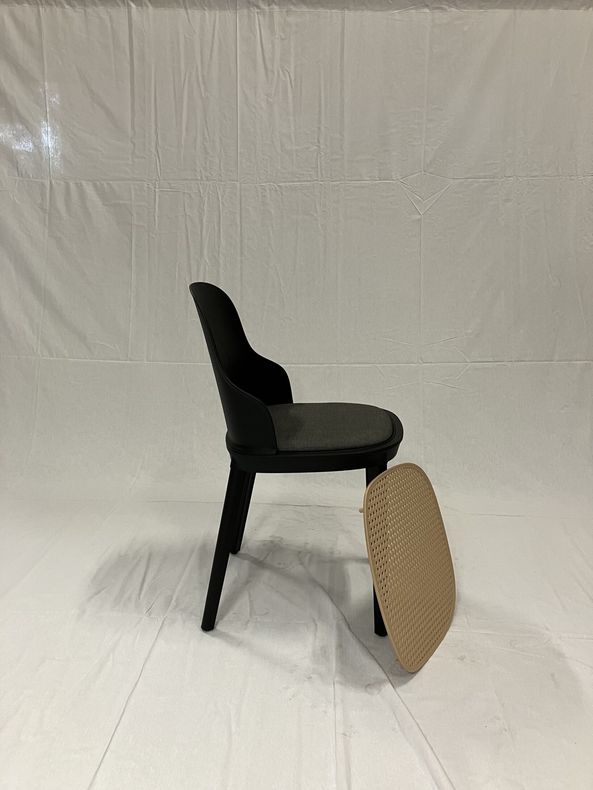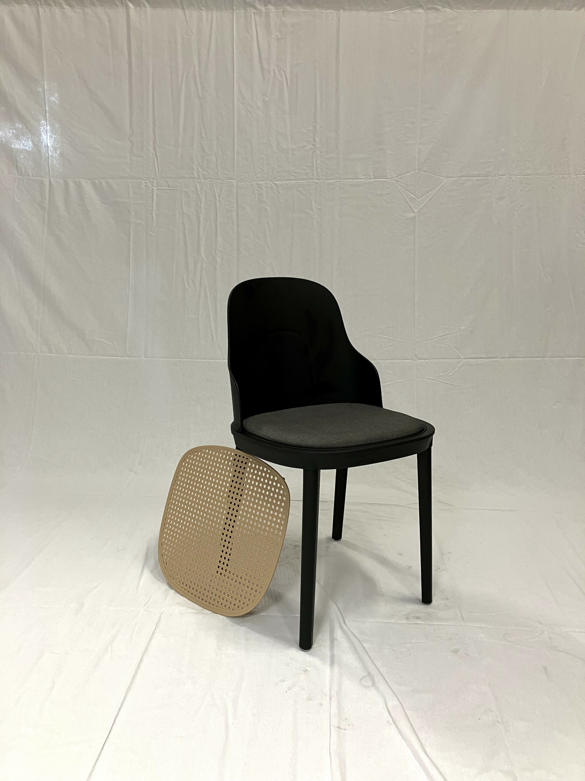 Sits i tyg (svart). Rygg i plast (svart). Ben i plast (svart).