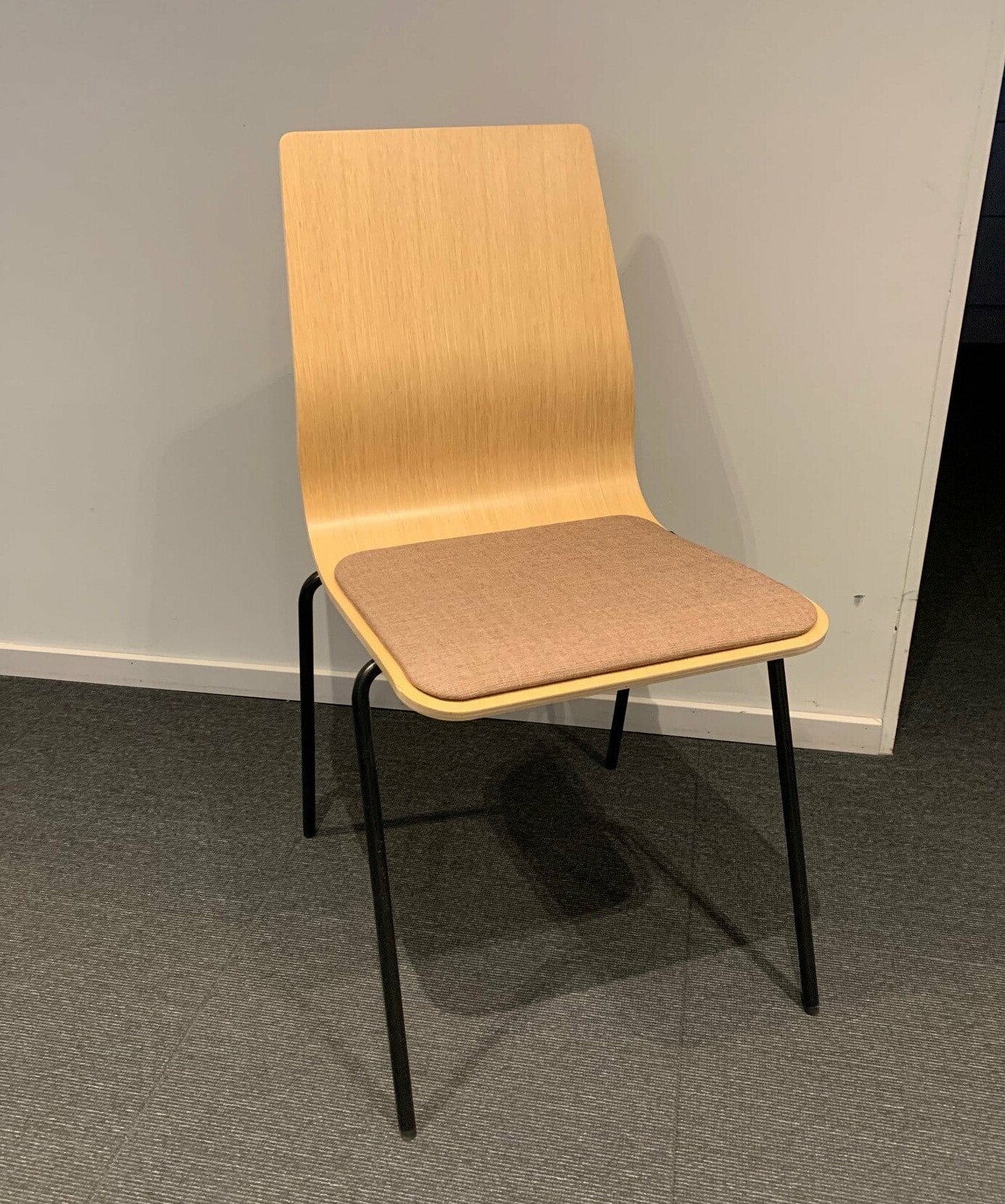 Sits i tyg. Rygg i trä (ek). Ben i metall (svart).