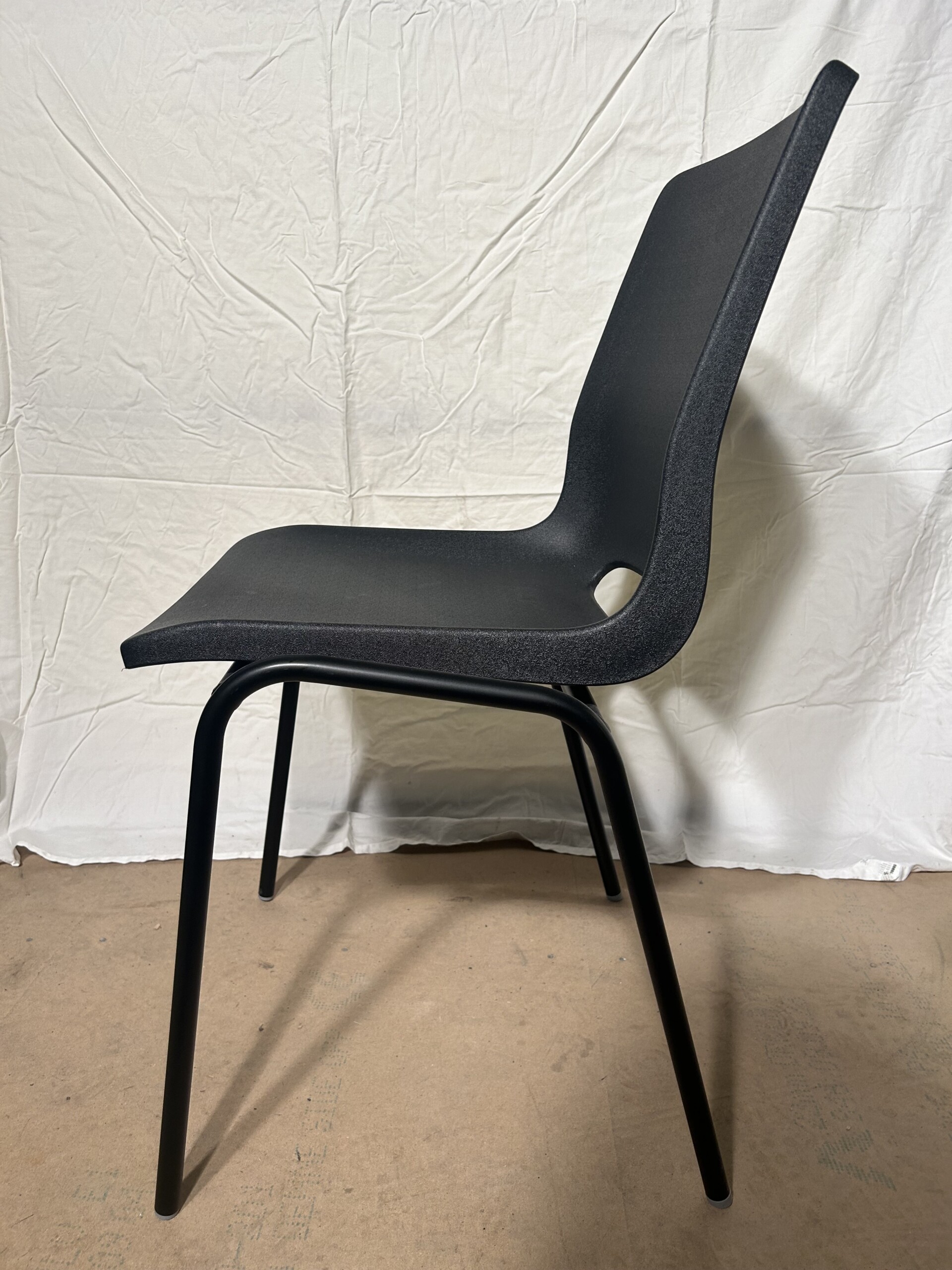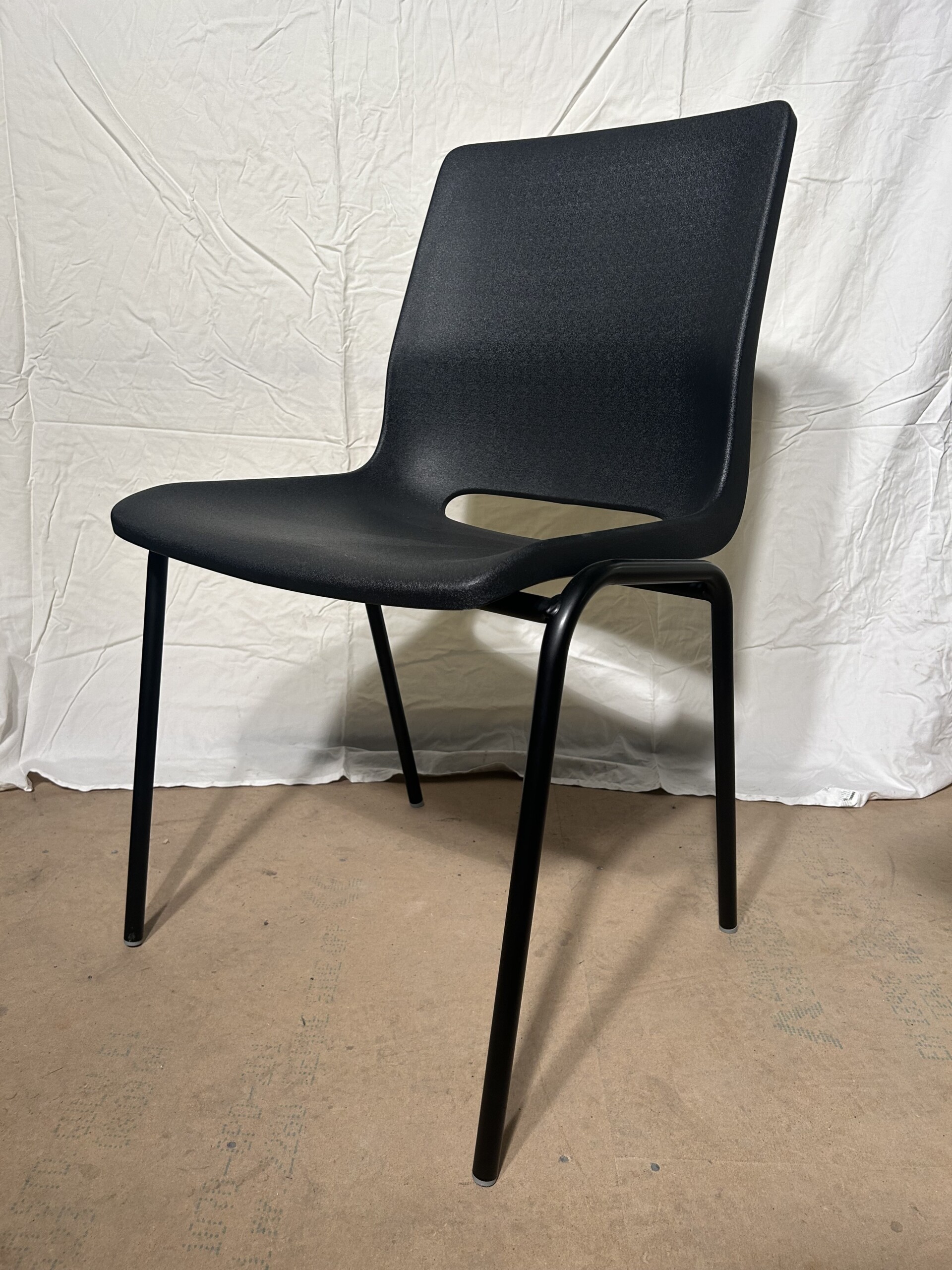 Sits och rygg i plast (svart). Ben i metall (svart).