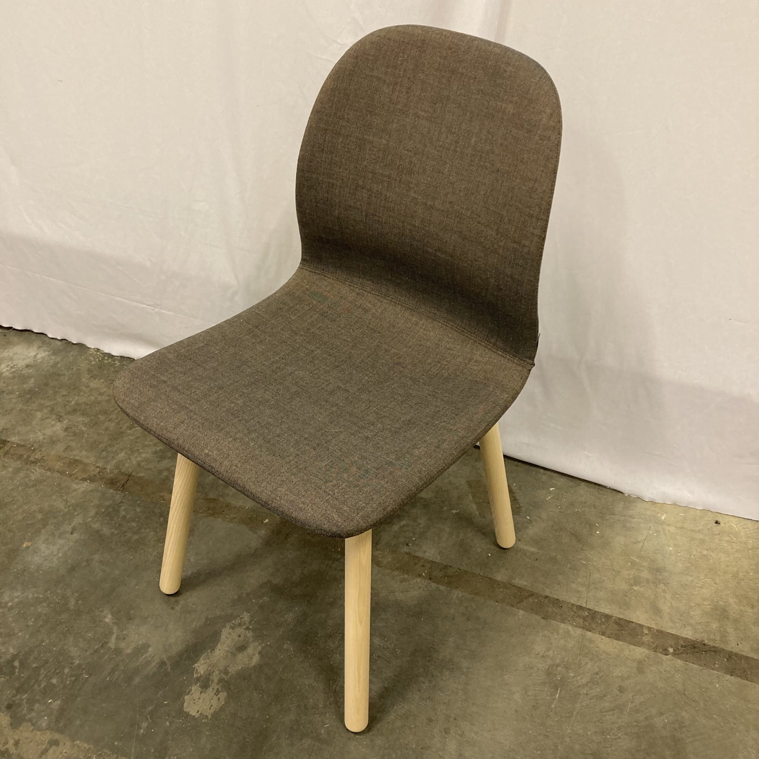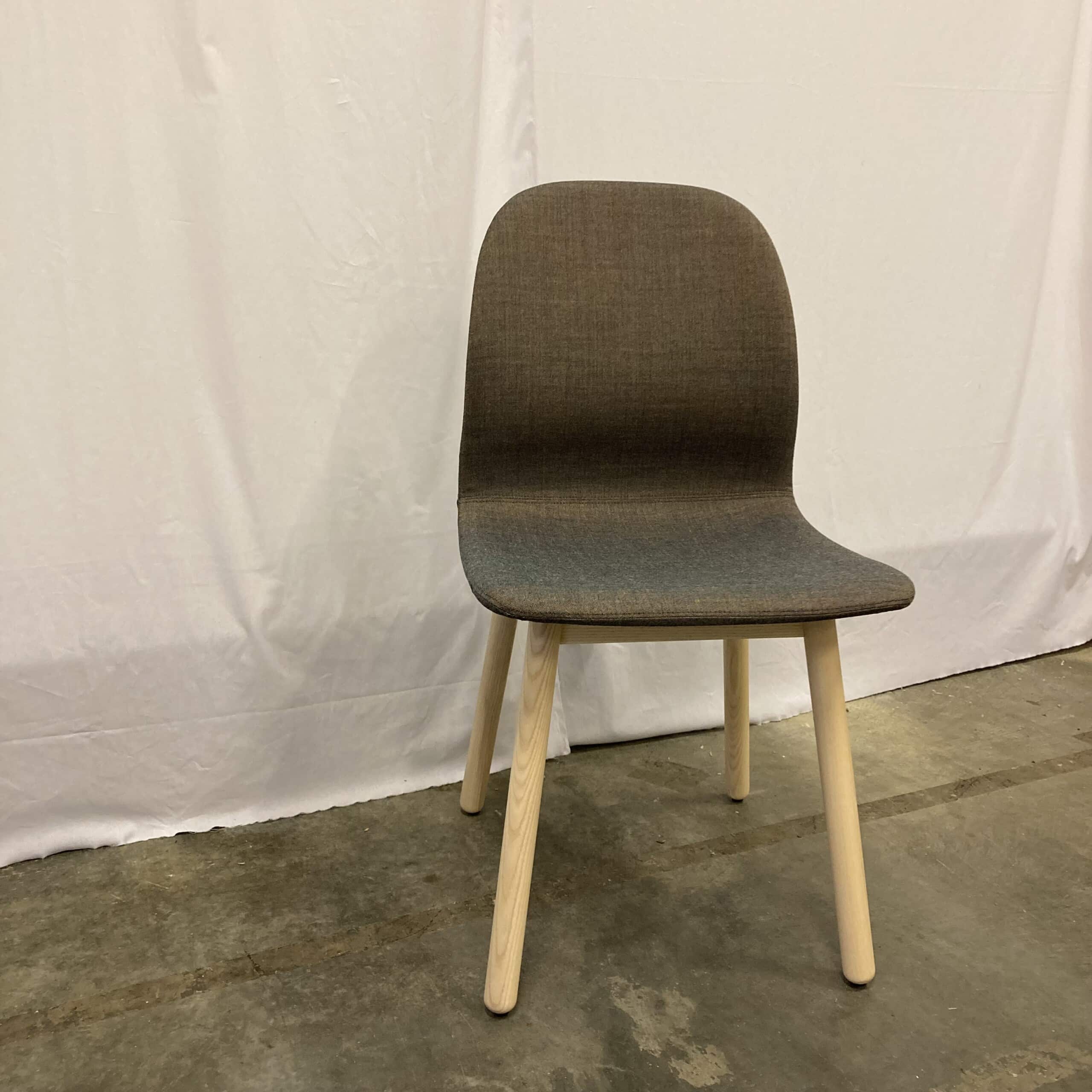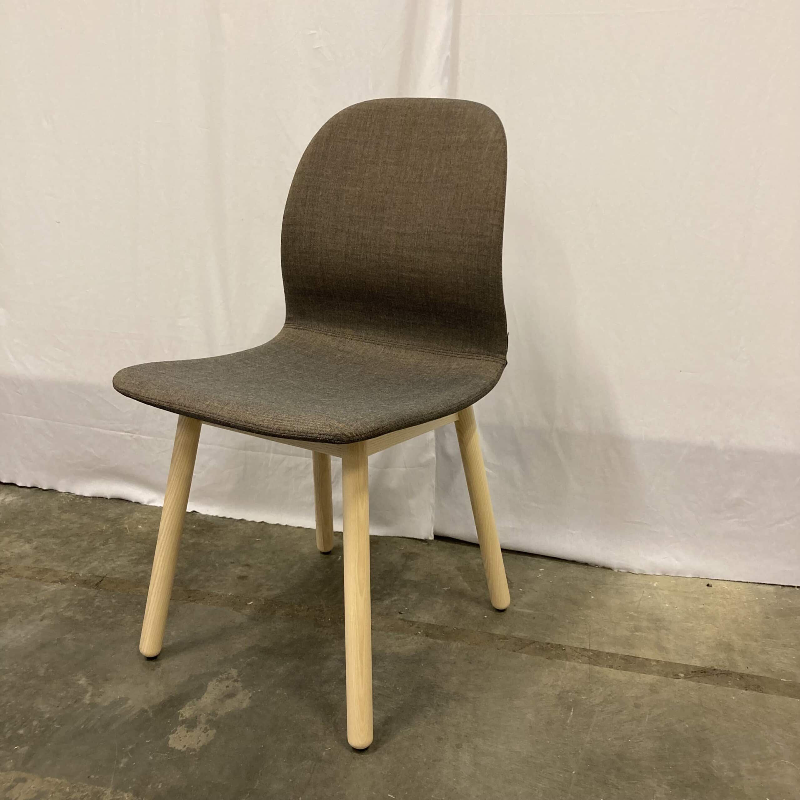 Sits och rygg i tyg (brun). Ben i trä (ask).