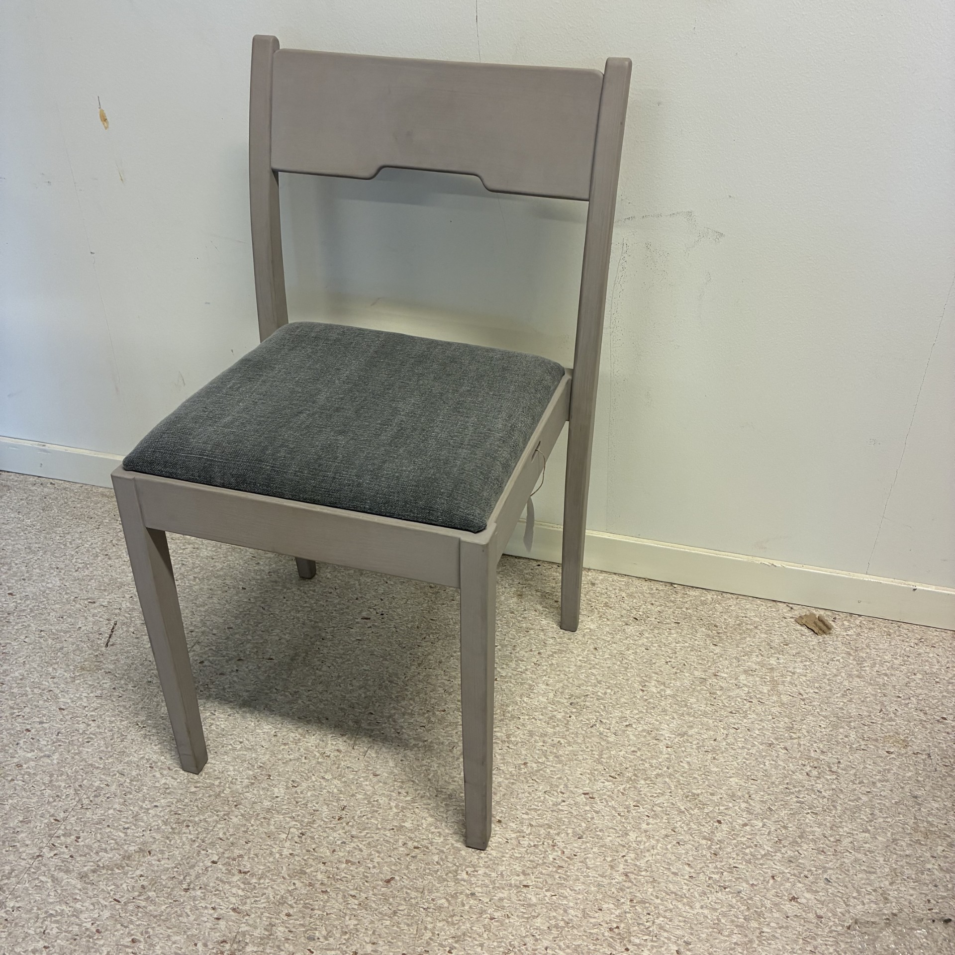 Sits i tyg (grå). Rygg i trä (björk). Ben i trä (björk).