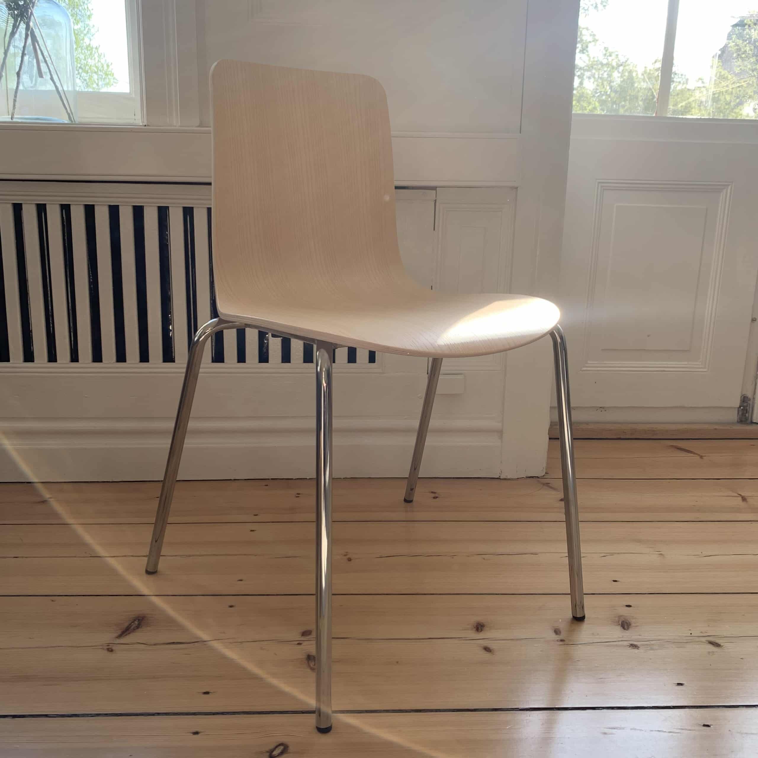 Sits och rygg i trä (ask). Ben i metall (krom).
