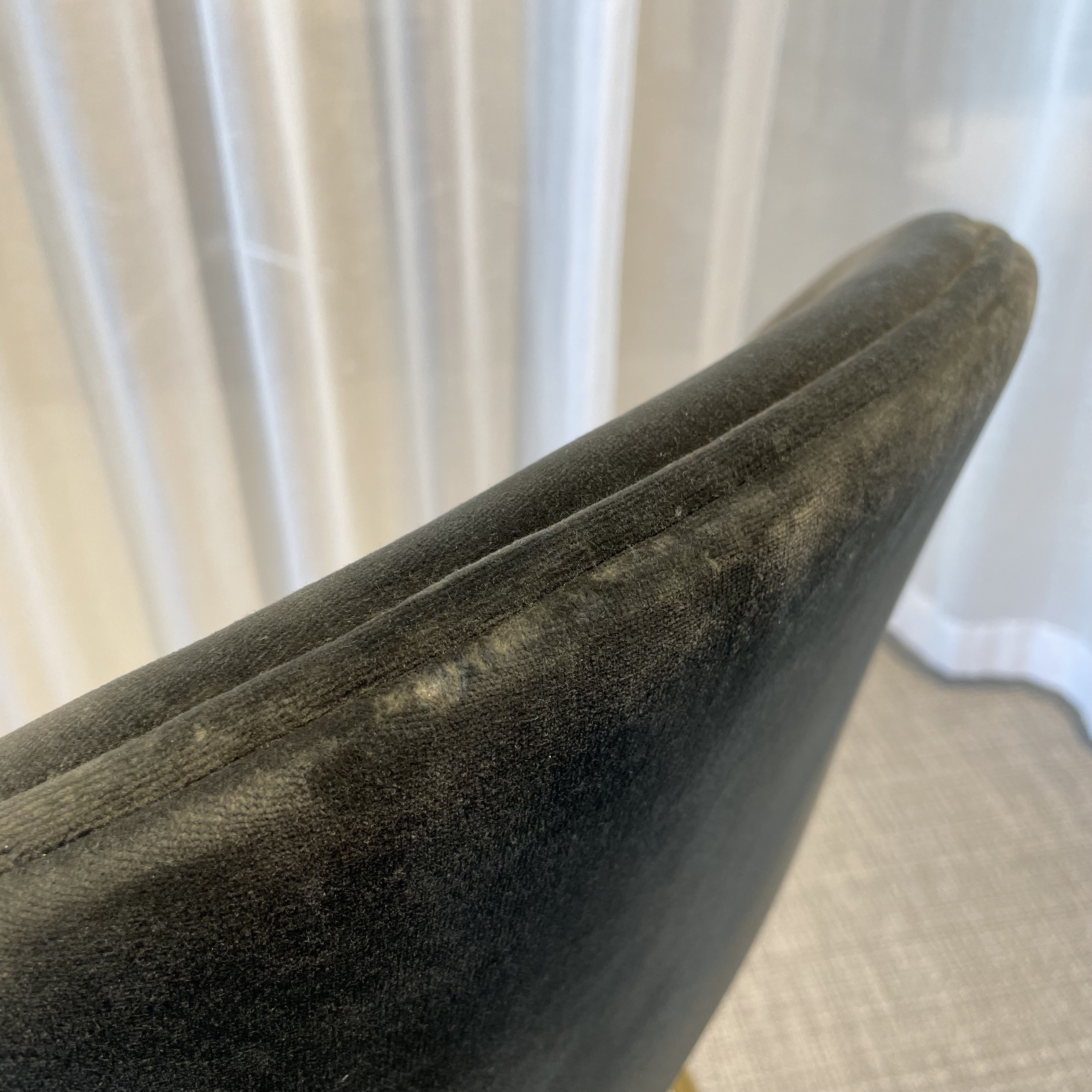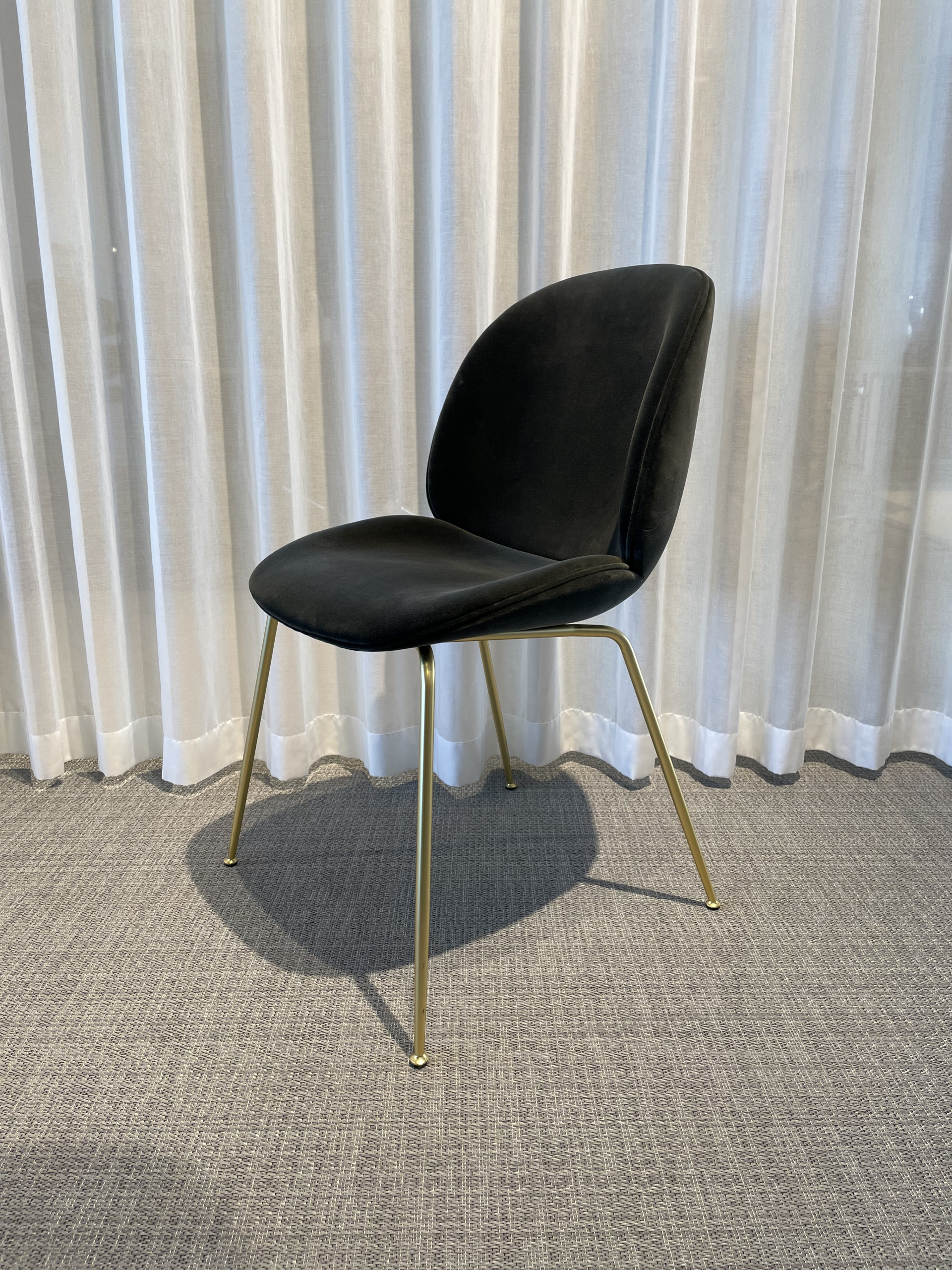 Sits och rygg i tyg (grå). Ben i metall (mässing).